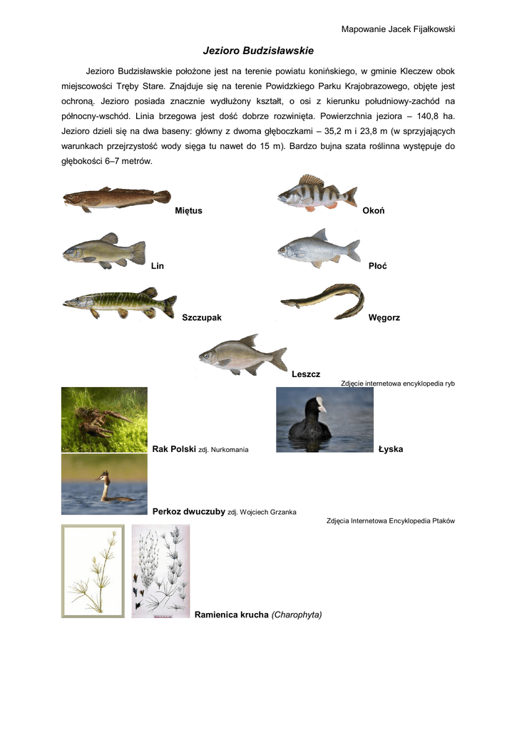 Mapowanie Jacek Fijałkowski Jezioro Budzisławskie Jezioro Budzisławskie położone jest na terenie powiatu konińskiego, w gminie Kleczew obok miejscowości Tręby Stare. Znajduje się na terenie Powidzkiego Parku Krajobrazowego, objęte jest ochroną. Jezioro posiada znacznie wydłużony kształt, o osi z kierunku południowy-zachód na północny-wschód. Linia brzegowa jest dość dobrze rozwinięta. Powierzchnia jeziora – 140,8 ha. Jezioro dzieli się na dwa baseny: główny z dwoma głęboczkami – 35,2 m i 23,8 m (w sprzyjających warunkach przejrzystość wody sięga tu nawet do 15 m). Bardzo bujna szata roślinna występuje do głębokości 6–7 metrów. Miętus Okoń Płoć Lin Węgorz Szczupak Leszcz Zdjęcie internetowa encyklopedia ryb Rak Polski zdj. Nurkomania Łyska Perkoz dwuczuby zdj. Wojciech Grzanka Zdjęcia Internetowa Encyklopedia Ptaków Ramienica krucha (Charophyta) tabliczka mapowania Jezioro Budzisławskie należy do grona najciekawszych jezior Polski. W akwenie tym jest około 20 gatunków ryb. Przepiękne łąki Rumienicy, w której żyje niezliczona ilość ryb przyciąga uwagę każdego kto tylko się tam zanurzy. Poza atrakcjami przygotowanymi przez lokalne Centrum Nurkowe można godzinami śledzić ławice ryb. Jezioro to jest w stanie zaspokoić każdego ciekawskiego. Możemy tam spotkać, co najmniej dwie zaprzyjaźnione rodziny miętusów, jedna bardzo muzykalna upodobała sobie zatopiony fortepian. Druga rodzina chętnie udziela pomocy i wskazuje drogę do „domu” w północno-wschodniej części przy platformie na głębokości 30 metrów. W słoneczne dni możemy zobaczyć większość gatunków ryb pod platformą na 7 metrach na prawo od pomostu. Nocą zaś zobaczymy pełen przekrój tych ryb na powierzchni tej platformy. Nieduża głębokość idealna zieleń oraz odrobina słońca pozwalają wykonać rewelacyjne zdjęcia podwodne. W okolicznych szuwarach możemy zobaczyć wiele gatunków ptaków. Trzeba niestety zwrócić uwagę na przypływające do pomostu łabędzie, bo wystarczy chwila nieuwagi, a pozostawiona kanapka zmienia właściciela. Nie polecana jest też próba odebrania swojej własności, gdyż ptaki te bardzo szybko i zdecydowanie uznają się za nowych właścicieli. 13 m 30´ 10 min Bardzo głęboki muł pokryty miejscowo glonami 120´ 3 min 300´ 10 min 210´ 10 min 9m 120´ 3 min 30´ 10 min 5m Do 9 metra bardzo bogata szata roślinna, głównie „Rumienica krucha” 120´ 3 min 210´ 10 min 3m Linia brzegowa szuwarowa Platforma na 7 metrach Do 9 metra bardzo dużo ryb w wielu gatunkach, niektóre zostały powyżej przedstawione. Pozostałe trzeba samemu wypatrzeć
