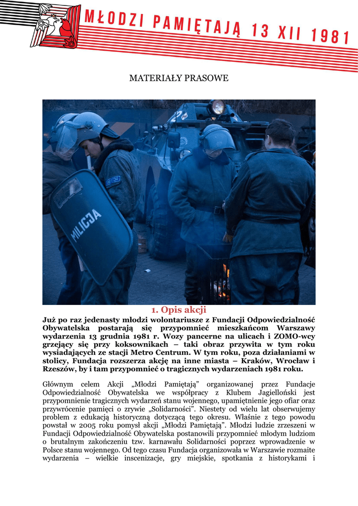MATERIAŁY PRASOWE 1. Opis akcji Już po raz jedenasty młodzi wolontariusze z Fundacji Odpowiedzialność Obywatelska postarają się przypomnieć mieszkańcom Warszawy wydarzenia 13 grudnia 1981 r. Wozy pancerne na ulicach i ZOMO-wcy grzejący się przy koksownikach – taki obraz przywita w tym roku wysiadających ze stacji Metro Centrum. W tym roku, poza działaniami w stolicy, Fundacja rozszerza akcję na inne miasta – Kraków, Wrocław i Rzeszów, by i tam przypomnieć o tragicznych wydarzeniach 1981 roku. Głównym celem Akcji „Młodzi Pamiętają” organizowanej przez Fundacje Odpowiedzialność Obywatelska we współpracy z Klubem Jagielloński jest przypomnienie tragicznych wydarzeń stanu wojennego, upamiętnienie jego ofiar oraz przywrócenie pamięci o zrywie „Solidarności”. Niestety od wielu lat obserwujemy problem z edukacją historyczną dotyczącą tego okresu. Właśnie z tego powodu powstał w 2005 roku pomysł akcji „Młodzi Pamiętają”. Młodzi ludzie zrzeszeni w Fundacji Odpowiedzialność Obywatelska postanowili przypomnieć młodym ludziom o brutalnym zakończeniu tzw. karnawału Solidarności poprzez wprowadzenie w Polsce stanu wojennego. Od tego czasu Fundacja organizowała w Warszawie rozmaite wydarzenia – wielkie inscenizacje, gry miejskie, spotkania z historykami i opozycjonistami. W tym roku poza tradycyjnym już happeningiem na „Patelni”, wolontariusze z FOO rozszerzają zakres projektu o inne miasta. W tym roku w ramach akcji odbędzie się gra miejska „Nieznani bohaterowie stanu wojennego”. Rozpocznie się ona 13 grudnia o 13:12 przy stacji metra Centrum. Docierając do kolejnych punktów, uczestnicy odkrywają specyfikę działalności opozycyjnej, samoorganizacji – swoiste podziemne „społeczeństwo obywatelskie”. Kolejnym elementem akcji jest ogólnopolski konkurs „Poznaj Swoją Historię”, w którym uczniowie szkół ponadgimnazjalnych będą mieli za zadanie stworzenie eseju, reportażu bądź materiału filmowego „Stan wojenny w moim mieście”. Dla zwycięzców przygotowane są cenne nagrody. Równolegle 13 grudnia swoją premierę będzie mieć aplikacja quizu historycznego „Quiztoria”,pozwalająca rzucać sobie nawzajem wyzwania, konkurować i sprawdzać swoją wiedzę historyczną. Specjalnie na okoliczność „Akcji Młodzi Pamiętają” uruchomiona zostanie okolicznościowa kategoria pytań poświęconych stanowi wojennemu i „Solidarności”. 2. Harmonogram Warszawa 13 XII 6:00-21:00 - happening na placu przed stacją metra Centrum (transporter opancerzony, wolontariusze w strojach ZOMO), 13:12-16:00 – gra miejska „Nieznani bohaterowie stanu wojennego” startująca z placu przed stacją metra Centrum, zapisy na miejscu lub u Eweliny Zdziery tel. 508 670 956 16.00 – koncert „Ofiarom stanu wojennego” w kościele św. Anny na Krakowskim Przedmieściu 19:00 – Akcja Młodzi Pamiętają jest partnerem Koncertu z okazji rocznicy 13 grudnia zespołu „Contra Mundum” w PROXIMIE organizowanym przez Fundacje Wolność i Demokracja dzięki bankowi BZ WBK, który jest mecenasem muzycznego projekt Kraków 13 XII 10:00 – 18:00 - patrole ZOMO w okolicach Plant 18:00 – spotkanie z „Krakowska Opozycja Demokratyczna w Stanie Wojennym” w Klubie Jagiellońskim ul. Rynek Główny 34 kontakt Tomasz Synowiec 508 563 960 Wrocław 13 XII 10.00 – 16.00 – patrole ZOMO na terenie Starego Miasta, 16:00 – 19:00 – koncert utworów Jacka Kaczmarskiego oraz pokaz filmów o stanie wojennym w ogrodzie Ossolińskich, na zaułku Ossolińskich koło ul. Szewskiej, kontakt Bartłomiej Matura 509 978 937 Rzeszów 12 XII 22:00 - 3:30 – Nocna gra miejska: V Harcerska Impreza na Orientację "Bieg pamięci '81" kontakt: Kamil Sznajder 530 077 444 3. Dane kontaktowe www.odpowiedzialnosc.org/projekt/mlodzi-pamietaja www.facebook.com/mlodzipamietaja www.odpowiedzialnosc.org Jakub Łasiewicki Rzecznik prasowy akcji Młodzi Pamiętają tel. kom.: 606-680-965 [email protected] Piotr Trudnowski Rzecznik prasowy Klubu Jagiellońskiego Tel. Kom. 505 022 515 [email protected] 4. Organizatorzy Orgnizator Fundacja Odpowiedzialność Obywatelska Współorganizatorzy Klub Jagielloński Partnerzy Instytut Pamięci Narodowej Muzeum Sprzętu Wojskowego w Mrągowie Biuro Edukacji Miasta Stołecznego Warszawy Izba Pamięci Pułkownika Ryszarda Kuklińskiego Inicjatywa Praska Patroni honorowi Minister Sprawiedliwości Prezydent m.st. Warszawy Narodowy Bank Polski Patroni medialni TVP Warszawa Darczyńcy MGM S.A.