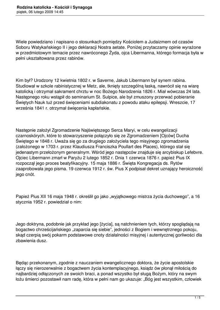 Rodzina katolicka - Kościół i Synagoga piątek, 06 lutego 2009 14:45 Wiele powiedziano i napisano o stosunkach pomiędzy Kościołem a Judaizmem od czasów Soboru Watykańskiego II i jego deklaracji Nostra aetate. Poniżej przytaczamy opinie wyrażone w przedmiotowym temacie przez nawróconego Żyda, ojca Libermanna, którego formacja była w pełni ukształtowana przez rabinów. Kim był? Urodzony 12 kwietnia 1802 r. w Saverne, Jakub Libermann był synem rabina. Studiował w szkole rabinistycznej w Metz, ale, tknięty szczególną łaską, nawrócił się na wiarę katolicką i otrzymał sakrament chrztu w noc Bożego Narodzenia 1826 r. Miał wówczas 24 lata. Następnego roku wstąpił do seminarium St. Sulpice, ale był zmuszony przerwać pobieranie Świętych Nauk tuż przed święceniami subdiakonatu z powodu ataku epilepsji. Wreszcie, 17 września 1841 r. otrzymał święcenia kapłańskie. Następnie założył Zgromadzenie Najświętszego Serca Maryi, w celu ewangelizacji czarnoskórych, które to stowarzyszenie połączyło się ze Zgromadzeniem [Ojców] Ducha Świętego w 1848 r. Uważa się go za drugiego założyciela tego misyjnego zgromadzenia (założonego w 1703 r. przez Klaudiusza Franciszka Poullart des Places), którego stał się jedenastym przełożonym generalnym. Wśród jego następców znajduje się arcybiskup Lefebvre. Ojciec Libermann zmarł w Paryżu 2 lutego 1852 r. Dnia 1 czerwca 1876 r. papież Pius IX rozpoczął jego proces beatyfikacyjny. 15 maja 1886 r. Święta Kongregacja ds. Rytów zaaprobowała jego pisma. 19 czerwca 1912 r. św. Pius X podpisał dekret uznający heroiczność jego cnót. Papież Pius XII 16 maja 1948 r. określił go jako „wyjątkowego mistrza życia duchowego”, a 16 stycznia 1952 r. powiedział o nim: Jego doktryna, podobnie jak przykład jego [życia], są natchnieniem tych, którzy spoglądają na bogactwo chrześcijańskiego „zaparcia się siebie”, jedności z Bogiem i wewnętrznego pokoju, skąd czerpią swój pokarm podstawowe cnoty działalności misyjnej i autentycznej gorliwości dla zbawienia dusz. Będąc przekonanym, zgodnie z nauczaniem ewangelicznego doktora, że życie apostolskie łączy się nierozerwalnie z bogactwem życia kontemplacyjnego, ksiądz ów płonął miłością do najbardziej odłączonych ze swoich braci, a ponad wszystko był sługą Bożym, który na swym łożu śmierci pozostawił nam radę, która w pełni nam go ukazuje: „Bóg jest wszystkim, człowiek 1/5 Rodzina katolicka - Kościół i Synagoga piątek, 06 lutego 2009 14:45 niczym”. Odtąd czcigodny Franciszek Maria Paweł Libermann zawsze czekał na opinie zwolenników tezy „Człowiek jest wszystkim”. Spośród jego pism, które uznano za wolne od błędów (pisma duchowe, listy duchowe, instrukcje misyjne, rozporządzenia tymczasowe i specjalne, itd.), jedno zasługuje na szczególną uwagę. Mowa o komentarzu do Ewangelii wg św. Jana. Napisane to zostało w Rzymie w 1840 r. na poddaszu, gdzie oczekiwał wyników swych wysiłków zmierzających do założenie swego małego zgromadzenia. Był tylko akolitą (klerykiem posiadającym ostatnie ze święceń „niższych” – przyp. tłum.), wciąż jeszcze przykutym do łóżka ze względu na swoją chorobę, a wszystko, co miał, to był święty tekst. Jego komentarz nie jest kompletny i kończy się na rozdziale 12. W rozdziale 10. czcigodny Sługa Boży zagłębia się nad słowami Naszego Pana dotyczącymi Dobrego Pasterza. W odniesieniu do wersetu 16, poniżej przytaczamy wyjątki z jego komentarza. „Mam także inne owce, które nie są z tej owczarni. I te muszę przyprowadzić i będą słuchać głosu mego, i nastanie jedna owczarnia, jeden pasterz” (J 10, 16). „Owce”, o których mówi tutaj nasz Pan, oznaczają pogan, którzy winni być przyprowadzeni do Jego Owczarni. Oni nie byli jeszcze w Owczarni, ale nasz Boski Pasterz mówi, iż musi je przyprowadzić do Owczarni. „Które nie są z tej owczarni” mówi nasz Pan, czyli „spoza tej owczarni” tzn. Synagogi, która jeszcze wówczas była tą owczarnią, gdzie należało szukać owiec. Poganie nie należeli do Synagogi: byli spoza owczarni. I nie tylko byli oni spoza owczarni, ale nigdy do niej nie należeli. W starym Kościele, ograniczonym do Synagogi, nie było, mówiąc ogólnie, owiec, które do niej nie należały, lub które przynajmniej się z nią nie połączyły. Ale nasz Pan, pragnąc ustanowić owczarnię uniwersalną, powołuje wszystkich pogan i ustanawia inną owczarnię, która, to prawda, bierze swe początki z tej pierwszej, ale istnieje sama z siebie, nie będąc uzależniona od tej pierwszej. Z kolei pierwsza i druga tworzą razem tylko jedną i tę samą owczarnię, kierowaną i rządzoną przez jednego i tego samego Pasterza. Pierwsza owczarnia, która była zbyt mała, aby pomieścić tak wiele owiec, została zniszczona. Uniwersalność całego stada została zjednoczona w owczarni założonej przez samego Boskiego Pasterza, [owczarni] zdolnej pomieścić i nakarmić to nowe stado. 2/5 Rodzina katolicka - Kościół i Synagoga piątek, 06 lutego 2009 14:45 Nasz Pan mówi: „które nie są z tej owczarni”, ponieważ nowa owczarnia nie była tą samą, ale znacznie bardziej doskonałą, niż ta pierwsza, i utworzona poza tą pierwszą. Podobnie jak wszystkie owce z pierwszej owczarni, które winny wejść do tej drugiej, wielki Pasterz ma jeszcze inne, które nie były z tej pierwszej owczarni, ale które, mimo wszystko, winny wejść do nowej owczarni, którą miał On utworzyć. (...) W czasie gdy przemawiał sam nasz Pan, one [nowe owce] nie słyszały Jego głosu, ponieważ nie nadszedł jeszcze odpowiedni czas. Gdy nadejdzie czas wskazany przez Jego Ojca, i gdy je przywoła, usłyszą Jego głos. One będą pełne wiary i pobiegną z radością. Tak więc, nasz Boski Mistrz przepowiada wielki zapał i entuzjazm z jakim poganie, którzy byli dani chwalebnemu Pasterzo