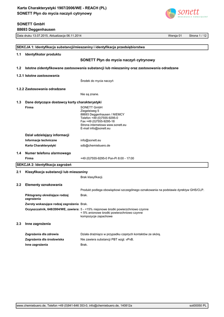 Karta charakterystyki SONETT_Płyn do mycia naczyń