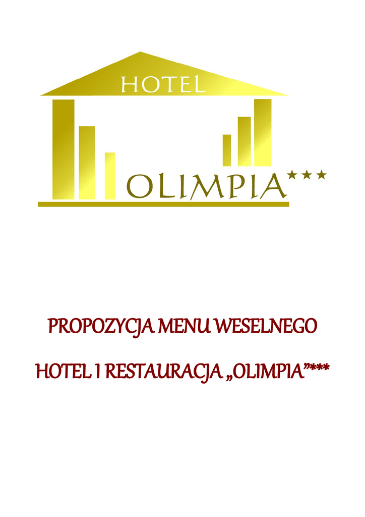 PROPOZYCJA MENU WESELNEGO HOTEL I RESTAURACJA „OLIMPIA”*** OBIAD: Rosół z makaronem Rolada wołowa Rolada wieprzowa Udko z gęsi Kotlet po szwajcarsku Filet z kurczaka z łososiem wędzonym Kotlet de volaile Polędwiczki wp z suszonymi pomidorami i serem feta Kluski czarne, białe Kapusta czerwona gotowana Surówka z kapusty białej Surówka z marchewki z ananasem Sałatka z brokułów Surówka z selera z orzechami Ziemniaczki DESER: Tort weselny Lody w pucharku Owoce NAPOJE: Kawa, herbata Soki, napoje gazowane (1,5 l/os.) Woda stołowa ZIMNA PŁYTA: Półmisek wędlin, półmisek serów Polędwiczki pawie oko Schab po sztygarsku Pieczeń wołowa z nadzieniem grzybowym Galantyna z kurczaka Tatar z łososia Befsztyk tatarski Tymbalik drobiowy Sandacz pod auszpikiem Matiasy śledziowe w śmietanie Boczek w ziołach Sałatki: grecka, nicejska, tortelini, serowa, sałatka z krewetkami sosie jogurtowym Pieczywo, masło KOLACJA: Filet z kurczaka zapiekany z brokułami i serem Golonka pieczone Sakwy wieprzowe z pikantnym nadzieniem Udko z kurczaka Frytki, księżyce ziemniaczane Ryż z warzywami Kapusta zasmażana Bukiet warzyw z wody Surówka z kapusty pekińskiej KOLACJA 2: Barszcz z krokietem Bogracz Pieczywo CENA 180,00 złotych/osobę