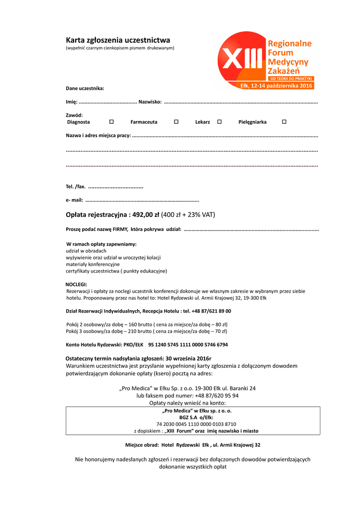 Karta zgłoszenia uczestnictwa (wypełnić czarnym cienkopisem pismem drukowanym) Dane uczestnika: Imię: ........................................ Nazwisko: ......................................................................................................... Zawód: Diagnosta Farmaceuta Lekarz Pielęgniarka Nazwa i adres miejsca pracy: ............................................................................................................................... ........................................................................................................................................................... ........................................................................................................................................................... Tel. /fax. .................................. e- mail: …................................………………………………………... Opłata rejestracyjna : 492,00 zł (400 zł + 23% VAT) Proszę podać nazwę FIRMY, która pokrywa udział: ……………………………………....................................................... W ramach opłaty zapewniamy: udział w obradach wyżywienie oraz udział w uroczystej kolacji materiały konferencyjne certyfikaty uczestnictwa ( punkty edukacyjne) NOCLEGI: Rezerwacji i opłaty za noclegi uczestnik konferencji dokonuje we własnym zakresie w wybranym przez siebie hotelu. Proponowany przez nas hotel to: Hotel Rydzewski ul. Armii Krajowej 32, 19-300 Ełk Dział Rezerwacji Indywidualnych, Recepcja Hotelu : tel. +48 87/621 89 00 Pokój 2 osobowy/za dobę – 160 brutto ( cena za miejsce/za dobę – 80 zł) Pokój 3 osobowy/za dobę – 210 brutto ( cena za miejsce/za dobę – 70 zł) Konto Hotelu Rydzewski: PKO/EŁK 95 1240 5745 1111 0000 5746 6794 Ostateczny termin nadsyłania zgłoszeń: 30 września 2016r Warunkiem uczestnictwa jest przysłanie wypełnionej karty zgłoszenia z dołączonym dowodem potwierdzającym dokonanie opłaty (ksero) pocztą na adres: „Pro Medica” w Ełku Sp. z o.o. 19-300 Ełk ul. Baranki 24 lub faksem pod numer: +48 87/620 95 94 Opłaty należy wnieść na konto: „Pro Medica” w Ełku sp. z o. o. BGZ S.A o/Ełk: 74 2030 0045 1110 0000 0103 8710 z dopiskiem : „XIII Forum” oraz imię nazwisko i miasto Miejsce obrad: Hotel Rydzewski Ełk , ul. Armii Krajowej 32 Nie honorujemy nadesłanych zgłoszeń i rezerwacji bez dołączonych dowodów potwierdzających dokonanie wszystkich opłat DANE DO FAKTURY VAT: Nazwa odbiorcy faktury VAT: ……………………………………………………………………………………… NIP instytucji :…………………………………………………………………………………………………………. Ulica:……………………………………………………………………………………………………………………… Kod pocztowy:…………………………………………………………………………………………………………. Miasto:…………………………………………………………………………………………………………………. Oświadczam, że jesteśmy upoważnieni do otrzymywania faktur VAT bez naszego podpisu. Przyjmuję, że faktury VAT będą wystawiane na te osoby lub firmy, z których rachunków bankowych dokonano przelewu na rachunek organizatora zgodnie z wyciągiem bankowym. Faktury VAT będą wystawiane na dane osoby/firmy, z której konta został dokonany przelew (zgodnie wyciągiem bankowym), przy czym faktury na osoby prywatne będą wystawiane tylko po pisemnym zgłoszeniu w formularzu zgłoszenia. Przesłanie karty zgłoszenia stanowi prawne wiążące zobowiązanie do uczestnictwa w szkoleniu na warunkach w niej określonych. REZYGNACJA: W przypadku rezygnacji z udziału w Konferencji, potrącona będzie opłata w wysokości 15% wpisowego. W przypadku rezygnacji w terminie krótszym niż 2 tygodnie do rozpoczęcia Konferencji, koszty uczestnictwa nie będą zwracane. O rezygnacji prosimy poinformować telefonicznie: +48 87/620 95 94, +48 87/620 95 09 ( Tadeusz Gadomski, Anna Zawadzka) Istnieje możliwość zwolnienia z opłaty VAT: 1.lekarzy czynnie wykonujących zawód 2.osób, za które dokonuje płatności instytucja finansowana co najmniej w 70% ze środków budżetu państwa. Faktury zwolnione z podatku VAT będą wystawiane wyłącznie po otrzymaniu pisemnego oświadczenia. Prosimy o pobranie jednego z wzorów oświadczenia, wypełnienie i odesłanie na numer faksu +48 87/620 95 94. Wzory oświadczeń dostępne są na: http://www.promedica.elk.com.pl/konferencje W przypadku nie dostarczenia oświadczenia lub gdy nie obejmuje Państwa zwolnienie faktura VAT będzie wystawiona na kwotę zawierającą podatek VAT. Podpis: .................................................................................................. Kontakt w sprawach organizacyjnych: Tadeusz Gadomski, Anna Zawadzka [email protected] tel. +48 87/620 95 94, +48 87/620 95 09 Szczegółowe informacje oraz druki dostępne są na stronie: http://www.promedica.elk.com.pl/konferencje