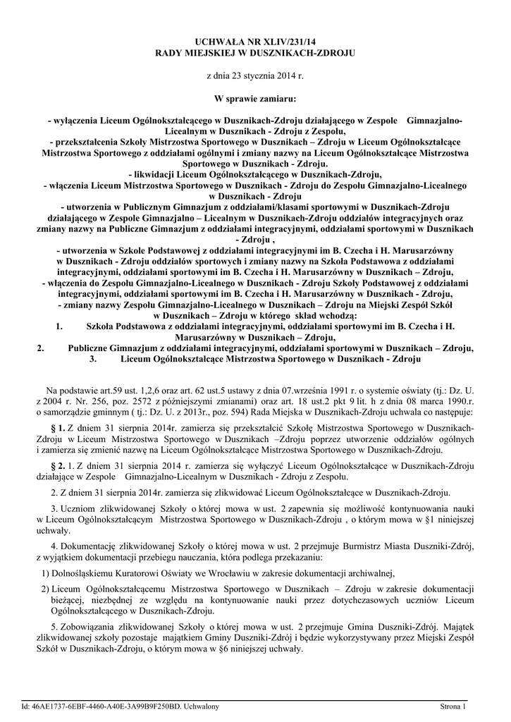 UCHWAŁA NR XLIV/231/14 RADY MIEJSKIEJ W DUSZNIKACH-ZDROJU z dnia 23 stycznia 2014 r. W sprawie zamiaru: - wyłączenia Liceum Ogólnokształcącego w Dusznikach-Zdroju działającego w Zespole GimnazjalnoLicealnym w Dusznikach - Zdroju z Zespołu, - przekształcenia Szkoły Mistrzostwa Sportowego w Dusznikach – Zdroju w Liceum Ogólnokształcące Mistrzostwa Sportowego z oddziałami ogólnymi i zmiany nazwy na Liceum Ogólnokształcące Mistrzostwa Sportowego w Dusznikach - Zdroju. - likwidacji Liceum Ogólnokształcącego w Dusznikach-Zdroju, - włączenia Liceum Mistrzostwa Sportowego w Dusznikach - Zdroju do Zespołu Gimnazjalno-Licealnego w Dusznikach - Zdroju - utworzenia w Publicznym Gimnazjum z oddziałami/klasami sportowymi w Dusznikach-Zdroju działającego w Zespole Gimnazjalno – Licealnym w Dusznikach-Zdroju oddziałów integracyjnych oraz zmiany nazwy na Publiczne Gimnazjum z oddziałami integracyjnymi, oddziałami sportowymi w Dusznikach - Zdroju , - utworzenia w Szkole Podstawowej z oddziałami integracyjnymi im B. Czecha i H. Marusarzówny w Dusznikach - Zdroju oddziałów sportowych i zmiany nazwy na Szkoła Podstawowa z oddziałami integracyjnymi, oddziałami sportowymi im B. Czecha i H. Marusarzówny w Dusznikach – Zdroju, - włączenia do Zespołu Gimnazjalno-Licealnego w Dusznikach - Zdroju Szkoły Podstawowej z oddziałami integracyjnymi, oddziałami sportowymi im B. Czecha i H. Marusarzówny w Dusznikach - Zdroju, - zmiany nazwy Zespołu Gimnazjalno-Licealnego w Dusznikach – Zdroju na Miejski Zespół Szkół w Dusznikach – Zdroju w którego skład wchodzą: 1. Szkoła Podstawowa z oddziałami integracyjnymi, oddziałami sportowymi im B. Czecha i H. Marusarzówny w Dusznikach – Zdroju, 2. Publiczne Gimnazjum z oddziałami integracyjnymi, oddziałami sportowymi w Dusznikach – Zdroju, 3. Liceum Ogólnokształcące Mistrzostwa Sportowego w Dusznikach - Zdroju Na podstawie art.59 ust. 1,2,6 oraz art. 62 ust.5 ustawy z dnia 07.września 1991 r. o systemie oświaty (tj.: Dz. U. z 2004 r. Nr. 256, poz. 2572 z późniejszymi zmianami) oraz art. 18 ust.2 pkt 9 lit. h z dnia 08 marca 1990.r. o samorządzie gminnym ( tj.: Dz. U. z 2013r., poz. 594) Rada Miejska w Dusznikach-Zdroju uchwala co następuje: § 1. Z dniem 31 sierpnia 2014r. zamierza się przekształcić Szkołę Mistrzostwa Sportowego w DusznikachZdroju w Liceum Mistrzostwa Sportowego w Dusznikach –Zdroju poprzez utworzenie oddziałów ogólnych i zamierza się zmienić nazwę na Liceum Ogólnokształcące Mistrzostwa Sportowego w Dusznikach-Zdroju. § 2. 1. Z dniem 31 sierpnia 2014 r. zamierza się wyłączyć Liceum Ogólnokształcące w Dusznikach-Zdroju działające w Zespole Gimnazjalno-Licealnym w Dusznikach - Zdroju z Zespołu. 2. Z dniem 31 sierpnia 2014r. zamierza się zlikwidować Liceum Ogólnokształcące w Dusznikach-Zdroju. 3. Uczniom zlikwidowanej Szkoły o której mowa w ust. 2 zapewnia się możliwość kontynuowania nauki w Liceum Ogólnokształcącym Mistrzostwa Sportowego w Dusznikach-Zdroju , o którym mowa w §1 niniejszej uchwały. 4. Dokumentację zlikwidowanej Szkoły o której mowa w ust. 2 przejmuje Burmistrz Miasta Duszniki-Zdrój, z wyjątkiem dokumentacji przebiegu nauczania, która podlega przekazaniu: 1) Dolnośląskiemu Kuratorowi Oświaty we Wrocławiu w zakresie dokumentacji archiwalnej, 2) Liceum Ogólnokształcącemu Mistrzostwa Sportowego w Dusznikach – Zdroju w zakresie dokumentacji bieżącej, niezbędnej ze względu na kontynuowanie nauki przez dotychczasowych uczniów Liceum Ogólnokształcącego w Dusznikach-Zdroju. 5. Zobowiązania zlikwidowanej Szkoły o której mowa w ust. 2 przejmuje Gmina Duszniki-Zdrój. Majątek zlikwidowanej szkoły pozostaje majątkiem Gminy Duszniki-Zdrój i będzie wykorzystywany przez Miejski Zespół Szkół w Dusznikach-Zdroju, o którym mowa w §6 niniejszej uchwały. Id: 46AE1737-6EBF-4460-A40E-3A99B9F250BD. Uchwalony Strona 1 § 3. Z dniem 01 września 2014 r. w Publicznym Gimnazjum z oddziałami/klasami sportowymi w DusznikachZdroju zamierza się utworzyć oddziały integracyjne i zamierza się zmienić nazwę na Publiczne Gimnazjum z oddziałami integracyjnymi, oddziałami sportowymi w Dusznikach - Zdroju. § 4. Z dniem 01 września 2014 r. w Szkole Podstawowej z Oddziałami Integracyjnymi im B. Czecha i H. Marusarzówny w Dusznikach-Zdroju zamierza się stworzyć oddziały sportowe i zamierza się zmienić nazwę na Szkoła Podstawowa z oddziałami integracyjnymi, oddziałami sportowymi im B. Czecha i H. Marusarzówny w Dusznikach – Zdroju. § 5. Z dniem 01 września 2014r. do Zespołu Gimnazjalno – Licealnego w Dusznikach – Zdroju zamierza się włączyć Szkołę Podstawową z oddziałami integracyjnymi, oddziałami sportowymi im B. Czecha i H. Marusarzówny w Dusznikach – Zdroju. § 6. 1. Z dniem 01 września 2014r. zamierza się zmienić nazwę Zespołu Gimnazjalno – Licealnego w Dusznikach – Zdroju na Miejski Zespół Szkół w Dusznikach – Zdroju. 2. W skład Miejskiego Zespołu Szkół w Dusznikach – Zdroju wchodzą następujące szkoły: 1) Szkoła Podstawowa z oddziałami integracyjnymi, oddziałami sportowymi im B. Czecha i H. Marusarzówny w Dusznikach – Zdroju, 2) Publiczne Gimnazjum z oddziałami integracyjnymi, oddziałami sportowymi w Dusznikach – Zdroju, 3) Liceum Ogólnokształcące Mistrzostwa Sportowego w Dusznikach – Zdroju. 3. Siedziba Miejskiego Zespołu Szkół w Dusznikach – Zdroju znajduje się przy ul. Wybickiego 2a w Dusznikach – Zdroju. 4. Miejski Zespół Szkół w Dusznikach – Zdroju będzie dysponować następującymi budynkami: 1) Budynek przy ul. Wybickiego 2a, 2) Budynek przy ul. Sprzymierzonych 6, 3) Budynek przy ul. Sprzymierzonych 6a, 4) Budynek przy ul. Sportowej 6. § 7. Połączenie szkół o których mowa w §6 pkt 2 w Miejski Zespół Szkół w Dusznikach - Zdroju nie narusza odrębności Rad Pedagogicznych, Rad Szkół i Rad Rodziców oraz Samorzą