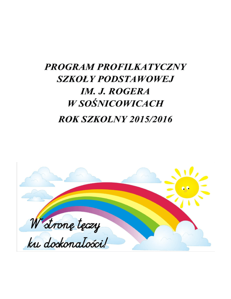 PROGRAM PROFILKATYCZNY SZKOŁY PODSTAWOWEJ IM. J. ROGERA W SOŚNICOWICACH ROK SZKOLNY 2015/2016 W stronę tęczy ku doskonałości! Spis treści: I. WSTĘP ............................................................................................................................... 3 II. PODSTAWY PRAWNE ................................................................................................... 5 III. CELE GŁÓWNE PROGRAMU ..................................................................................... 6 IV. ORGANIZACJA ŻYCIA SZKOŁY ............................................................................... 6 V. DZIAŁY PROGRAMU .................................................................................................... 7 VI. DZIAŁANIA SKIEROWANE DO RODZICÓW .......................................................... 8 2 I. WSTĘP Profilaktyka, to działania stwarzające człowiekowi okazję aktywnego gromadzenia różnych doświadczeń, które powodują wzrost jego zdolności do radzenia sobie w trudnych sytuacjach życiowych.1 Programy adresowane do dzieci i młodzieży powinny zawierać działania skierowane na zakwestionowanie niekorzystnych norm, oczekiwań i przekonań, oraz umożliwiające zbudowanie w ich miejsce norm, przekonań i oczekiwań prawdziwych i pozytywnych.2 Celem działań profilaktycznych jest uzupełnianie braków, poruszanie tematów związanych z rozwojem młodego człowieka, ze świadomością własnych potrzeb i uczuć, z problemami w grupie rówieśniczej i z presją.3 Dobry program profilaktyczny to taki, który: pomaga uczniom rozpoznawać sytuacje presji; naucza umiejętności społecznych; pokazuje, że zażywanie narkotyków nie jest normą wśród młodzieży; zawiera informacje dotyczące narkotyków i uzależnienia; jest ciekawy, różnorodny, prowadzony technikami aktywizującymi; angażuje nauczycieli i rodziców; oferuje informacji dla rodziców i nauczycieli. Działania wspomagające program profilaktyczny w szkole: jasne zasady dotyczące używania narkotyków, alkoholu i papierosów przez uczniów; jasne konsekwencje w przypadku stosowania tych środków; stworzenie środowiska w szkol dającego poczucie bezpieczeństwa; jasne zasady i konsekwencje dotyczące agresji, prześladowania czy wymuszania stosowanego przez uczniów silniejszych wobec słabszych; przyjazne nastawienie nauczycieli do uczniów; współ praca z rodzicami i środowiskiem lokalnym; 1 M. Pasek, Narkotyki przy tablicy, Warszawa 2000, s. 3. J. Szymańska, Programy profilaktyczne. Podstawy profesjonalnej psychoprofilaktyki, Warszawa 2002, s. 30. 3 M. Pasek, Narkotyki przy tablicy, Warszawa 2000, s. 5. 2 3 współpraca z lekarzami, psychologami, policją, pracownikami socjalnymi; częste monitorowanie metod nauczania i profilaktyki stosowanych w szkole, sprawdzanie ich skuteczności. Umiejętności, które przydadzą się w profilaktyce: dobry kontakt z ludźmi; umiejętność przyznawania się do własnych błędów czy niewiedzy; umiejętność jasnego wyrażania swoich poglądów; wyobraźnia; empatia; świadomość; świadomość własnych wartości; nieocenianie innych ludzi; umiejętność słuchania; zachęcanie; nagradzanie aktywności uwagą i odpowiednimi słowami; chęć zrozumienia; chęć pomocy. Przed rozpoczęciem profilaktyki: poznaj dobrze świat, potrzeby ludzi, z którymi będziesz pracować; postaw sobie realistyczne cele; zaangażuj w swoje działania jak największą liczbę osób, z którymi styka się młody człowiek; poznaj fakty dotyczące wszystkich problemów dotyczących dzieci i młodzieży; jeśli jesteś nauczycielem zaproś do współpracy psychologów, terapeutę, policjanta. 4 II. PODSTAWY PRAWNE 1. Konstytucja Rzeczypospolitej Polskiej z dnia 2 kwietnia 1997r.; 2. Konwencja o Prawach Dziecka z dnia 20 listopada 1989r.; 3. Ustawa z dnia 7 września 1991r. o systemie oświaty; 4. Ustawa z dnia 19 sierpnia 1994r. o ochronie zdrowia psychicznego; 5. Ustawa z dnia 9 listopada 1995r. o ochronie zdrowia przed następstwami używania tytoniu i wyrobów tytoniowych; 6. Ustawa z dnia 26 października 1982r. o wychowaniu w trzeźwości i przeciwdziałaniu alkoholizmowi; 7. Ustawa z dnia 29 lipca 2005 r. o przeciwdziałaniu narkomanii; 8. Rozporządzenie Ministra Edukacji Narodowej z dnia 21 maja 2001r. w sprawie ramowych statutów publicznego przedszkola oraz publicznych szkół; 9. Rozporządzenie Ministra Edukacji Narodowej z dnia 27 sierpnia 2012r. w sprawie podstawy programowej wychowania przedszkolnego oraz kształcenia ogólnego w poszczególnych typach szkół; 10. Rozporządzenie Ministra Edukacji Narodowej z dnia 30 maja 2014r. zmieniające rozporządzenie w sprawie podstawy programowej wychowania przedszkolnego oraz kształcenia ogólnego w poszczególnych typach szkół; 11. Rozporządzenie Ministra Edukacji Narodowej z dnia 30 kwietnia 2013r. w sprawie zasad udzielania i organizacji pomocy psychologiczno – pedagogicznej w publicznych przedszkolach, szkołach i placówkach; 12. Rozporządzenie Ministra Edukacji Narodowej z dnia 1 lutego 2013r. w sprawie szczegółowych zasad działania publicznych poradni psychologiczno – pedagogicznych, w tym publicznych poradni specjalistycznych; 5 III. CELE GŁÓWNE PROGRAMU Program profilaktyki w szkole podstawowej kierowany jest do uczniów, nauczycieli oraz rodziców i opiekunów. 1. Wspieranie rodziców w procesie wychowania. 2. Przekazywanie rzetelnych informacji na temat poruszanych problemów. 3. Poprawa kontaktów: uczeń - nauczyciel, nauczyciel - rodzic, rodzic - uczeń, uczeń - uczeń. 4. Zapewnienie pomocy wychowawczej, terapeutycznej i psychologicznej. 5. Zapobieganie problemom i patologiom. 6. Promowanie zdrowego stylu życia. 7. Rozwijanie tolerancji i autonomii. 8. Dbałość o rozwój kultury osobistej. 9. Wyposażenie uczniów w umiejętności oraz wiedzę potrzebną w przyszłości. 10. Tworzenie i rozbudowywanie kontaktów interpersonalnych. IV. ORGANIZAC