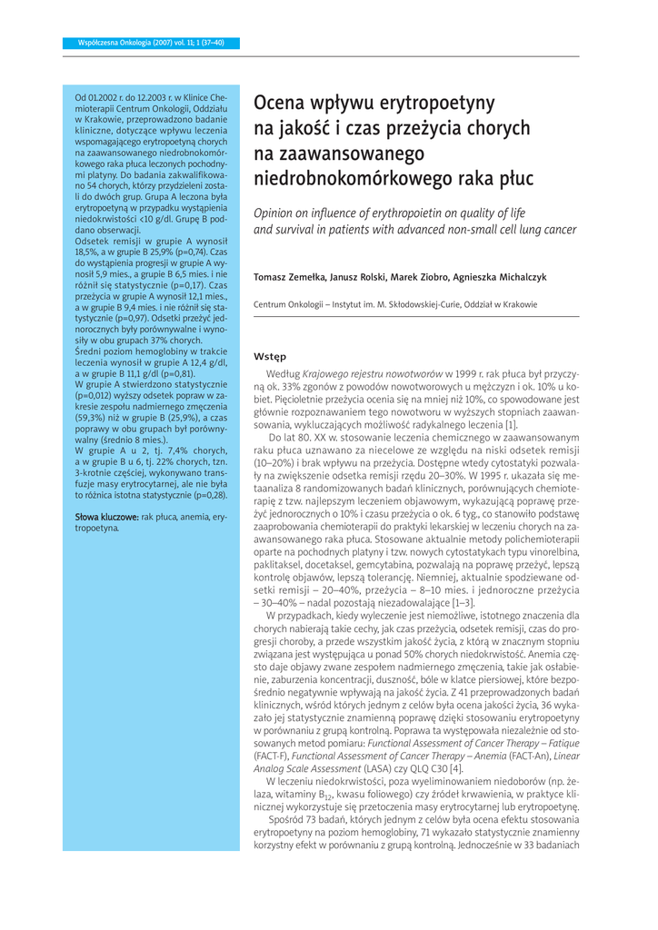 Współczesna Onkologia (2007) vol. 11; 1 (37–40) Od 01.2002 r. do 12.2003 r. w Klinice Chemioterapii Centrum Onkologii, Oddziału w Krakowie, przeprowadzono badanie kliniczne, dotyczące wpływu leczenia wspomagającego erytropoetyną chorych na zaawansowanego niedrobnokomórkowego raka płuca leczonych pochodnymi platyny. Do badania zakwalifikowano 54 chorych, którzy przydzieleni zostali do dwóch grup. Grupa A leczona była erytropoetyną w przypadku wystąpienia niedokrwistości <10 g/dl. Grupę B poddano obserwacji. Odsetek remisji w grupie A wynosił 18,5%, a w grupie B 25,9% (p=0,74). Czas do wystąpienia progresji w grupie A wynosił 5,9 mies., a grupie B 6,5 mies. i nie różnił się statystycznie (p=0,17). Czas przeżycia w grupie A wynosił 12,1 mies., a w grupie B 9,4 mies. i nie różnił się statystycznie (p=0,97). Odsetki przeżyć jednorocznych były porównywalne i wynosiły w obu grupach 37% chorych. Średni poziom hemoglobiny w trakcie leczenia wynosił w grupie A 12,4 g/dl, a w grupie B 11,1 g/dl (p=0,81). W grupie A stwierdzono statystycznie (p=0,012) wyższy odsetek popraw w zakresie zespołu nadmiernego zmęczenia (59,3%) niż w grupie B (25,9%), a czas poprawy w obu grupach był porównywalny (średnio 8 mies.). W grupie A u 2, tj. 7,4% chorych, a w grupie B u 6, tj. 22% chorych, tzn. 3-krotnie częściej, wykonywano transfuzje masy erytrocytarnej, ale nie była to różnica istotna statystycznie (p=0,28). Słowa kluczowe: rak płuca, anemia, erytropoetyna. Ocena wpływu erytropoetyny na jakość i czas przeżycia chorych na zaawansowanego niedrobnokomórkowego raka płuc Opinion on influence of erythropoietin on quality of life and survival in patients with advanced non-small cell lung cancer Tomasz Zemełka, Janusz Rolski, Marek Ziobro, Agnieszka Michalczyk Centrum Onkologii – Instytut im. M. Skłodowskiej-Curie, Oddział w Krakowie Wstęp Według Krajowego rejestru nowotworów w 1999 r. rak płuca był przyczyną ok. 33% zgonów z powodów nowotworowych u mężczyzn i ok. 10% u kobiet. Pięcioletnie przeżycia ocenia się na mniej niż 10%, co spowodowane jest głównie rozpoznawaniem tego nowotworu w wyższych stopniach zaawansowania, wykluczających możliwość radykalnego leczenia [1]. Do lat 80. XX w. stosowanie leczenia chemicznego w zaawansowanym raku płuca uznawano za niecelowe ze względu na niski odsetek remisji (10–20%) i brak wpływu na przeżycia. Dostępne wtedy cytostatyki pozwalały na zwiększenie odsetka remisji rzędu 20–30%. W 1995 r. ukazała się metaanaliza 8 randomizowanych badań klinicznych, porównujących chemioterapię z tzw. najlepszym leczeniem objawowym, wykazującą poprawę przeżyć jednorocznych o 10% i czasu przeżycia o ok. 6 tyg., co stanowiło podstawę zaaprobowania chemioterapii do praktyki lekarskiej w leczeniu chorych na zaawansowanego raka płuca. Stosowane aktualnie metody polichemioterapii oparte na pochodnych platyny i tzw. nowych cytostatykach typu vinorelbina, paklitaksel, docetaksel, gemcytabina, pozwalają na poprawę przeżyć, lepszą kontrolę objawów, lepszą tolerancję. Niemniej, aktualnie spodziewane odsetki remisji – 20–40%, przeżycia – 8–10 mies. i jednoroczne przeżycia – 30–40% – nadal pozostają niezadowalające [1–3]. W przypadkach, kiedy wyleczenie jest niemożliwe, istotnego znaczenia dla chorych nabierają takie cechy, jak czas przeżycia, odsetek remisji, czas do progresji choroby, a przede wszystkim jakość życia, z którą w znacznym stopniu związana jest występująca u ponad 50% chorych niedokrwistość. Anemia często daje objawy zwane zespołem nadmiernego zmęczenia, takie jak osłabienie, zaburzenia koncentracji, duszność, bóle w klatce piersiowej, które bezpośrednio negatywnie wpływają na jakość życia. Z 41 przeprowadzonych badań klinicznych, wśród których jednym z celów była ocena jakości życia, 36 wykazało jej statystycznie znamienną poprawę dzięki stosowaniu erytropoetyny w porównaniu z grupą kontrolną. Poprawa ta występowała niezależnie od stosowanych metod pomiaru: Functional Assessment of Cancer Therapy – Fatique (FACT-F), Functional Assessment of Cancer Therapy – Anemia (FACT-An), Linear Analog Scale Assessment (LASA) czy QLQ C30 [4]. W leczeniu niedokrwistości, poza wyeliminowaniem niedoborów (np. żelaza, witaminy B12, kwasu foliowego) czy źródeł krwawienia, w praktyce klinicznej wykorzystuje się przetoczenia masy erytrocytarnej lub erytropoetynę. Spośród 73 badań, których jednym z celów była ocena efektu stosowania erytropoetyny na poziom hemoglobiny, 71 wykazało statystycznie znamienny korzystny efekt w porównaniu z grupą kontrolną. Jednocześnie w 33 badaniach Współczesna Onkologia (2007) vol. 11; 1 (37–40) In the period from 01.2002 to 12.2003 in the Chemotherapy Clinic of the Oncology Centre in Krakow there was conducted a clinical investigation relating the influence of treatment with erythropoietin on advanced non-small cell lung cancer treated with derivatives of platinum. 54 patients were studied, assigned to two groups. Group A was treated with erythropoietin in the case of anaemia <10 g/dl. Group B was subjected only to observation. The percentage of remission in group A was 18.5% and in group B 25.9% (p=0.74). The time to progression in group A was 5.9 months, and group B 6.5 months and was not statistically different (p=0.17). The time of survival in group A was 12.1 months and in group B 9.4 months and was not statistically different (p=0.97). The percentages of one-year survival were comparable and were in both groups 37% ill. The average level of haemoglobin during treatments was in group A 12.4 g/dl and in group B 11.1 g/dl (p=0.81). In group A there was a statistically significant (p=0.012) higher percentage of improvements in range of complex of excessive fatigue (59.3%) than in group B (25.9%) and the time of improvement in both groups was comparable (the average 8 months
