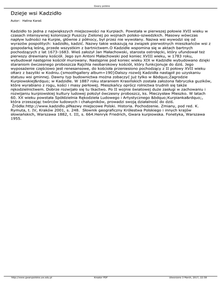 wyrazów pospolitych: kadzidło, kadzić. Nazwy takie wskazują na związek pierwotnych mieszkańców wsi z