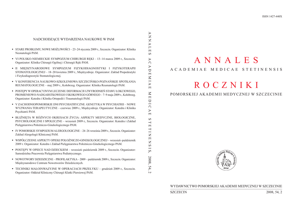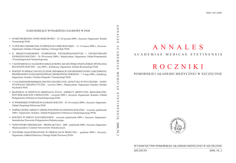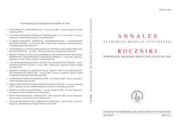 ISSN 1427-440X • STARE PROBLEMY, NOWE MOŻLIWOŚCI – 23–24 stycznia 2009 r., Szczecin. Organizator: Klinika Neonatologii PAM. • VI POLSKO-NIEMIECKIE SYMPOZJUM CHIRURGII RĘKI – 13–14 marca 2009 r., Szczecin. Organizator: Klinika Chirurgii Ogólnej i Chirurgii Ręki PAM. • II MIĘDZYNARODOWE SYMPOZJUM FIZYKODIAGNOSTYKI I FIZYKOTERAPII STOMATOLOGICZNEJ – 18–20 kwietnia 2009 r., Międzyzdroje. Organizator: Zakład Propedeutyki i Fizykodiagnostyki Stomatologicznej. • V KONFERENCJA NAUKOWO-SZKOLENIOWA SZCZECIŃSKO-POZNAŃSKIE SPOTKANIA REUMATOLOGICZNE – maj 2009 r., Kołobrzeg. Organizator: Klinika Reumatologii PAM. • POSTĘPY W OPERACYJNYM LECZENIU DEFORMACJI I ZWYRODNIEŃ STAWU ŁOKCIOWEGO, PROMIENIOWO-NADGARSTKOWEGO I SKOKOWEGO GÓRNEGO – 7–9 maja 2009 r., Kołobrzeg. Organizator: Katedra i Klinika Ortopedii i Traumatologii PAM. • V ZACHODNIOPOMORSKIE DNI PSYCHIATRYCZNE. GENETYKA W PSYCHIATRII – NOWE WYZWANIA TERAPEUTYCZNE – czerwiec 2009 r., Międzyzdroje. Organizator: Katedra i Klinika Psychiatrii PAM. • BLIŹNIĘTA W RÓŻNYCH OKRESACH ŻYCIA: ASPEKTY MEDYCZNE, BIOLOGICZNE, PSYCHOLOGICZNE I SPOŁECZNE – wrzesień 2009 r., Szczecin. Organizator: Katedra i Zakład Pielęgniarstwa Położniczo-Ginekologicznego PAM. • IV POMORSKIE SYMPOZJUM ALERGOLOGICZNE – 24–26 września 2009 r., Szczecin. Organizator: Zakład Alergologii Klinicznej PAM. • WSPÓŁCZESNE ASPEKTY OPIEKI POŁOŻNICZO-GINEKOLOGICZNEJ – wrzesień–październik 2009 r. Organizator: Katedra i Zakład Pielęgniarstwa Położniczo-Ginekologicznego PAM. • POSTĘPY W OPIECE NAD DZIECKIEM – wrzesień–październik 2009 r., Szczecin. Organizator: Samodzielna Pracownia Pielęgniarstwa Pediatrycznego. • NOWOTWORY DZIEDZICZNE – PROFILAKTYKA – 2009 – październik 2009 r., Szczecin. Organizator: Międzynarodowe Centrum Nowotworów Dziedzicznych. • TECHNIKI MAŁOINWAZYJNE W OPERACJACH PRZEŁYKU – grudzień 2009 r., Szczecin. Organizator: Oddział Kliniczny Chirurgii Klatki Piersiowej PAM. A N N A L E S A C A D E M I A E M E D I C A E S T E T I N E N S I S, 2008, 54, 2 NADCHODZĄCE WYDARZENIA NAUKOWE W PAM A N N A L E S ACADEMIAE MEDICAE STETINENSIS ROCZNIKI POMORSKIEJ AKADEMII MEDYCZNEJ W SZCZECINIE WYDAWNICTWO POMORSKIEJ AKADEMII MEDYCZNEJ W SZCZECINIE SZCZECIN 2008, 54, 2 Annales Academiae Medicae Stetinensis – Roczniki Pomorskiej Akademii Medycznej w Szczecinie ukazują się od 1951 roku. Są wydawnictwem naukowym, ciągłym, recenzowanym i cytowanym m.in. w Index Medicus (Medline), Biological Abstract, Chemical Abstract. Dostępne w ponad 150 bibliotekach krajowych i zagranicznych. Do druku przyjmowane są prace oryginalne i poglądowe oraz prezentujące ważną kazuistykę z zakresu nauk podstawowych, klinicznych oraz humanistyki medycznej autorów z Pomorskiej Akademii Medycznej oraz z innych ośrodków w kraju i za granicą. Zamieszczony materiał publikowany jest i będzie według przyjętego schematu wydawniczego, w języku polskim lub angielskim, z krótkimi streszczeniami odpowiednio dla języka polskiego – po angielsku, a dla języka angielskiego – po polsku. Każdy tom obejmuje 3 części stałe: oryginalne prace naukowe o objętości 1–1,5 arkusza wydawniczego, w tym skondensowane rozprawy doktorskie, doniesienia naukowe itp.; kronikę PAM za poprzedni rok wraz z przemówieniem rektora na inauguracji roku akademickiego i spis jednostek naukowo-dydaktycznych oraz bibliografię dorobku piśmienniczego uczelni. Od tomu 50 Roczników PAM zostały wprowadzone zmiany w edycji, które omówiono w regulaminie publikowania prac. REGULAMIN PUBLIKOWANIA PRAC* w Annales Academiae Medicae Stetinensis – Roczniki Pomorskiej Akademii Medycznej Redakcja Annales Academiae Medicae Stetinensis – Roczniki Pomorskiej Akademii Medycznej przyjmuje oryginalne prace naukowe, w trybie ciągłym. Można publikować materiały ze wszystkich dziedzin nauk medycznych, również te, które są zbyt obszerne na zamieszczenie w czasopismach specjalistycznych. Materiał powinien mieć nie więcej niż 20–25 stron maszynopisu formatu A-4, łącznie z rycinami, tabelami, podpisami i piśmiennictwem tylko cytowanym w tym dziele (ograniczonymi do minimum) oraz streszczeniami. Manuskrypt napisany w języku polskim i angielskim, na białym papierze, bez wyróżnień. Zadrukowana może być tylko pierwsza strona kartki, druga pozostaje niezadrukowana (czysta). Używać należy 12-punktowej czcionki, z zachowaniem podwójnego odstępu między wierszami. Strony numerować kolejno, zaczynając od tytułowej. Numery stron umieszczać w dolnym, prawym rogu każdej strony. Zachować kolejność układu: strona tytułowa, tekst podstawowy, materiał ilustracyjny, piśmiennictwo. Strona tytułowa Imię i nazwisko autora (autorów); tytuł pracy w dwóch językach; miejsce uzyskania stopnia naukowego (dotyczy doktoratów) lub pracy autora (nazwa i adres placówki naukowej, tytuł i stopień naukowy jej kierownika); słowa kluczowe w dwóch językach wymienianych w katalogu MeSH; miejsce i nazwa instytucji, gdzie wykonano pracę; szczegółowe dane dotyczące dysertacji (dotyczy prac doktorskich – promotor, liczba: stron, rycin, tabel i piśmiennictwa). Tekst podstawowy S u m m a r y: streszczenie pracy w języku angielskim i/lub innym. Powinno się w nim znaleźć: cel badania lub próby, podstawowe procedury (wybór badanych w doświadczeniu, metody obserwacji lub analizy), główne wyniki (istotne dane i ich statystyczne znaczenie) oraz wnioski. Należy podkreślić nowe i istotne aspekty pracy. W s t ę p: podać cel artykułu i podsumować uzasadnienie wykonanego badania lub obserwacji z możliwością przywołania piśmiennictwa. M e t o d y: opisać w sposób łatwo zrozumiały dobór materiału badawczego oraz zastosowanych metod i statystyki. W y n i k i: przedstawić w tekście w logicznej kolejności. Nie powtarzać danych z tabel i rycin, podkreślić i podsumować tylko ważne obserwa