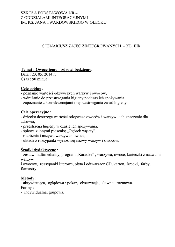 SZKOŁA PODSTAWOWA NR 4 Z ODDZIAŁAMI INTEGRACYJNYMI IM. KS. JANA TWARDOWSKIEGO W OLECKU SCENARIUSZ ZAJĘĆ ZINTEGROWANYCH – KL. IIIb Temat : Owoce jemy – zdrowi będziemy. Data : 23. 05. 2014 r. Czas : 90 minut Cele ogólne : - poznanie wartości odżywczych warzyw i owoców, - wdrażanie do przestrzegania higieny podczas ich spożywania, - zapoznanie z konsekwencjami nieprzestrzegania zasad higieny. Cele operacyjne : - dziecko dostrzega wartości odżywcze owoców i warzyw , ich znaczenie dla zdrowia, - przestrzega higieny w czasie ich spożywania, - śpiewa z innymi piosenkę „Ogórek wąsaty”, - rozróżnia i nazywa warzywa i owoce, - układa z rozsypanki wyrazowej nazwy warzyw i owoców. Środki dydaktyczne : - zestaw multimedialny, program „Karaoke” , warzywa, owoce, karteczki z nazwami warzyw i owoców, rozsypanki literowe, płyta i odtwarzacz CD, karton, kredki, farby, flamastry. Metody : - aktywizująca, oglądowa : pokaz, obserwacja, słowna : rozmowa. Formy : - indywidualna, grupowa. PRZEBIEG ZAJĘĆ : 1. Powitanie – zabawa integracyjna „Sałatka owocowa”. Dzieci siedzą w kole, nauczyciel przydziela każdemu nazwę wybranego owocu. Na hasło prowadzącego, np. „gruszki” – wszystkie dzieci będące gruszkami zmieniają miejsce. Na hasło „ sałatka owocowa” zmieniają miejsce wszystkie dzieci. 2. Śpiewanie piosenki „Ogórek wąsaty” z wykorzystaniem programu komputerowego „Karaoke”. 3. Rozmowa z dziećmi na temat piosenki. 4. Zabawa „Odgadnij, jakim jesteś owocem lub warzywem”. Nauczyciel przykleja dzieciom na czołach karteczki z nazwami warzyw lub owoców . Dzieci chodzą po sali i pomagają kolegom odgadnąć nazwę na ich karteczce np. „marchewka” – jesteś czerwona, podłużna, i słodka. Kto domyśla się swojej nazwy podaje ją pozostałym uczestnikom dla sprawdzenia. 5. Czytanie opowiadania przez nauczyciela – dokończenie przez dzieci. W ostatnią sobotę Ola wybrała się z mamą na działkę i przyniosła stamtąd dużo pysznych , świeżych owoców i warzyw. Cały kosz rumianych jabłek i słodkich wiśni, a także kilka gruszek, które spadły już z drzewa. Znalazły się tam również marchewka, pietruszka, sałata, ogórki i pomidory. Kiedy tylko weszły z mamą do domu, mama zawołała Kubę i dała dzieciom pyszne jabłka.” Tylko umyjcie je dobrze przed zjedzeniem” – powiedziała. „Ale mamo, przecież one są czyste” – rzekła Ola i już chciała ugryźć jabłko. Widząc to Kuba powiedział: „Wydaje ci się, że są czyste. Tak naprawdę jest na nich dużo niewidocznych bakterii - brudasów. Twoje ręce są brudne od pracy na działce. Dzieci, które nie pamiętają o myciu rąk często chorują”. Od tego czasu ….. 6. Dokończenie opowiadania. 7. Zabawa taneczna „Pląs witaminowy” . Taniec (dowolna interpretacja) w rytm podkładu muzycznego do melodii. 8. Przeglądanie zawartości kosza z warzywami i owocami. Segregacja i układanie podpisów z rozsypanek literowych. 9. Zabawa badawcza : Dzieci z zawiązanymi oczami częstują się kawałkami owoców lub warzyw i podają ich nazwy. 10. Wykonanie w grupach plakatów jako podsumowanie omawianej tematyki. 11. Wystawa prac. 12. Omówienie i ocenienie pracy uczniów.