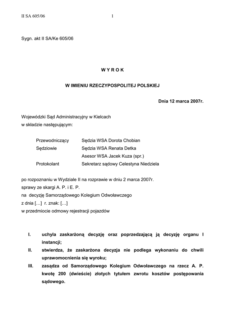II SA 605/06 1 Sygn. akt II SA/Ke 605/06 WYROK W IMIENIU RZECZYPOSPOLITEJ POLSKIEJ Dnia 12 marca 2007r. Wojewódzki Sąd Administracyjny w Kielcach w składzie następującym: Przewodniczący Sędzia WSA Dorota Chobian Sędziowie Sędzia WSA Renata Detka Asesor WSA Jacek Kuza (spr.) Protokolant Sekretarz sądowy Celestyna Niedziela po rozpoznaniu w Wydziale II na rozprawie w dniu 2 marca 2007r. sprawy ze skargi A. P. i E. P. na decyzję Samorządowego Kolegium Odwoławczego z dnia […] r. znak: […] w przedmiocie odmowy rejestracji pojazdów I. uchyla zaskarŜoną decyzję oraz poprzedzającą ją decyzję organu I instancji; II. stwierdza, Ŝe zaskarŜona decyzja nie podlega wykonaniu do chwili uprawomocnienia się wyroku; III. zasądza od Samorządowego Kolegium Odwoławczego na rzecz A. P. kwotę 200 (dwieście) złotych tytułem zwrotu kosztów postępowania sądowego. II SA 605/06 2 UZASADNIENIE ZaskarŜoną decyzją z dnia […] r. Samorządowe Kolegium Odwoławcze utrzymało w mocy decyzję Starosty Powiatu S z dnia […]w przedmiocie odmowy zarejestrowania pojazdów wskazanych we wniosku o rejestrację, tj. pojazdu marki Fiat Ducato, nr rej[…] oraz pojazdu marki FSO Warszawa, nr rej. […] W uzasadnieniu rozstrzygnięcia organ II instancji ustalił, Ŝe pismem z dnia 29 marca 2006 r. A. P. i E. P., współwłaściciele spółki cywilnej „A” zwrócili się do Starostwa Powiatowego w S. o wymianę dowodów rejestracyjnych dwóch pojazdów spółki, tj. samochodów marki FSO Warszawa, nr rej. […] oraz marki Fiat Ducato nr rej[…]. W uzasadnieniu wniosku wskazali oni na brak miejsca w dowodach rejestracyjnych tych pojazdów na wpisy następnych przeglądów technicznych, a takŜe na fakt, iŜ w dniu 6 października 2003 r. do Spółki weszła E. P., natomiast dnia 7 marca 2003 r. zmarła wspólniczka tej spółki – I. O.Siedziba spółki została przeniesiona na ulicę […], co teŜ miało uzasadniać wymianę dowodów rejestracyjnych. Wnioskodawcy nadmienili, Ŝe Spółka kontynuuje działalność w składzie: A. P. i E. P.. W wyniku rozpatrzenia powyŜszego wniosku, Starosta Powiatu S decyzją z dnia […], na podstawie art. 72 ust. 1 pkt 1 ustawy Prawo o ruchu drogowym, odmówił zarejestrowania pojazdów w części dotyczącej określenia właściciela pojazdu. W uzasadnieniu rozstrzygnięcia organ I instancji wyjaśnił, Ŝe A. P. i T. O. zawarli w dniu 2 kwietnia 1991 r. umowę spółki cywilnej w celu prowadzenia działalności gospodarczej w zakresie przetwórstwa tworzyw sztucznych. W dniu 30 stycznia 1992 r. w miejsce T. O. wstąpiła do spółki jego Ŝona – I. O.. Na tę okoliczność sporządzono aneks do umowy i udziały wspólników określono po 50 %. A. P. i I. O. wnioskiem z dnia 4 listopada 1994 r. i z dnia 29 grudnia 1997 r. wystąpili o zarejestrowanie pojazdów Fiat Ducato i FSO Warszawa zakupionych przez nich jako wspólników spółki cywilnej. Z uwagi na fakt, Ŝe spółka cywilna nie posiada osobowości prawnej i nie moŜe być wpisana do dowodu rejestracyjnego jako właściciel pojazdu, a właścicielami mogą być tylko wspólnicy spółki cywilnej jako osoby fizyczne, pojazdy te zostały zarejestrowane pod numerami rejestracyjnymi […], jako współwłasność A. P. i I. O. Organ ustalił następnie, Ŝe w dniu 6 października 2003 r. do spółki wstąpiła E. P. Z aneksu do umowy wynika równieŜ, Ŝe udziały wspólników ustalono w przypadku I. O. na 50 %, A. P. 45% natomiast E. P i. 5%. W dniu 7 października 2003 roku zmarła I. O. i w tym samym dniu A. P. aneksem do umowy ustalił, Ŝe spółka działać będzie dalej oraz określił nowe udziały w spółce, tj. Ŝe A. P. dysponował udziałami w wysokości 95 % i E. P. w wysokości 5 % . W związku z powyŜszym zawnioskował o dokonanie zmian w dowodach rejestracyjnych pojazdów w oparciu o wprowadzone aneksem zmiany do umowy. Organ stwierdził, Ŝe przedłoŜenie aneksu do wniosku o II SA 605/06 3 ponowną rejestrację pojazdów, jako dowodu własności tych pojazdów, jest niewystarczające, gdyŜ brak jest umowy przenoszącej własność pojazdów, której stronami byliby wszyscy wspólnicy i spadkobiercy zmarłego wspólnika. W tak ustalonym stanie faktycznym Samorządowe Kolegium Odwoławcze w Kielcach, dokonując prawnej i merytorycznej oceny zaskarŜonej decyzji, podzieliło stanowisko organu I instancji. Organ odwoławczy przywołał treść art. 72 ust. 1 pkt 1 ustawy z dnia 20 czerwca 1997 r. Prawo o ruchu drogowym, stosownie do którego rejestracji pojazdu dokonuje się na podstawie dowodu własności pojazdu lub dokumentu potwierdzającego powierzenie pojazdu, o którym mowa w art. 73 ust. 5, a takŜe § 4 ust. 1 rozporządzenia Ministra Infrastruktury z dnia 22 lipca 2002 r. w sprawie rejestracji i oznaczania pojazdów lub jego pojedynczych zespołów, który stanowi, Ŝe dowodem własności pojazdu lub jego pojedynczych zespołów jest w szczególności jeden z następujących dokumentów: 1 / umowa sprzedaŜy , 2 / umowa zamiany , 3 / umowa darowizny , 4 / umowa o doŜywocie , 5 / faktura VAT , 6 / prawomocne orzeczenia sądu rozstrzygające o prawie własności. Organ podkreślił, Ŝe zmiany zgłoszone przez wnioskodawców mogą być dokonane poprzez kolejną rejestrację pojazdów, ze wskazaniem obecnych i Ŝyjących współwłaścicieli pojazdów na podstawie bezspornych dowodów ich współwłasności. Decyzja o rejestracji pojazdów ma specyficzny charakter, nie jest doręczana stronom postępowania, a jej potwierdzeniem jest dowód rejestracyjny wydany na imię właściciela (współwłaścicieli) pojazdu. W przekonaniu organu odwoławczego, aneks do umowy spółki sporządzony w dniu 7 października 2003 r., z którego wynika, Ŝe udziały zmarłej I. O. przechodzą na A. P., nie moŜe być uznany za wystarczający dowód własności, w sprawie dotyczącej rejestracji pojazdu. Organy administracji dokonują bowiem rejestracji pojazdów na podstawie dokument