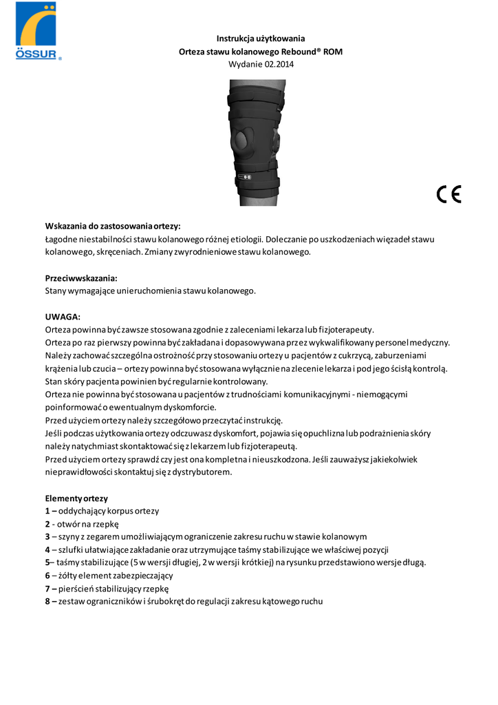 Instrukcja użytkowania Orteza stawu kolanowego Rebound® ROM Wydanie 02.2014 Wskazania do zastosowania ortezy: Łagodne niestabilności stawu kolanowego różnej etiologii. Doleczanie po uszkodzeniach więzadeł stawu kolanowego, skręceniach. Zmiany zwyrodnieniowe stawu kolanowego. Przeciwwskazania: Stany wymagające unieruchomienia stawu kolanowego. UWAGA: Orteza powinna być zawsze stosowana zgodnie z zaleceniami lekarza lub fizjoterapeuty. Orteza po raz pierwszy powinna być zakładana i dopasowywana przez wykwalifikowany personel medyczny. Należy zachować szczególna ostrożność przy stosowaniu ortezy u pacjentów z cukrzycą, zaburzeniami krążenia lub czucia – ortezy powinna być stosowana wyłącznie na zlecenie lekarza i pod jego ścisłą kontrolą. Stan skóry pacjenta powinien być regularnie kontrolowany. Orteza nie powinna być stosowana u pacjentów z trudnościami komunikacyjnymi - niemogącymi poinformować o ewentualnym dyskomforcie. Przed użyciem ortezy należy szczegółowo przeczytać instrukcję. Jeśli podczas użytkowania ortezy odczuwasz dyskomfort, pojawia się opuchlizna lub podrażnienia skóry należy natychmiast skontaktować się z lekarzem lub fizjoterapeutą. Przed użyciem ortezy sprawdź czy jest ona kompletna i nieuszkodzona. Jeśli zauważysz jakiekolwiek nieprawidłowości skontaktuj się z dystrybutorem. Elementy ortezy 1 – oddychający korpus ortezy 2 - otwór na rzepkę 3 – szyny z zegarem umożliwiającym ograniczenie zakresu ruchu w stawie kolanowym 4 – szlufki ułatwiające zakładanie oraz utrzymujące taśmy stabilizujące we właściwej pozycji 5– taśmy stabilizujące (5 w wersji długiej, 2 w wersji krótkiej) na rysunku przedstawiono wersje długą. 6 – żółty element zabezpieczający 7 – pierścień stabilizujący rzepkę 8 – zestaw ograniczników i śrubokręt do regulacji zakresu kątowego ruchu Dla zwiększenia efektywności ortezy dopasuj kształt szyn oraz położenie i długość pierścienia stabilizującego rzepkę do indywidualnych potrzeb. Przed założeniem ortezy wyjmij szyny z kieszeni znajdujących się w jej korpusie. Wygnij szyny tak, aby pasowały do kształtów kończyny. Umieść szyny z powrotem w kieszeniach i upewnij się, że są one właściwie umocowane. Dopasuj stabilizację rzepki przed założeniem ortezy. Pierścień stabilizujący rzepkę może być przycięty lub zamontowany w innym położeniu w zależności od indywidualnych potrzeb terapeutycznych. Zakładanie ortezy: Wersja zamknięta: wciągnij korpus ortezy przez stopę przy pomocy szlufek, tak aby rzepka znalazła się w przeznaczonym dla niej otworze. Rys 2 Wersja otwarta: zapnij ortezę wokół kolana zaczynając od części dolnej tak, aby rzepka znalazła się z przeznaczonym dla niej otworze. Rys 3a, 3b Zapinanie taśm: Rozwiń i zapnij wszystkie taśmy stabilizujące według kolejności wskazanej na rysunku 4. Taśmy 1 i 2 - żółty element zabezpieczający pozwala na dopasowanie odwodu taśmy stabilizującej 1 i 2 przy jej pierwszym zapinaniu. Po dopasowaniu odwodu i siły stabilizacji należy usunąć żółte zabezpieczenia. Taśma 3 (tylko w wersji długiej) –przypnij taśmę do rzepa znajdującego się na kieszeni szyny, sprawdź czy taśm przebiega prawidłowo z tyłu kończyny, lekko zegnij kolano i delikatnie naciśnij zegary ku tyłowi, napnij taśmę i przypnij ją do rzepa znajdującego się na drugiej szynie. Przełóż taśmę przez pierścień i zapnij z przodu kolana. Taśmy 4 i 5 (tylko w wersji długiej) – zapnij taśmy tak, aby szyny stabilizujące znajdowały się dokładnie w linii środkowej kończyny. Długoś obu taśm może być regulowana. Rys.5 Pierścień stabilizujący rzepkę może być umieszczony w pozycji dostosowanej do potrzeb terapeutycznych – wyjmij pierścień od środka ortezy i umieść go w pożądanej pozycji Regulacja zakresu kątowego ruchu Zakres kątowy ruchu powinien być regulowany zgodnie z zaleceniami lekarza lub fizjoterapeuty. Ortezy jest dostarczana z zamontowanym ogranicznikiem wyprostu 10˚. Dołączone do ortezy ograniczniki umożliwiają zmianę ograniczenia zakresu ruchu na 0˚, 5˚, 10˚, 20˚, 30˚, 40˚ wyprostu oraz 0˚, 45˚, 60˚, 75˚, 90˚ zgięcia. Aby wymienić ogranicznik zakresu kątowego odkręć śrubę na dolnej stronie zegara (rys 6a) i wyjmij ogranicznik 10˚. Umieść właściwy ogranicznik w zegarze i zakręć delikatnie śrubę (pamiętaj, aby jej nie dokręcać zbyt mocno) (rys. 6b). Wykonaj te same czynności dla ograniczenia zakresu kata zgięcia. Konserwacja: Przed praniem wyjąć szyny wraz z zegarami z kieszeni korpusu i zapiąć wszystkie rzepy tak, aby podczas prania nie zniszczyły tkaniny. Korpus prać ręcznie (temp. maks. 30˚) z dodatkiem łagodnych detergentów, suszyć z dala od sztucznych źródeł ciepła. Zamek czyścić wodą lub sprężonym powietrzem. Użycie suchych środków smarujących jest wskazane, jeśli zamek jest czyszczony przy pomocy wody. Skład: nylon, elastan, poliester UWAGA Nie przestrzeganie właściwej higieny osobistej, stosowanie niewłaściwych środków piorących może spowodować otarcia lub inne dolegliwości związane ze wzmożoną potliwością i rozwojem flory bakteryjnej. OSTATECZNĄ DECYZJĘ DOTYCZĄCĄ ZASTOSOWANIA I WYBORU ZAOPATRZENIA PODEJMUJE LEKARZ SPECJALISTA ÖSSUR HEAD OFFICE Grjothals 5 110 Reykjavik, Iceland Tel: +354 515 1300 Fax: +354 515 1366 [email protected] www.ossur.com Dystrybutor: mdh sp. z o.o. ul. Tymienieckiego 22/24 90-349 Łódź tel. +4842 637 59 79 fax +4842 636 52 21 www.mdh.pl