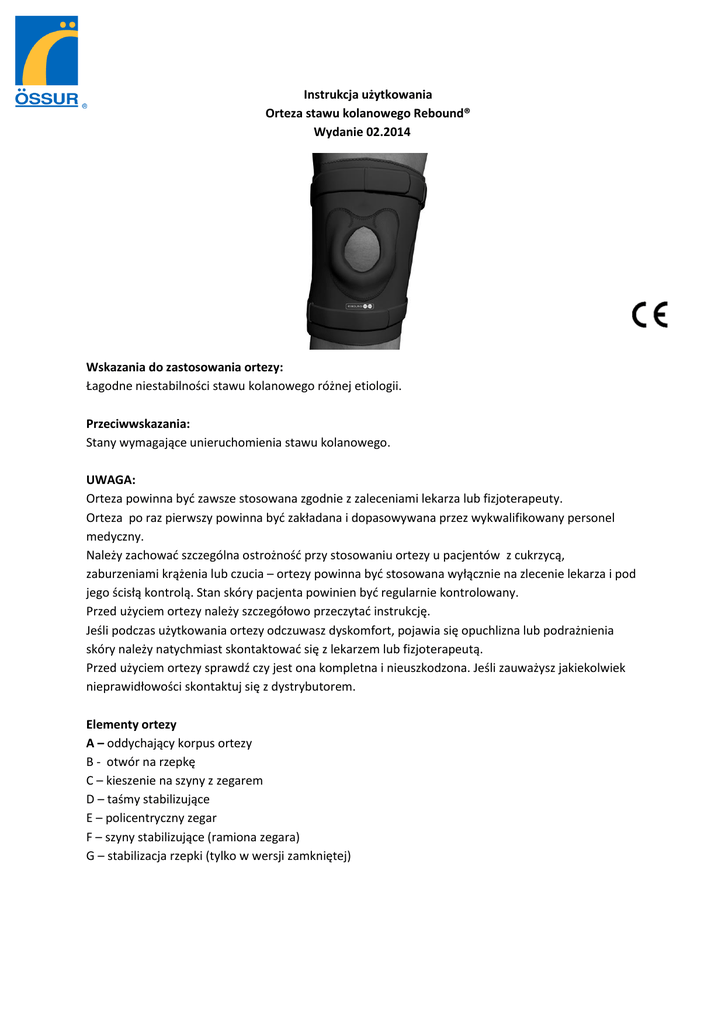 Instrukcja użytkowania Orteza stawu kolanowego Rebound® Wydanie 02.2014 Wskazania do zastosowania ortezy: Łagodne niestabilności stawu kolanowego różnej etiologii. Przeciwwskazania: Stany wymagające unieruchomienia stawu kolanowego. UWAGA: Orteza powinna być zawsze stosowana zgodnie z zaleceniami lekarza lub fizjoterapeuty. Orteza po raz pierwszy powinna być zakładana i dopasowywana przez wykwalifikowany personel medyczny. Należy zachować szczególna ostrożność przy stosowaniu ortezy u pacjentów z cukrzycą, zaburzeniami krążenia lub czucia – ortezy powinna być stosowana wyłącznie na zlecenie lekarza i pod jego ścisłą kontrolą. Stan skóry pacjenta powinien być regularnie kontrolowany. Przed użyciem ortezy należy szczegółowo przeczytać instrukcję. Jeśli podczas użytkowania ortezy odczuwasz dyskomfort, pojawia się opuchlizna lub podrażnienia skóry należy natychmiast skontaktować się z lekarzem lub fizjoterapeutą. Przed użyciem ortezy sprawdź czy jest ona kompletna i nieuszkodzona. Jeśli zauważysz jakiekolwiek nieprawidłowości skontaktuj się z dystrybutorem. Elementy ortezy A – oddychający korpus ortezy B - otwór na rzepkę C – kieszenie na szyny z zegarem D – taśmy stabilizujące E – policentryczny zegar F – szyny stabilizujące (ramiona zegara) G – stabilizacja rzepki (tylko w wersji zamkniętej) Dla zwiększenia efektywności ortezy dopasuj kształt szyn oraz stabilizacje rzepki do indywidualnych potrzeb. Przed założeniem ortezy wyjmij szyny z kieszeni znajdujących się w jej korpusie. Wygnij szyny tak, aby pasowały do kształtów kończyny. Umieść szyny z powrotem w kieszeniach i upewnij się że są one właściwie umocowane. Dopasuj stabilizację rzepki przed założeniem ortezy. Pierścień stabilizujący rzepkę może być przycięty lub zamontowany w innym położeniu w zależności od indywidualnych potrzeb terapeutycznych. Zakładanie ortezy: Wersja zamknięta: wciągnij korpus ortezy przez stopę tak aby rzepka znalazła się w przeznaczonym dla niej otworze. Rys 2 Wersja otwarta: zapnij ortezę wokół kolana zaczynając od części dolnej tak aby rzepka znalazła się z przeznaczonym dla niej otworze. Rys 3. Rozwiń i zapnij wszystkie taśmy stabilizujące według kolejności wskazanej na rysunku 4. Konserwacja: Przed praniem wyjąć szyny wraz z zegarami z kieszeni korpusu i zapiąć wszystkie rzepy tak aby podczas prania nie zniszczyły tkaniny. Korpus prać ręcznie (temp. Maks. 30˚) z dodatkiem łagodnych detergentów, suszyć z dala od sztucznych źródeł ciepła. Zamek czyścić wodą lub sprężonym powietrzem. Użycie suchych środków smarujących jest wskazane jeśli zamek jest czyszczony przy pomocy wody. Skład: nylon, elastan, poliester UWAGA Nie przestrzeganie właściwej higieny osobistej, stosowanie niewłaściwych środków piorących może spowodować otarcia lub inne dolegliwości związane ze wzmożoną potliwością i rozwojem flory bakteryjnej. OSTATECZNĄ DECYZJĘ DOTYCZĄCĄ ZASTOSOWANIA I WYBORU ZAOPATRZENIA PODEJMUJE LEKARZ SPECJALISTA ÖSSUR HEAD OFFICE Grjothals 5 110 Reykjavik, Iceland Tel: +354 515 1300 Fax: +354 515 1366 [email protected] www.ossur.com Dystrybutor: mdh sp. z o.o. ul. Tymienieckiego 22/24 90-349 Łódź tel. +4842 637 59 79 fax +4842 636 52 21 www.mdh.pl