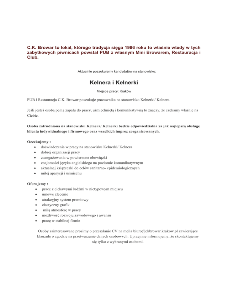 C.K. Browar to lokal, którego tradycja sięga 1996 roku to właśnie wtedy w tych zabytkowych piwnicach powstał PUB z własnym Mini Browarem, Restauracja i Club. C Aktualnie poszukujemy kandydatów na stanowisko: Kelnera i Kelnerki Miejsce pracy: Kraków PUB i Restauracja C.K. Browar poszukuje pracownika na stanowisko Kelnerki/ Kelnera. Jeśli jesteś osobą pełną zapału do pracy, uśmiechniętą i komunikatywną to znaczy, że czekamy właśnie na Ciebie. Osoba zatrudniona na stanowisku Kelnera/ Kelnerki będzie odpowiedzialna za jak najlepszą obsługę klienta indywidualnego i firmowego oraz wszelkich imprez zorganizowanych. Oczekujemy : doświadczenia w pracy na stanowisku Kelnerki/ Kelnera dobrej organizacji pracy zaangażowania w powierzone obowiązki znajomości języka angielskiego na poziomie komunikatywnym aktualnej książeczki do celów sanitarno- epidemiologicznych miłej aparycji i uśmiechu Oferujemy : pracę z ciekawymi ludźmi w nietypowym miejscu umowę zlecenie atrakcyjny system premiowy elastyczny grafik miłą atmosferę w pracy możliwość rozwoju zawodowego i awansu pracę w stabilnej firmie Osoby zainteresowane prosimy o przesyłanie CV na meila [email protected] zawierające klauzulę o zgodzie na przetwarzanie danych osobowych. Uprzejmie informujemy, że skontaktujemy się tylko z wybranymi osobami.