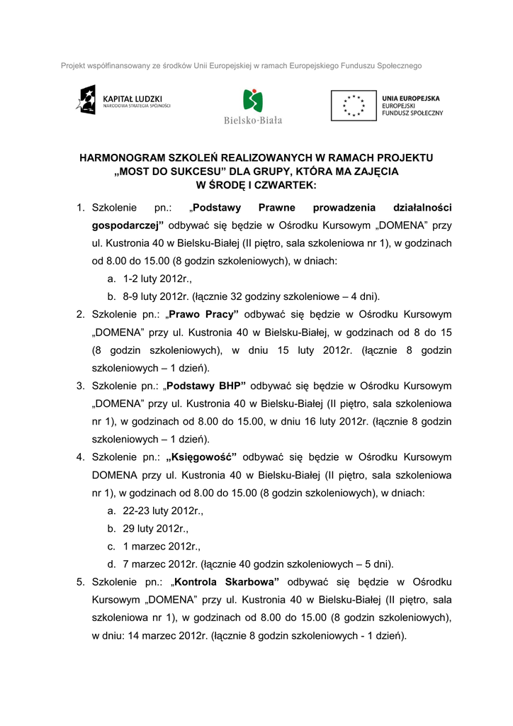Projekt współfinansowany ze środków rodków Unii Europejskiej w ramach Europejskiego Funduszu Społecznego HARMONOGRAM SZKOLEŃ SZKOLE REALIZOWANYCH W RAMACH AMACH PROJEKTU „MOST DO SUKCESU” DLA GRUPY, KTÓRA MA ZAJĘCIA ZAJĘ W ŚRODĘ I CZWARTEK: 1. Szkolenie pn.: „Podstawy Podstawy Prawne prowadzenia działalno działalności gospodarczej” odbywać odbywa się będzie w Ośrodku rodku Kursowym „DOMENA” przy ul. Kustronia 40 w Bielsku-Białej Bielsku (II piętro, tro, sala szkoleniowa nr 1), 1) w godzinach od 8.00 do 15.00 (8 godzin szkoleniowych), w dniach: a. 1-2 luty 2012r., 2012r. b. 8-9 luty 2012r. (łącznie ( 32 godziny szkoleniowe – 4 dni). 2. Szkolenie pn.: „Prawo Prawo Pracy” Pracy odbywać się będzie w Ośrodku środku Kursowym „DOMENA” przy ul.. Kustronia 40 w Bielsku-Białej,, w godzinach od 8 do 15 (8 godzin szkoleniowych), szkoleniowych w dniu 15 luty 2012r. (łącznie (łą 8 godzin szkoleniowych – 1 dzień). dzie 3. Szkolenie pn.: „Podstawy Podstawy BHP” BHP odbywać się będzie w Ośśrodku Kursowym „DOMENA” przy ul. Kustronia 40 w Bielsku-Białej (II piętro, tro, sala szkoleniowa nr 1), w godzinach od 8.00 do 15.00, w dniu 16 luty 2012r. (łącznie (ł 8 godzin szkoleniowych – 1 dzień). dzie 4. Szkolenie pn.: „Księ Księgowość” odbywać się będzie w Ośrodku środku Kursowym Kursow DOMENA przy ul. Kustronia 40 w Bielsku-Białej (II piętro, tro, sala szkoleniowa nr 1), w godzinach od 8.00 8 do 15.00 (8 godzin szkoleniowych), szkoleniowych w dniach: a. 22-23 luty 2012r., b. 29 luty 2012r., c. 1 marzec 2012r., 2012r. d. 7 marzec 2012r. (łącznie 40 godzin szkoleniowych – 5 dni). 5. Szkolenie pn.: „Kontrola Kontrola Skarbowa” Skarbowa odbywać się będzie ędzie w Ośrodku Kursowym „DOMENA DOMENA” przy ul. Kustronia 40 w Bielsku-Białej Białej (II piętro, sala szkoleniowa nr 1), w godzinach godzina od 8.00 do 15.00 (8 godzin szkoleniowych), w dniu: 14 marzec 2012r. (łącznie (ł 8 godzin szkoleniowych - 1 dzień). dzie 6. Szkolenie pn.: „Marketing i obsługa klienta” odbywać się będzie w Ośrodku Kursowym „DOMENA” przy ul. Kustronia 40 w Bielsku-Białej (II piętro, sala szkoleniowa nr 1), w godzinach od 8.00 do15.00 (8 godzin szkoleniowych), w dniach: a. 15 marzec 2012r., b. 21-22 marzec 2012r. , c. 28 marzec (łącznie 32 godziny szkoleniowe – 4 dni). 7. Szkolenie pn.: „Podstawy Obsługi Komputera” odbywać się będzie w Ośrodku Kursowym „DOMENA” przy ul. Kustronia 40 w Bielsku-Białej (II piętro, sala szkoleniowa nr 1),w godzinach od 8.00 do 15.00 (8 godzin szkoleniowych), w dniach: a. 29 marzec 2012r., b. 4-5 kwiecień 2012r., c. 11 kwiecień 2012r. 8. Szkolenie pn.: „Biznes Plan” odbywać się będzie w Ośrodku Kursowym „DOMENA” przy ul. Kustronia 40 w Bielsku-Białej (II piętro, sala szkoleniowa nr 1), w godzinach od 8.00 do 15.00 (8 godzin szkoleniowych), w dniach: a. 12 kwiecień 2012r., b. 18-19 kwiecień 2012r., c. 25-26 kwiecień 2012r. (łącznie 40 godzin szkoleniowych – 5 dni).