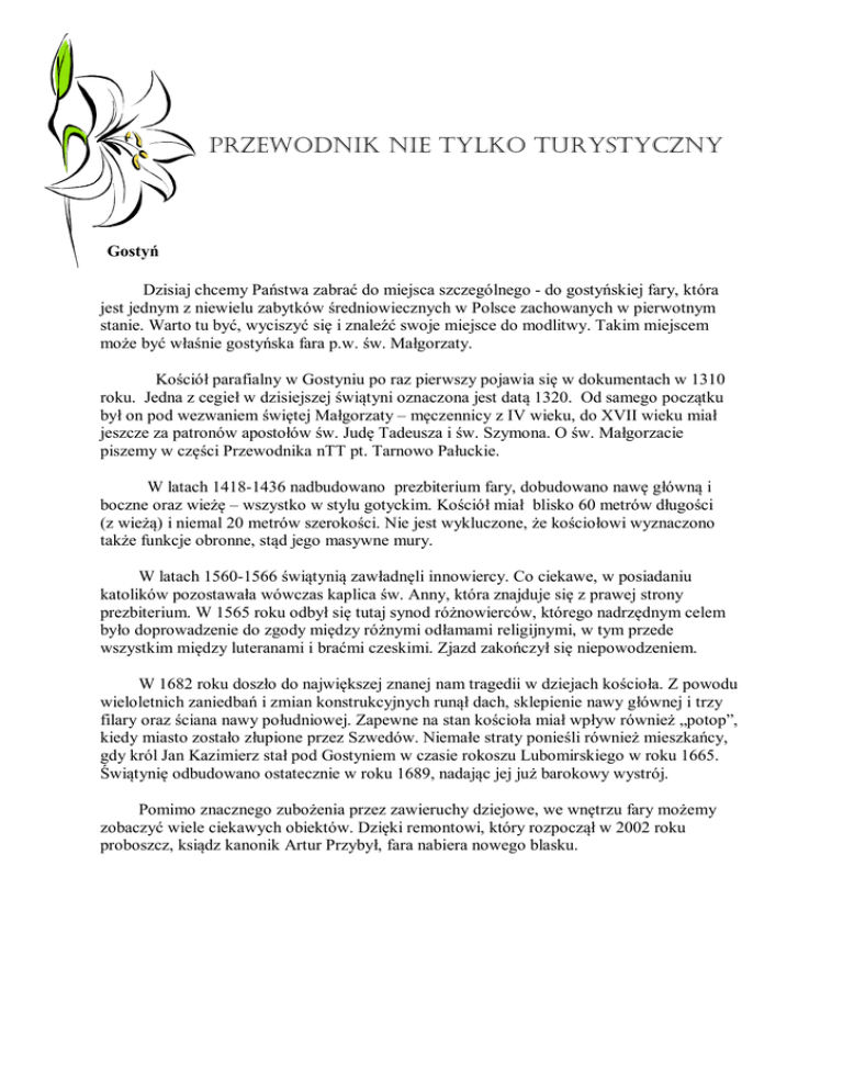 PRZEWODNIK NIE TYLKO TURYSTYCZNY Gostyń Dzisiaj chcemy Państwa zabrać do miejsca szczególnego - do gostyńskiej fary, która jest jednym z niewielu zabytków średniowiecznych w Polsce zachowanych w pierwotnym stanie. Warto tu być, wyciszyć się i znaleźć swoje miejsce do modlitwy. Takim miejscem może być właśnie gostyńska fara p.w. św. Małgorzaty. Kościół parafialny w Gostyniu po raz pierwszy pojawia się w dokumentach w 1310 roku. Jedna z cegieł w dzisiejszej świątyni oznaczona jest datą 1320. Od samego początku był on pod wezwaniem świętej Małgorzaty – męczennicy z IV wieku, do XVII wieku miał jeszcze za patronów apostołów św. Judę Tadeusza i św. Szymona. O św. Małgorzacie piszemy w części Przewodnika nTT pt. Tarnowo Pałuckie. W latach 1418-1436 nadbudowano prezbiterium fary, dobudowano nawę główną i boczne oraz wieżę – wszystko w stylu gotyckim. Kościół miał blisko 60 metrów długości (z wieżą) i niemal 20 metrów szerokości. Nie jest wykluczone, że kościołowi wyznaczono także funkcje obronne, stąd jego masywne mury. W latach 1560-1566 świątynią zawładnęli innowiercy. Co ciekawe, w posiadaniu katolików pozostawała wówczas kaplica św. Anny, która znajduje się z prawej strony prezbiterium. W 1565 roku odbył się tutaj synod różnowierców, którego nadrzędnym celem było doprowadzenie do zgody między różnymi odłamami religijnymi, w tym przede wszystkim między luteranami i braćmi czeskimi. Zjazd zakończył się niepowodzeniem. W 1682 roku doszło do największej znanej nam tragedii w dziejach kościoła. Z powodu wieloletnich zaniedbań i zmian konstrukcyjnych runął dach, sklepienie nawy głównej i trzy filary oraz ściana nawy południowej. Zapewne na stan kościoła miał wpływ również „potop”, kiedy miasto zostało złupione przez Szwedów. Niemałe straty ponieśli również mieszkańcy, gdy król Jan Kazimierz stał pod Gostyniem w czasie rokoszu Lubomirskiego w roku 1665. Świątynię odbudowano ostatecznie w roku 1689, nadając jej już barokowy wystrój. Pomimo znacznego zubożenia przez zawieruchy dziejowe, we wnętrzu fary możemy zobaczyć wiele ciekawych obiektów. Dzięki remontowi, który rozpoczął w 2002 roku proboszcz, ksiądz kanonik Artur Przybył, fara nabiera nowego blasku. Kościół fary p.w. św. Małgorzaty w Gostyniu. Wejście do kościoła fary p.w. św. Małgorzaty w Gostyniu. Ołtarz główny pochodzi z około 1658 roku. Ostatnio restaurowany był w latach 1952-1955. W polu środkowym ołtarza znajduje się obraz Matki Boskiej Szkaplerznej, a w nastawie obraz świętej Małgorzaty z Antiochii (ok. 1646). Wystroju dopełniają rzeźby dwóch biskupów, św. Wojciecha i św. Stanisława (patronów Polski), apostołów – św. Judy Tadeusza i św. Szymona i aniołów. Do lat dwudziestych XX wieku w miejscu rzeźb św. Wojciecha i św. Stanisława znajdowały się postacie św. Piotra i św. Pawła – patronów archidiecezji poznańskiej. Część tabernakulum pochodzi z rozebranego w XVIII wieku kościoła w Czachorowie koło Gostynia. Jego obecny wygląd jest efektem przebudowy dokonanej w latach 1901-1906. Ołtarz boczny z obrazem Matki Boskiej z Dzieciątkiem z pierwszej połowy XVII w. Ambona z pierwszej połowy XVIII w. Organy gostyńskiej fary. Rokokowe konfesjonały i komplet ławek nawy głównej wykonano około 1750 roku w warsztatach stolarskich księży filipinów na Świętej Górze koło Gostynia. KAPLICA ŚW. ANNY Kaplica św. Anny znajduje się po prawej stronie nawy głównej, dostaniemy się do niej wchodząc schodami na piętro. O św. Annie pisaliśmy w przewodniku nTT w części pt. Margonin. Ołtarz w kaplicy św. Anny. W kaplicy św. Anny podziwiać można ołtarz z 1548 roku. W centralnym miejscu ołtarza znajduje się grupa rzeźb, zwanych św. Anną Samotrzecią, z około 1510 roku. Poniżej umieszczona jest predella, namalowana na desce w 1546 roku. Przedstawia ona drzewo genealogiczne Matki Boskiej. Zwieńczenie ołtarza stanowi płaskorzeźba Trójcy Świętej. Dopełnieniem trzykondygnacyjnego ołtarza są rzeźby świętych niewiast, aniołów oraz monogramy św. Anny i NMP. Chór w kaplicy został zbudowany w latach 1678-1693 przez Wojciecha Libowicza, o czym zaświadczają dwie tablice inskrypcyjne. Przepiękny sufit w kaplicy św. Anny a na nim tekst Bogurodzicy. W dniu 25 czerwca 1978 r. gostyńską farę odwiedził błogosławiony Jan Paweł II wtedy kardynał, metropolita krakowski. Tablica jubileuszowa i pamiątkowa z pobytu bł. Jana Pawła II w gostyńskiej farze. Kilka słów o Mszy Św. gregoriańskiej Na czym polega inność tzw. Mszy św. gregoriańskich? Co to jest? Jakie są ich duchowe owoce? Chciałabym przekonać kogoś mi bliskiego, że mają one wielką wartość, ale brakuje mi argumentów. Proszę o pomoc. Bardzo ciekawa jest historia tzw. Mszy gregoriańskich, popularnie zwanych gregoriankami. Wywodzą one swoją nazwę od imienia papieża Grzegorza Wielkiego (540604; papież od 590). U ich początku leży bardzo konkretne wydarzenie. Grzegorz przed swoim wyborem na papieża był przełożonym założonego przez siebie w 575 roku klasztoru na wzgórzu Celio w Rzymie. W IV Księdze Dialogów Grzegorz stwierdza, że ofiara Mszy św. pomaga osobom potrzebującym oczyszczenia po śmierci (por. Patrologia Latina, 77, 416) i jako przykład podaje doświadczenie z życia swojego klasztoru. Po śmierci jednego z mnichów imieniem Justus, w jego celi znaleziono trzy złote monety, których posiadanie sprzeciwiało się regule życia zakonnego, przewidującej wspólne korzystanie z dóbr materialnych. Grzegorz, aby pomóc zmarłemu oczyścić się po śmierci z tego grzechu, polecił odprawienie za niego kolejno następujących po sobie trzydziestu Mszy św. - każdego dnia jednej. Po trzydziestu dniach zmarły Justus ukazał się w nocy jednemu z braci, Kopiozjuszowi, mówiąc, że został uwolniony od wszelkiej kary. Kop