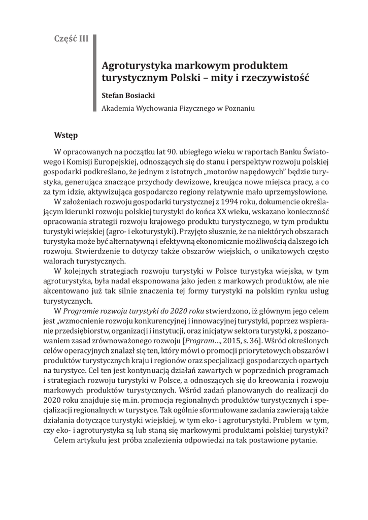 Część III Agroturystyka markowym produktem turystycznym Polski... Agroturystyka markowym produktem turystycznym Polski – mity i rzeczywistość 135 Stefan Bosiacki Wstęp Akademia Wychowania Fizycznego w Poznaniu W opracowanych na początku lat 90. ubiegłego wieku w raportach Banku Światowego i Komisji Europejskiej, odnoszących się do stanu i perspektyw rozwoju polskiej gospodarki podkreślano, że jednym z istotnych „motorów napędowych” będzie turystyka, generująca znaczące przychody dewizowe, kreująca nowe miejsca pracy, a co za tym idzie, aktywizująca gospodarczo regiony relatywnie mało uprzemysłowione. W założeniach rozwoju gospodarki turystycznej z 1994 roku, dokumencie określającym kierunki rozwoju polskiej turystyki do końca XX wieku, wskazano konieczność opracowania strategii rozwoju krajowego produktu turystycznego, w tym produktu turystyki wiejskiej (agro- i ekoturystyki). Przyjęto słusznie, że na niektórych obszarach turystyka może być alternatywną i efektywną ekonomicznie możliwością dalszego ich rozwoju. Stwierdzenie to dotyczy także obszarów wiejskich, o unikatowych często walorach turystycznych. W kolejnych strategiach rozwoju turystyki w Polsce turystyka wiejska, w tym agroturystyka, była nadal eksponowana jako jeden z markowych produktów, ale nie akcentowano już tak silnie znaczenia tej formy turystyki na polskim rynku usług turystycznych. W Programie rozwoju turystyki do 2020 roku stwierdzono, iż głównym jego celem jest „wzmocnienie rozwoju konkurencyjnej i innowacyjnej turystyki, poprzez wspieranie przedsiębiorstw, organizacji i instytucji, oraz inicjatyw sektora turystyki, z poszanowaniem zasad zrównoważonego rozwoju [Program…, 2015, s. 36]. Wśród określonych celów operacyjnych znalazł się ten, który mówi o promocji priorytetowych obszarów i produktów turystycznych kraju i regionów oraz specjalizacji gospodarczych opartych na turystyce. Cel ten jest kontynuacją działań zawartych w poprzednich programach i strategiach rozwoju turystyki w Polsce, a odnoszących się do kreowania i rozwoju markowych produktów turystycznych. Wśród zadań planowanych do realizacji do 2020 roku znajduje się m.in. promocja regionalnych produktów turystycznych i specjalizacji regionalnych w turystyce. Tak ogólnie sformułowane zadania zawierają także działania dotyczące turystyki wiejskiej, w tym eko- i agroturystyki. Problem w tym, czy eko- i agroturystyka są lub staną się markowymi produktami polskiej turystyki? Celem artykułu jest próba znalezienia odpowiedzi na tak postawione pytanie. 136 Stefan Bosiacki Rola marki w kreowaniu produktów turystycznych Jak słusznie zauważa Jerzy Altkorn, we współczesnym świecie produktem może być wszystko co można oferować na rynku. A warunkiem rynkowego sukcesu produktu jest jego zdolność do zaspokojenia określonych potrzeb [Altkorn 2000, s. 114]. Z tego punktu widzenia słuszne jest twierdzenie, że produkt oznacza zbiór korzyści dla nabywcy (konsumenta). Takie rozumienie produktu jest bardzo trafne w odniesieniu do usług turystycznych, które nie tylko zaspokajają określone potrzeby konsumenta-turysty, ale także przysparzają mu z tego tytułu innych korzyści np. wizerunkowych. To psychologiczne podejście do postrzegania produktu turystycznego reprezentuje m.in. Victor T.C. Middleton twierdząc, iż „z punktu widzenia potencjalnego klienta rozważającego dowolną formę podróży, produkt może być definiowany jako pakiet składników materialnych i niematerialnych, opartych na możliwościach spędzania czasu w miejscu docelowym. Pakiet jest postrzegany przez turystę jako przeżycie dostępne za określoną cenę” [Middleton 1996]. Także inni autorzy uwzględniają ten psychologiczny aspekt definiując produkt turystyczny. Na przykład Jacek Kaczmarek, Andrzej Stasiak, Bogdan Włodarczyk przyjmują, że produkt turystyczny „to zbiór użyteczności związanych z podróżami turystycznymi, czyli dostępne na rynku dobra i usługi turystyczne umożliwiające ich planowanie, odbywanie, przeżywanie oraz gromadzenie doświadczeń z nimi związanych” [Kaczmarek i in. 2005, s. 74]. Można zatem powiedzieć, że miarą rynkowego sukcesu produktu turystycznego na współczesnym rynku jest poziom satysfakcji (zadowolenia) jaką odczuwają nabywcy produktu, niezależnie od jego rodzaju np. zakupu usługi noclegowej lub pobytu w regionie turystycznym. Współczesny rynek usług turystycznych oferuje konsumentom-turystom olbrzymią gamę różnorodnych produktów, bardzo często substytucyjnych względem siebie, co sprawia duże trudności w wyborze takiego produktu, który w pełni spełnia oczekiwania konsumentów. Dlatego niezwykle ważną kwestią jest skuteczne budowanie w świadomości konsumentów-turystów wizerunku danego produktu, czyli tzw. pozycjonowania marki produktu. Najczęściej przyjmuje się, że marka to „nazwa, termin, symbol, wzór lub ich kombinacja, stworzone w celu identyfikacji dóbr lub usług sprzedawanych lub ich grupy, i wyróżnienia ich spośród konkurencji” [Kaczmarek i in. 2005, s. 238]. Powyższe rozumienie marki nie jest w pełni trafne, ponieważ nie obejmuje ono licznych korzyści wymiernych i niewymiernych, które stają się doświadczeniem konsumenta, nabywającego tak oznaczony produkt [Mruk 2012, s. 162]. Właśnie w przypadku produktów turystycznych istotną rolę odgrywają korzyści niewymierne lub trudno wymierne, takie jak: zadowolenie i satysfakcja turysty, prestiż w otoczeniu, wyróżnienie się, bezpieczeństwo wypoczynku, radość z udziału we wspólnej przygodzie. Te właśnie niewymierne korzyści dla potencjalnego turysty muszą być uwzględnione przy kreowaniu marki produktu turystycznego, w tym także w odniesieniu do produktów agroturystycznych. Tworząc markę produktu turystycznego trzeba zdecydować się na wybór rodzaju marki, czy ma to być marka indywidualna dotycząca konkr