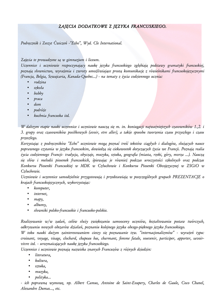 ZAJĘCIA DODATKOWE Z JĘZYKA FRANCUSKIEGO. Podręcznik i Zeszyt Ćwiczeń -''Echo'', Wyd. Cle International. Zajęcia te prowadzone są w gimnazjum i liceum. Uczennice i uczniowie rozpoczynający naukę języka francuskiego zgłębiają podstawy gramatyki francuskiej, poznają słownictwo, wyrażenia i zwroty umożliwiające prostą komunikację z rówieśnikami francuskojęzycznymi (Francja, Belgia, Szwajcaria, Kanada-Quebec...) - na tematy z życia codziennego ucznia: • rodzina • szkoła • hobby • praca • dom • podróże • kuchnia francuska itd. W dalszym etapie nauki uczennice i uczniowie nauczą się m. in. koniugacji najważniejszych czasowników 1.,2. i 3. grupy oraz czasowników posiłkowych (avoir, etre aller), a także sposobu tworzenia czasu przyszłego i czasu przeszłego. Korzystając z podręczników ''Echo'' uczniowie mogą poznać treść tekstów ciągłych i dialogów, służących nauce poprawnego czytania w języku francuskim, dowiedzą się ciekawostek dotyczących życia we Francji. Poznają realia życia codziennego Francji- tradycja, obyczaje, muzyka, sztuka, geografia (miasta, rzeki, góry, morza ...). Nauczą się słów i melodii piosenek francuskich, śpiewając je również podczas uroczystości szkolnych oraz podczas Konkursu Piosenki Francuskiej w MDK w Człuchowie i Konkursu Piosenki Obcojęzycznej w ZSGiO w Człuchowie. Uczniowie i uczennice samodzielnie przygotowują i przedstawiają w poszczególnych grupach PREZENTACJE o krajach francuskojęzycznych, wykorzystując: • komputer, • internet, • mapy, • albumy, • słowniki polsko-francuskie i francusko-polskie. Realizowanie w/w zadań, celów służy zwiększaniu samooceny uczniów, kształtowaniu postaw twórczych, odkrywaniu nowych obszarów działań, poznaniu kolejnego języka obcego-pięknego języka francuskiego. W toku nauki dużym zainteresowaniem cieszy się poznawanie tzw. ''internacjonalizmów'' - wyrażeń typu: croissant, voyage, visage, clochard, chapeau bas, charmant, femme fatale, souvenir, participer, apporter, savoirvivre itd. - urozmaicających naukę języka francuskiego. Uczennice i uczniowie poznają nazwiska znanych Francuzów z różnych dziedzin: • literatura, • kultura, • sztuka, • muzyka, • polityka… - ich poprawną wymowę, np. Albert Camus, Antoine de Saint-Exupery, Charles de Gaule, Coco Chanel, Alexandre Dumas…, etc.