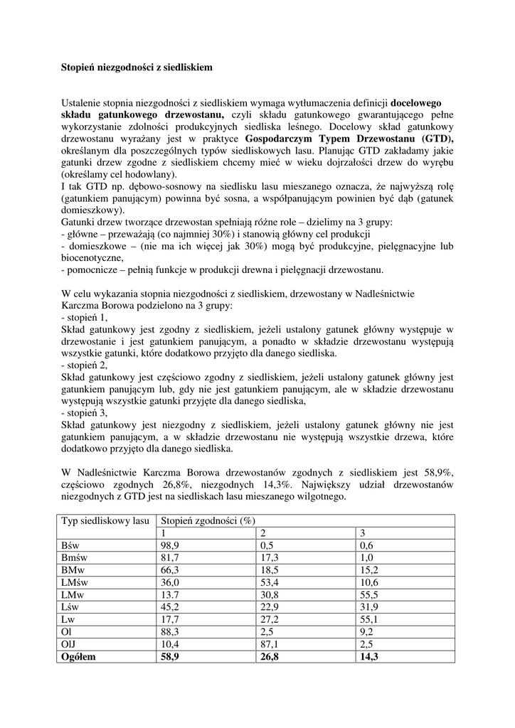 Stopień niezgodności z siedliskiem Ustalenie stopnia niezgodności z siedliskiem wymaga wytłumaczenia definicji docelowego składu gatunkowego drzewostanu, czyli składu gatunkowego gwarantującego pełne wykorzystanie zdolności produkcyjnych siedliska leśnego. Docelowy skład gatunkowy drzewostanu wyrażany jest w praktyce Gospodarczym Typem Drzewostanu (GTD), określanym dla poszczególnych typów siedliskowych lasu. Planując GTD zakładamy jakie gatunki drzew zgodne z siedliskiem chcemy mieć w wieku dojrzałości drzew do wyrębu (określamy cel hodowlany). I tak GTD np. dębowo-sosnowy na siedlisku lasu mieszanego oznacza, że najwyższą rolę (gatunkiem panującym) powinna być sosna, a współpanującym powinien być dąb (gatunek domieszkowy). Gatunki drzew tworzące drzewostan spełniają różne role – dzielimy na 3 grupy: - główne – przeważają (co najmniej 30%) i stanowią główny cel produkcji - domieszkowe – (nie ma ich więcej jak 30%) mogą być produkcyjne, pielęgnacyjne lub biocenotyczne, - pomocnicze – pełnią funkcje w produkcji drewna i pielęgnacji drzewostanu. W celu wykazania stopnia niezgodności z siedliskiem, drzewostany w Nadleśnictwie Karczma Borowa podzielono na 3 grupy: - stopień 1, Skład gatunkowy jest zgodny z siedliskiem, jeżeli ustalony gatunek główny występuje w drzewostanie i jest gatunkiem panującym, a ponadto w składzie drzewostanu występują wszystkie gatunki, które dodatkowo przyjęto dla danego siedliska. - stopień 2, Skład gatunkowy jest częściowo zgodny z siedliskiem, jeżeli ustalony gatunek główny jest gatunkiem panującym lub, gdy nie jest gatunkiem panującym, ale w składzie drzewostanu występują wszystkie gatunki przyjęte dla danego siedliska, - stopień 3, Skład gatunkowy jest niezgodny z siedliskiem, jeżeli ustalony gatunek główny nie jest gatunkiem panującym, a w składzie drzewostanu nie występują wszystkie drzewa, które dodatkowo przyjęto dla danego siedliska. W Nadleśnictwie Karczma Borowa drzewostanów zgodnych z siedliskiem jest 58,9%, częściowo zgodnych 26,8%, niezgodnych 14,3%. Największy udział drzewostanów niezgodnych z GTD jest na siedliskach lasu mieszanego wilgotnego. Typ siedliskowy lasu Bśw Bmśw BMw LMśw LMw Lśw Lw Ol OlJ Ogółem Stopień zgodności (%) 1 98,9 81,7 66,3 36,0 13.7 45,2 17,7 88,3 10,4 58,9 2 0,5 17,3 18,5 53,4 30,8 22,9 27,2 2,5 87,1 26,8 3 0,6 1,0 15,2 10,6 55,5 31,9 55,1 9,2 2,5 14,3 Drzewostany niezgodne z siedliskiem na LMśw to głównie lite sośniny na siedliskach, gdzie przyjęto GTD z panującym Db. Niezgodność ta wynika z wielu uwarunkowań i jest powodem przebudowy drzewostanów.