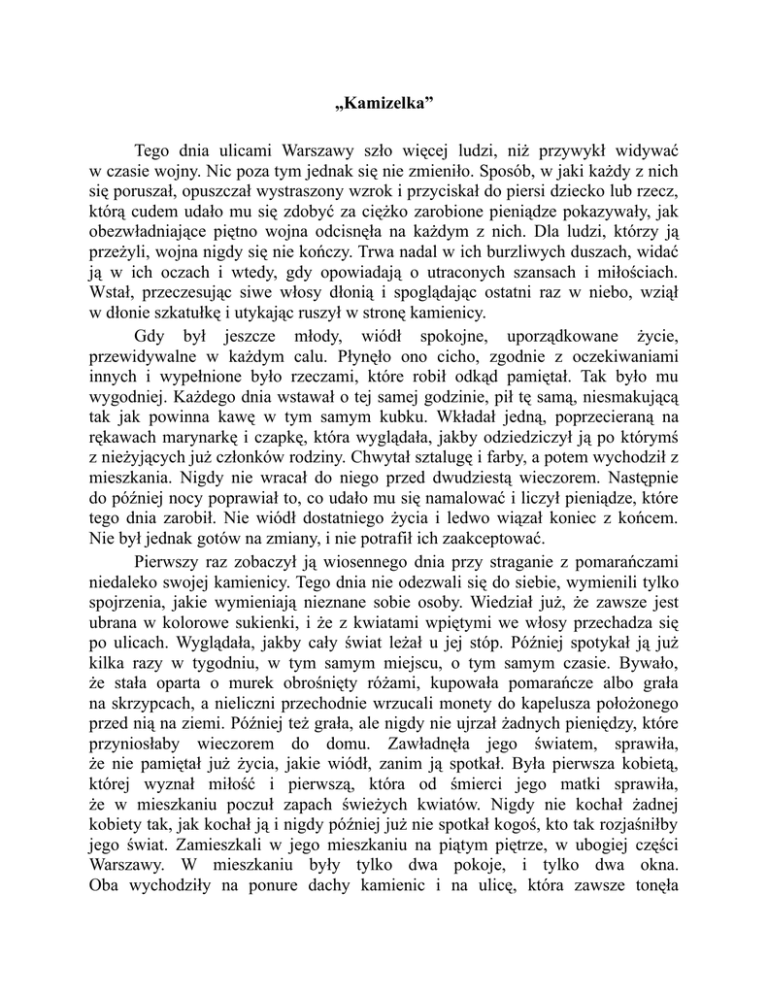 „Kamizelka” Tego dnia ulicami Warszawy szło więcej ludzi, niż przywykł widywać w czasie wojny. Nic poza tym jednak się nie zmieniło. Sposób, w jaki każdy z nich się poruszał, opuszczał wystraszony wzrok i przyciskał do piersi dziecko lub rzecz, którą cudem udało mu się zdobyć za ciężko zarobione pieniądze pokazywały, jak obezwładniające piętno wojna odcisnęła na każdym z nich. Dla ludzi, którzy ją przeżyli, wojna nigdy się nie kończy. Trwa nadal w ich burzliwych duszach, widać ją w ich oczach i wtedy, gdy opowiadają o utraconych szansach i miłościach. Wstał, przeczesując siwe włosy dłonią i spoglądając ostatni raz w niebo, wziął w dłonie szkatułkę i utykając ruszył w stronę kamienicy. Gdy był jeszcze młody, wiódł spokojne, uporządkowane życie, przewidywalne w każdym calu. Płynęło ono cicho, zgodnie z oczekiwaniami innych i wypełnione było rzeczami, które robił odkąd pamiętał. Tak było mu wygodniej. Każdego dnia wstawał o tej samej godzinie, pił tę samą, niesmakującą tak jak powinna kawę w tym samym kubku. Wkładał jedną, poprzecieraną na rękawach marynarkę i czapkę, która wyglądała, jakby odziedziczył ją po którymś z nieżyjących już członków rodziny. Chwytał sztalugę i farby, a potem wychodził z mieszkania. Nigdy nie wracał do niego przed dwudziestą wieczorem. Następnie do później nocy poprawiał to, co udało mu się namalować i liczył pieniądze, które tego dnia zarobił. Nie wiódł dostatniego życia i ledwo wiązał koniec z końcem. Nie był jednak gotów na zmiany, i nie potrafił ich zaakceptować. Pierwszy raz zobaczył ją wiosennego dnia przy straganie z pomarańczami niedaleko swojej kamienicy. Tego dnia nie odezwali się do siebie, wymienili tylko spojrzenia, jakie wymieniają nieznane sobie osoby. Wiedział już, że zawsze jest ubrana w kolorowe sukienki, i że z kwiatami wpiętymi we włosy przechadza się po ulicach. Wyglądała, jakby cały świat leżał u jej stóp. Później spotykał ją już kilka razy w tygodniu, w tym samym miejscu, o tym samym czasie. Bywało, że stała oparta o murek obrośnięty różami, kupowała pomarańcze albo grała na skrzypcach, a nieliczni przechodnie wrzucali monety do kapelusza położonego przed nią na ziemi. Później też grała, ale nigdy nie ujrzał żadnych pieniędzy, które przyniosłaby wieczorem do domu. Zawładnęła jego światem, sprawiła, że nie pamiętał już życia, jakie wiódł, zanim ją spotkał. Była pierwsza kobietą, której wyznał miłość i pierwszą, która od śmierci jego matki sprawiła, że w mieszkaniu poczuł zapach świeżych kwiatów. Nigdy nie kochał żadnej kobiety tak, jak kochał ją i nigdy później już nie spotkał kogoś, kto tak rozjaśniłby jego świat. Zamieszkali w jego mieszkaniu na piątym piętrze, w ubogiej części Warszawy. W mieszkaniu były tylko dwa pokoje, i tylko dwa okna. Oba wychodziły na ponure dachy kamienic i na ulicę, która zawsze tonęła w mroku. Mieli kominek, w którym niezbyt często palili, stół, dwa krzesła, szafeczkę na drobiazgi, łóżko, jego sztalugę i farby, oraz jej skrzypce. Zawsze, gdy wieczorami wracali zmęczeni, siadali na podłodze przy kominku i rozmawiali. Mówili o muzyce Vivaldiego, o obrazach Salvadora Daliego albo drogich włoskich winach, których nie dane im było spróbować. Każdego wieczora czytali książki, oraz wspólnie marzyli o tym, aby w przyszłości, gdy odłożą wystarczająco dużo pieniędzy, pojechać do Paryża. Później wybuchła wojna, i zniszczyła cały spokój, który tak długo budowali. Całe ich życie legło w gruzach, i nawet ona nie umiała juz cieszyć się z codziennych, małych rzeczy. Każdego dnia wracała coraz bardziej smutna i zgarbiona, i opowiadała mu, że dziś znowu widziała, jak żołnierze pojmali kogoś na ulicy, albo jak odebrali matce dziecko. Nie mówił nic, i kiwał smutno głową. Już wtedy wojna mu ją odebrała. Uwielbiała siadać na podłodze, opierać się plecami o zimną ścianę i słuchać odgłosów budynku. Mówiła, że słyszy, jak stare mury oddychają i opowiadają jej swoją historię - że widzi wszystkie rodziny, które kiedyś tu mieszkały, słyszy płacz wszystkich urodzonych tu dzieci i że skrzypiąca podłoga wygrywa swoją melodię. Patrzył zawsze na nią z pobłażaniem, ale jednocześnie uśmiechał się i myślał o tym, jaka jest wyjątkowa. Tego wieczora tez siedziała w tym samym miejscu, a on usiadł przy stoliku i próbował czytać, oświetlając strony gazety płomieniem świecy. W pewnej chwili ciszę zastąpił głośny ryk silnika. Uniósł głowę i spojrzał na nią. Nie wiedział, co malowało się na jej twarzy, ale na pewno nie był to strach. Gdy na schodach słychać było słowa rzucane po niemiecku i odgłos ciężkich butów, wiedziała. Wstała szybko, i zaczęła szukać w szufladzie dokumentów, oraz wyjęła ich ostatnie oszczędności i schowała pod sukienką. Pierwszy raz, odkąd ją poznał, zdjęła z szyi swój medalion i wraz z dokumentami wyjętymi z szuflady ukryła go w schowku, znajdującym się pod podłogą. Kilka chwil później usłyszeli otwierane z łomotem drzwi. Dostali trzy minuty, aby spakować najpotrzebniejsze rzeczy. Co, jeśli ktoś ich nie miał? Czas dłużył sie w nieskończoność, kiedy udawali, że szukają ulubionego szalika albo guzika od płaszcza. Nie zabrali nic. Gdy następnego ranka pierwsze promienie słońca przebijały się przez mgłę, na Umschlagplatz wszyscy wyglądali znajomo. Ludzie patrzyli na nich błagalnie, próbując uzyskać obietnice, że wszystko będzie dobrze, i że niedługo znowu usiądą przy stole ze swoimi rodzinami, martwiąc się codziennymi problemami. On spotkał tylko starego znajomego, miejscowego urzędnika. Ubrany był w golf, ciepłą marynarkę, szalik i palto, a w dłoni trzymał starą, zniszczoną kamizelkę. Był tego samego wzrostu,