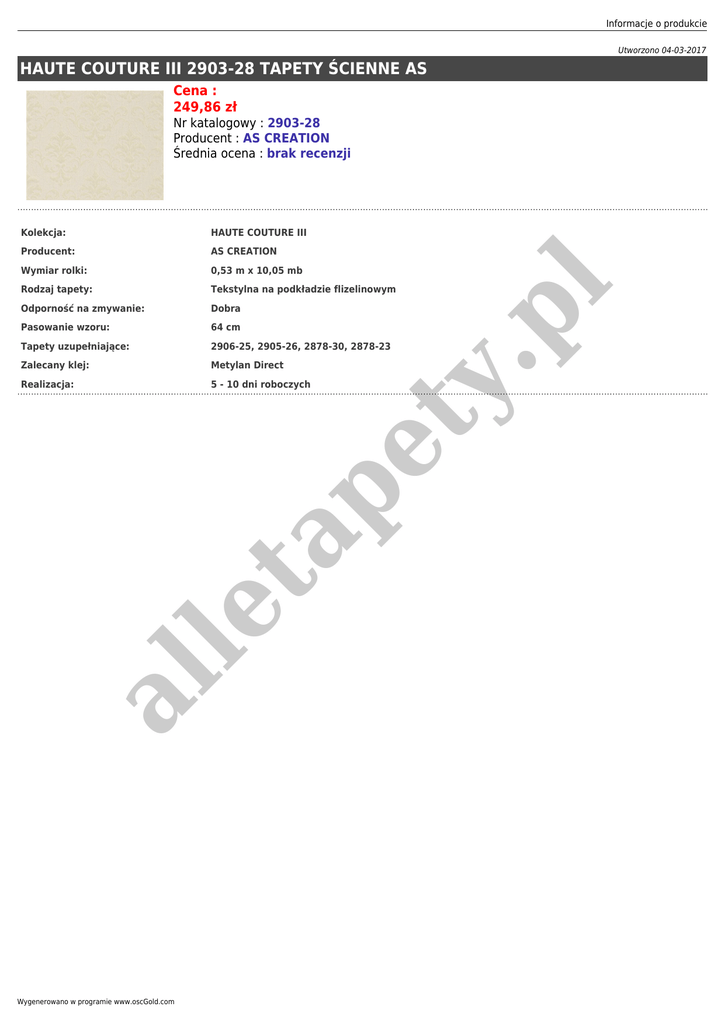 Informacje o produkcie Utworzono 04-03-2017 HAUTE COUTURE III 2903-28 TAPETY ŚCIENNE AS Cena : 249,86 zł HAUTE COUTURE III Producent: AS CREATION Wymiar rolki: 0,53 m x 10,05 mb Rodzaj tapety: Tekstylna na podkładzie flizelinowym Odporność na zmywanie: Dobra Pasowanie wzoru: 64 cm Tapety uzupełniające: 2906-25, 2905-26, 2878-30, 2878-23 Zalecany klej: Metylan Direct Realizacja: 5 - 10 dni roboczych al le ta pe ty Kolekcja: .p l Nr katalogowy : 2903-28 Producent : AS CREATION Średnia ocena : brak recenzji Wygenerowano w programie www.oscGold.com