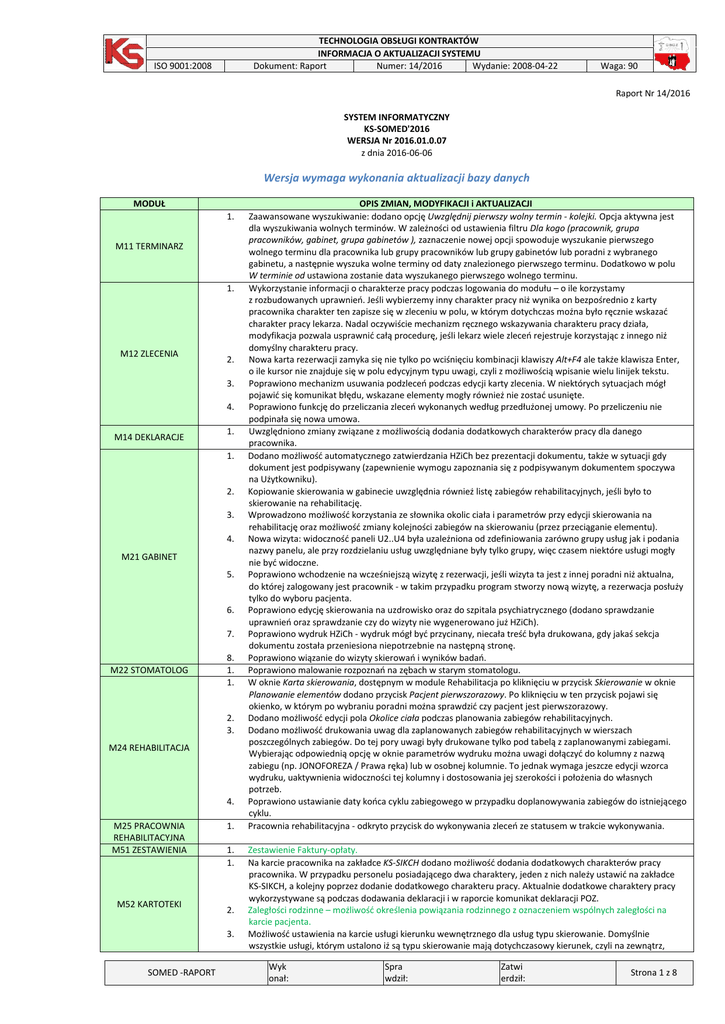 TECHNOLOGIA OBSŁUGI KONTRAKTÓW INFORMACJA O AKTUALIZACJI SYSTEMU Dokument: Raport Numer: 14/2016 Wydanie: 2008-04-22 ISO 9001:2008 Waga: 90 Raport Nr 14/2016 SYSTEM INFORMATYCZNY KS-SOMED'2016 WERSJA Nr 2016.01.0.07 z dnia 2016-06-06 Wersja wymaga wykonania aktualizacji bazy danych MODUŁ 1. M11 TERMINARZ 1. M12 ZLECENIA 2. 3. 4. M14 DEKLARACJE 1. 1. 2. 3. 4. M21 GABINET 5. 6. 7. M22 STOMATOLOG 8. 1. 1. 2. 3. M24 REHABILITACJA 4. M25 PRACOWNIA REHABILITACYJNA M51 ZESTAWIENIA M52 KARTOTEKI 1. 1. 1. 2. 3. SOMED -RAPORT OPIS ZMIAN, MODYFIKACJI i AKTUALIZACJI Zaawansowane wyszukiwanie: dodano opcję Uwzględnij pierwszy wolny termin - kolejki. Opcja aktywna jest dla wyszukiwania wolnych terminów. W zależności od ustawienia filtru Dla kogo (pracownik, grupa pracowników, gabinet, grupa gabinetów ), zaznaczenie nowej opcji spowoduje wyszukanie pierwszego wolnego terminu dla pracownika lub grupy pracowników lub grupy gabinetów lub poradni z wybranego gabinetu, a następnie wyszuka wolne terminy od daty znalezionego pierwszego terminu. Dodatkowo w polu W terminie od ustawiona zostanie data wyszukanego pierwszego wolnego terminu. Wykorzystanie informacji o charakterze pracy podczas logowania do modułu – o ile korzystamy z rozbudowanych uprawnień. Jeśli wybierzemy inny charakter pracy niż wynika on bezpośrednio z karty pracownika charakter ten zapisze się w zleceniu w polu, w którym dotychczas można było ręcznie wskazać charakter pracy lekarza. Nadal oczywiście mechanizm ręcznego wskazywania charakteru pracy działa, modyfikacja pozwala usprawnić całą procedurę, jeśli lekarz wiele zleceń rejestruje korzystając z innego niż domyślny charakteru pracy. Nowa karta rezerwacji zamyka się nie tylko po wciśnięciu kombinacji klawiszy Alt+F4 ale także klawisza Enter, o ile kursor nie znajduje się w polu edycyjnym typu uwagi, czyli z możliwością wpisanie wielu linijek tekstu. Poprawiono mechanizm usuwania podzleceń podczas edycji karty zlecenia. W niektórych sytuacjach mógł pojawić się komunikat błędu, wskazane elementy mogły również nie zostać usunięte. Poprawiono funkcję do przeliczania zleceń wykonanych według przedłużonej umowy. Po przeliczeniu nie podpinała się nowa umowa. Uwzględniono zmiany związane z możliwością dodania dodatkowych charakterów pracy dla danego pracownika. Dodano możliwość automatycznego zatwierdzania HZiCh bez prezentacji dokumentu, także w sytuacji gdy dokument jest podpisywany (zapewnienie wymogu zapoznania się z podpisywanym dokumentem spoczywa na Użytkowniku). Kopiowanie skierowania w gabinecie uwzględnia również listę zabiegów rehabilitacyjnych, jeśli było to skierowanie na rehabilitację. Wprowadzono możliwość korzystania ze słownika okolic ciała i parametrów przy edycji skierowania na rehabilitację oraz możliwość zmiany kolejności zabiegów na skierowaniu (przez przeciąganie elementu). Nowa wizyta: widoczność paneli U2..U4 była uzależniona od zdefiniowania zarówno grupy usług jak i podania nazwy panelu, ale przy rozdzielaniu usług uwzględniane były tylko grupy, więc czasem niektóre usługi mogły nie być widoczne. Poprawiono wchodzenie na wcześniejszą wizytę z rezerwacji, jeśli wizyta ta jest z innej poradni niż aktualna, do której zalogowany jest pracownik - w takim przypadku program stworzy nową wizytę, a rezerwacja posłuży tylko do wyboru pacjenta. Poprawiono edycję skierowania na uzdrowisko oraz do szpitala psychiatrycznego (dodano sprawdzanie uprawnień oraz sprawdzanie czy do wizyty nie wygenerowano już HZiCh). Poprawiono wydruk HZiCh - wydruk mógł być przycinany, niecała treść była drukowana, gdy jakaś sekcja dokumentu została przeniesiona niepotrzebnie na następną stronę. Poprawiono wiązanie do wizyty skierowań i wyników badań. Poprawiono malowanie rozpoznań na zębach w starym stomatologu. W oknie Karta skierowania, dostępnym w module Rehabilitacja po kliknięciu w przycisk Skierowanie w oknie Planowanie elementów dodano przycisk Pacjent pierwszorazowy. Po kliknięciu w ten przycisk pojawi się okienko, w którym po wybraniu poradni można sprawdzić czy pacjent jest pierwszorazowy. Dodano możliwość edycji pola Okolice ciała podczas planowania zabiegów rehabilitacyjnych. Dodano możliwość drukowania uwag dla zaplanowanych zabiegów rehabilitacyjnych w wierszach poszczególnych zabiegów. Do tej pory uwagi były drukowane tylko pod tabelą z zaplanowanymi zabiegami. Wybierając odpowiednią opcję w oknie parametrów wydruku można uwagi dołączyć do kolumny z nazwą zabiegu (np. JONOFOREZA / Prawa ręka) lub w osobnej kolumnie. To jednak wymaga jeszcze edycji wzorca wydruku, uaktywnienia widoczności tej kolumny i dostosowania jej szerokości i położenia do własnych potrzeb. Poprawiono ustawianie daty końca cyklu zabiegowego w przypadku doplanowywania zabiegów do istniejącego cyklu. Pracownia rehabilitacyjna - odkryto przycisk do wykonywania zleceń ze statusem w trakcie wykonywania. Zestawienie Faktury-opłaty. Na karcie pracownika na zakładce KS-SIKCH dodano możliwość dodania dodatkowych charakterów pracy pracownika. W przypadku personelu posiadającego dwa charaktery, jeden z nich należy ustawić na zakładce KS-SIKCH, a kolejny poprzez dodanie dodatkowego charakteru pracy. Aktualnie dodatkowe charaktery pracy wykorzystywane są podczas dodawania deklaracji i w raporcie komunikat deklaracji POZ. Zaległości rodzinne – możliwość określenia powiązania rodzinnego z oznaczeniem wspólnych zaległości na karcie pacjenta. Możliwość ustawienia na karcie usługi kierunku wewnętrznego dla usług typu skierowanie. Domyślnie wszystkie usługi, którym ustalono iż są typu skierowanie mają dotychczasowy kierunek, czyli na zewnątrz, Wyk onał: Spra wdził: Zatwi erdził: Strona 1 z 8 TECHNOLOGIA OBSŁUGI KONTRAKTÓW INFORMACJA O AKTUALIZACJI SYSTEMU Dokument: Raport Numer: 14/2016 Wydanie: 2008-04-22 ISO 9001