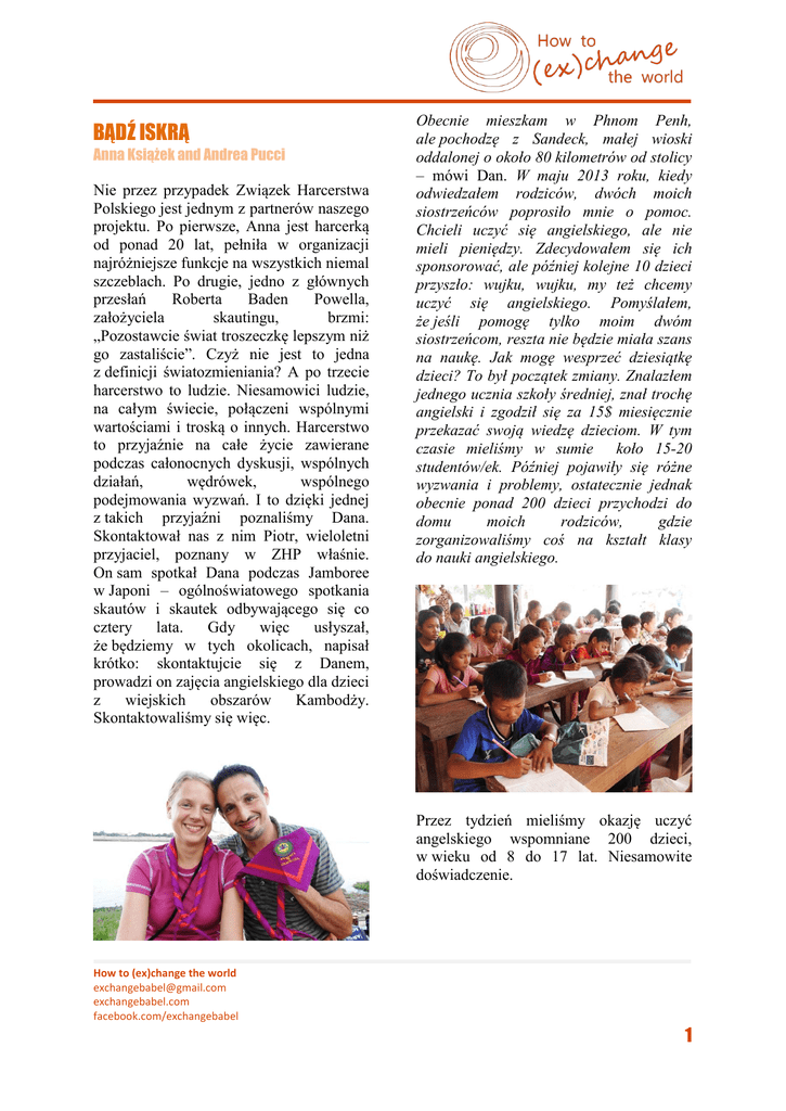 BĄDŹ ISKRĄ Anna Książek and Andrea Pucci Nie przez przypadek Związek Harcerstwa Polskiego jest jednym z partnerów naszego projektu. Po pierwsze, Anna jest harcerką od ponad 20 lat, pełniła w organizacji najróżniejsze funkcje na wszystkich niemal szczeblach. Po drugie, jedno z głównych przesłań Roberta Baden Powella, założyciela skautingu, brzmi: „Pozostawcie świat troszeczkę lepszym niż go zastaliście”. Czyż nie jest to jedna z definicji światozmieniania? A po trzecie harcerstwo to ludzie. Niesamowici ludzie, na całym świecie, połączeni wspólnymi wartościami i troską o innych. Harcerstwo to przyjaźnie na całe życie zawierane podczas całonocnych dyskusji, wspólnych działań, wędrówek, wspólnego podejmowania wyzwań. I to dzięki jednej z takich przyjaźni poznaliśmy Dana. Skontaktował nas z nim Piotr, wieloletni przyjaciel, poznany w ZHP właśnie. On sam spotkał Dana podczas Jamboree w Japoni – ogólnoświatowego spotkania skautów i skautek odbywającego się co cztery lata. Gdy więc usłyszał, że będziemy w tych okolicach, napisał krótko: skontaktujcie się z Danem, prowadzi on zajęcia angielskiego dla dzieci z wiejskich obszarów Kambodży. Skontaktowaliśmy się więc. Obecnie mieszkam w Phnom Penh, ale pochodzę z Sandeck, małej wioski oddalonej o około 80 kilometrów od stolicy – mówi Dan. W maju 2013 roku, kiedy odwiedzałem rodziców, dwóch moich siostrzeńców poprosiło mnie o pomoc. Chcieli uczyć się angielskiego, ale nie mieli pieniędzy. Zdecydowałem się ich sponsorować, ale później kolejne 10 dzieci przyszło: wujku, wujku, my też chcemy uczyć się angielskiego. Pomyślałem, że jeśli pomogę tylko moim dwóm siostrzeńcom, reszta nie będzie miała szans na naukę. Jak mogę wesprzeć dziesiątkę dzieci? To był początek zmiany. Znalazłem jednego ucznia szkoły średniej, znał trochę angielski i zgodził się za 15$ miesięcznie przekazać swoją wiedzę dzieciom. W tym czasie mieliśmy w sumie koło 15-20 studentów/ek. Później pojawiły się różne wyzwania i problemy, ostatecznie jednak obecnie ponad 200 dzieci przychodzi do domu moich rodziców, gdzie zorganizowaliśmy coś na kształt klasy do nauki angielskiego. Przez tydzień mieliśmy okazję uczyć angelskiego wspomniane 200 dzieci, w wieku od 8 do 17 lat. Niesamowite doświadczenie. How to (ex)change the world [email protected] exchangebabel.com facebook.com/exchangebabel 1 Pierwsze lekcje zaczynały się o 6.00 rano, jedna grupa. Od 7.00 do 11.00 przerwa, to czas zajęć w publicznej szkole. Od 12.00 do 14.00 kolejne dwie grupy, godzinna przerwa i ostatnie trzy grupy między 15.00 a 18.00. I tak od poniedziałku do soboty. Pamiętam jak kiedyś wróciłem do domu na weekend i zamierzałem spać do 7 czy nawet 8 rano, jak zazwyczaj robię w Phnom Penh. Ale tego dnia, wcześnie rano, dzieci przyszły do mojego domu i czekając na nauczyciela zaczęły czytać na głos angielską książkę, budząc mnie przy tym. Zacząłem słuchać: to było niesamowite! Potrafiły czytać po angielsku! Nigdy czegoś takiego nie widziałem. Czułem, że to prawdziwa zmiana. Nie tylko dzieci, ale i ich rodziców. Nie chodzi tu o angielski, ale o edukację w ogóle. Kiedy byłem mały, ludzie nie doceniali edukacji, mówili że jestem leniwy i dlatego idę do szkoły, uciekam od pomagania rodzicom w pracy na farmie. Ale praca na farmie ryżu jest bardzo ciężka i źle płatna. Próbuję pokazać im jak ważna jest edukacja i jak może zmienić ich życie. Ale nie mogę zmienić rodziców, muszą zmienić najpierw dzieci. Na początku Dan sam opłacał nauczyciela dla tych, którzy chcieli uczyć się angielskiego. Wkrótce jednak liczba studentów i studentek przerosła jego finansowe możliwości. Na szczęście, wzrastała nie tylko liczba dzieci uczestniczących w zajęciach, ale i świadomość rodziców jak bardzo to ważne. Dziś 91 studentów/ek wciąż opłacanych jest przez Dana, pozostałe 100 płaci około 2$ miesięcznie za codzienne lekcje. 2$... wydaje się niewiele, a jednak dla wielu z nich wykracza to poza finansowe możliwości. Sandeck to mała wioska, żyjąca wciąż w bardzo tradycyjny sposób. Mieszkanki i mieszkańcy utrzymują się głównie z uprawy ryżu – ciężkiej fizycznej pracy w pełnym słońcu. We wsi nie ma elektryczności ani bieżącej wody. Codzienne problemy sprowadzają się raczej do tego co dziś zjemy na kolację i czy mamy się w co ubrać, niż czy nauka angielskiego ma sens. Dla większości mieszkańców i mieszkanek byliśmy pierwszymi białymi ludźmi, których widzieli w swoim życiu. How to (ex)change the world [email protected] exchangebabel.com facebook.com/exchangebabel 2 Przychodzili czasem do domu rodziców Dana po prostu na nas popatrzeć. W ich spojrzeniu była ciekawość, zwykła ciekawość, pozbawiona dość powszechnego w Azji PołudniowoWschodniej oczekiwania, że staniemy się dla nich źródłem dochodu. Byli wdzięczni/e za naszą obecność, za pomoc, za możliwość spotkania z Barang. Wiele mieszkańców i mieszkanek wioski pytało mnie do czego potrzebny jest angielski. Mówiłem: jeśli znasz angielski, możesz rozmawiać z Barang. Oni wszystkich białych ludzi nazywają Barang, co dosłownie znaczy Francuz. Od czasów kolonializmu wierzą, że wszyscy biali to Francuzi. Pamiętają jak rodzice opowiadali im o Barang, że są wysocy i mówią szybko w jakimś dziwnym języku. Dan był jednym z tych, którzy mieli szansę spotykać Barang i współpracować z nimi na co dzień. Pracując w biurze skautowym w Kambodży utrzymywał kontakty ze skautami z całego świata, był kilka miesięcy w skautowym ośrodku Kandersteg w Szwajcarii oraz na wspomnianym już Jamboree w Japonii. Harcerstwo było jednym z elementów, które ukształtowały jego potrzebę zmieniania świata. Zawsze chętnie pomagam innym. Myślę, że to przez moje doświadczenia. Ja też byłem biedny, wiem jak t
