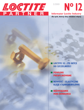 3/2001 Nº 12 Informator Loctite Industry dla tych, którzy chcà wiedzieç wi´cej LOCTITE 55 - PO NITCE DO SZCZELNOÂCI POW¸OKI PREAPLIKOWANE NOWOÂå - ELASTYCZNE KLEJE CYJANOAKRYLOWE ROZWIÑZANIE MINI-KONKURSU Drogi Czytelniku! Witamy Ci´ po urlopie! Mamy nadziej´, ˝e wypoczà∏eÊ i ze zdwojonà energià przystàpisz do wdra˝ania nowych rozwiàzaƒ w swoim miejscu pracy. Oto masz w r´kach numer, koƒczàcy pierwszy tuzin naszych spotkaƒ. Co przynosi owa „dwunastka“? GarÊç nowych pomys∏ów. Przewodnim tematem tego PARTNERA jest niegdyÊ ju˝ poruszany temat tzw. pow∏ok preaplikowanych LOCTITE. „Goràce“ nowoÊci! Szef Centrum Pow∏ok Preaplikowanych LOCTITE w Sosnowcu - Tomasz Kalbarczyk zaprezentuje „swoje“ produkty. Ch´tnie wracamy do tematu pow∏ok, gdy˝ jest to ga∏àê produkcji LOCTITE wcià˝ si´ rozwijajàca, w której przybywa produktów i nowych u˝ytkowników. Powracamy równie˝ do produktu LOCTITE 55 - „magicznej“ nitki do uszczelniania gwintów instalacji hydraulicznych i gazowych. A okazja ku temu jest niebywa∏a - otó˝ w∏aÊnie ten produkt otrzyma∏ na tegorocznych Targach Poznaƒskich Z¸OTY MEDAL! Dla tych, którzy jeszcze nie s∏yszeli o LOCTITE 55 - Janusz Wo∏owicz - autor nie tylko artyku∏u, ale równie˝ ekspery- mentalnych pokazów skutecznoÊci dzia∏ania tego produktu na Targach wyjaÊnia co to jest i jak to dzia∏a. Rozmawiamy dziÊ równie˝ z szefem polskiego oddzia∏u LOCTITE - dyrektorem Dariuszem ˚ychowiczem. Z „goràcych“ nowoÊci prezentujemy dwa produkty, które mogà zrewolucjonizowaç nasze podejÊcie do doboru kleju. Oto LOCTITE oferuje klej cyjanoakrylowy przeznaczony do materia∏ów elastycznych. Je˝eli jesteÊ fachowcem w dziedzinie klejenia - wiesz ju˝ co to znaczy. Znika jedna z typowych wad tych - skàdinàd znakomitych - klejów: sztywnoÊç i kruchoÊç spoiny. W numerze przedstawiamy te˝ wyniki i prawid∏owe rozwiàzanie naszego mini-konkursu. Okaza∏ si´ niezbyt trudny, bo wszystkie nades∏ane rozwiàzania by∏y prawid∏owe. Komisyjnie wylosowaliÊmy trzech zwyci´zców. Jak zwykle prezentujemy jednego z Autoryzowanych Dystrybutorów produktów LOCTITE. DziÊ jest to firma SEAL z Krakowa. Znana nie tylko jako firma handlowa, ale równie˝ jako producent odpowiedzialnych i cz´sto nietypowych uszczelnieƒ technicznych. Je˝eli jakimÊ nieszcz´Êliwym zbiegiem okolicznoÊci - nie dostajesz regularnie LOCTITE PARTNERA - zwróç si´ z tym do swojego konsultanta technicznego. Czekamy na listy i telefony! Redaktor Z∏oto dla LOCTITE! LOCTITE PARTNER rozmawia z Dyrektorem Business Unit LOCTITE - Dariuszem ˚ychowiczem - LT Partner: przede wszystkim - gratulacje od redakcji PARTNERA! Z∏oty medal na Targach Poznaƒskich ‘2001 dla LOCTITE 55 to chyba ogromny sukces dla Firmy! - D˚: sukces, dodam jednak dla Êcis∏oÊci, ˝e jesteÊmy jednym z kilku laureatów. Dyplom i medal sà zawsze mi∏ym uznaniem za osiàgni´cie techniczne. O prawdziwym sukce- sie powiem jednak dopiero wtedy, gdy ka˝dy monter instalacji wodnych i gazowych wyrzuci ze swej torby ró˝ne sznury i taÊmy. A gratulacje i podzi´kowania nale˝à si´ przede wszystkim twórcom i obs∏udze stoiska (w tym tak˝e Tobie), które sta∏y na najwy˝szym poziomie. Dri - Loc 2040 Dri - Loc 2040 jest europejskà wersjà amerykaƒskiego Dri - Loc 204, który podbi∏ rynek amerykaƒski dzi´ki stabilnoÊci momentu zrywajàcego. Dodatkowymi zaletami sà: - stosunkowo wysoka odpornoÊç na zabrudzenia powierzchni; - zadziwiajàco wysoki moment zrywajàcy na stali nierdzewnej - czyli „dzieƒ dobry AGD“ ! - wysoki moment demonta˝owy, czyli daleka droga od zerwania do zluzowania; - mo˝liwoÊç regulacji momentu demonta˝owego za pomocà sk∏adu; ta niezmiernie cenna cecha pozwala dobraç moc po∏àczenia do wymagaƒ klienta. Wszystkie te cechy produkt zawdzi´cza unikalnej kombinacji dwóch typów mikrokapsu∏, które powodujà ˝e podczas monta˝u pow∏oka z suchej i sta∏ej, staje si´ praktycznie p∏ynna. Stàd mo˝liwoÊç dok∏adnego rozprowadzenia produktu i wype∏nienia wolnych przestrzeni pomi´dzy gwintami. Dri - Loc 2040 spe∏nia wszystkie wymagania wytrzyma∏oÊciowe normy DIN 267 cz´Êç 27 oraz wi´kszoÊç wymagaƒ odpornoÊci chemicznej. Zaledwie w ciàgu 1 roku od wprowadzenia 2040 zosta∏ „królem Dri -Loca“. Jego pochodna Dri - Loc 2045 aspiruje do dopuszczenia do General Motors [szczególnie wysokie wymagania dotyczàce stabilnoÊci momentu zrywajàcego]. Po sukcesie DL 2040, Loctite oficjalnie wycofa∏ si´ z dostaw DL 204 do Europy. NOWY PRODUKT CPP „DL 204 podbi∏ rynek amerykaƒski dzi´ki stabilnoÊci momentu zrywajàcego.“ Dri - Loc Plastic - nowa technologia pow∏ok preaplikowanych Dri - Loc Plastic [w skr. DLP]: sucha w dotyku pow∏oka poliamidowa nanoszona na 1/3 obwodu gwintu. Jej dzia∏anie opiera si´ na mechanicznym zabezpieczeniu gwintu. Zalety Dri - Loc Plastic: - sta∏y moment demonta˝owy, 5-krotna regulacja lub demonta˝, jednakowe parametry na wszystkich powierzchniach, dzia∏a natychmiast po monta˝u, gotowoÊç do u˝ycia - 20 lat, mo˝liwe zastosowanie Êrodków smarujàcych u∏atwiajàcych wkr´canie, ró˝ne kolory, zastosowanie na materia∏ach zgodnych z normami ISO 898 i ISO 3506 [stale konstrukcyjne i nierdzewne], temperatura pracy -55°C do +120 °C. Zastosowania Dri - Loc Plastic: motoryzacja, elektronika, sprz´t sportowy, sprz´t AGD, przemys∏ meblarski, narz´dzia elektromechaniczne, instalacje elektryczne, budownictwo i maszyny budowlane. Lista zastosowaƒ pow∏ok Dri - Loc Plastic poszerza si´ z ka˝dym rokiem. Najnowszym osiàgni´ciem jest nanoszenie tej pow∏oki na mikroÊruby od fi 0,6 mm do fi 2,5 mm, wykonane ze stali nierdzewnej. e-mail: [email protected] Us∏uga nanoszenia pow∏oki preaplikowanej Dri - Loc Plastic znajdzie si´ w ofercie Centrum Pow∏ok Preaplikowanych Loctite w Sosnowcu z poczàtkiem IV kwarta∏u teg