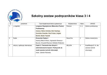 Szkolny zestaw podręczników klasa 3 i 4 lp 1. przedmiot j. angielski Tytuł książki/autor/seria wydawnicza Longman Repetytorium Maturalne Poziom Wydawnictwo klasa UWAGI Pearson 3i4 Zakres podstawowy Nowa Era 3 Zakres rozszerzony HELION 3 Kwalifikacja E.14. dla Podstawowy Autorzy: Marta Umińska, Bob Hastings, Dominika Chandler, Rod Fricker, Angela Bandis, Beata Trapnell 2 fizyka Zrozumieć fizykę 2 Autorzy:Marcin Braun, Agnieszka SewerynByczuk, Krzysztof Byczuk, Elżbieta Wójtowicz 3 witryny i aplikacje internetowe Część 2. Tworzenie baz danych i administrowanie bazami. Podręcznik do zawodu technik nauki zawodu technik informatyk informatyk Autor: Jolanta Pokorska 4 witryny i aplikacje internetowe Część 3. Tworzenie aplikacji internetowych. HELION 3 Kwalifikacja E.14. dla Podręcznik do nauki zawodu technik zawodu technik informatyk informatyk Autor: Jolanta Pokorska 5 j.angielski w logistyce Logistics Management. Market Leader Pearson 3I4 Autor: Pilbeam Adrian, O’Driscoll Nina 6 7 Prowadzenie działalności Prowadzenie działalności gospodarczej gospodarczej Autor: Gorzelny Teresa Systemy baz danych Bazy danych i systemy baz danych Administrowanie bazami danych Autor: Donka Przemysław Dla zawodu technik logistyk WSiP 3 Dla zawodu technik informatyk WSiP 3 Dla zawodu technik informatyk 8 Programowanie aplikacji Aplikacje internetowe internetowych Autor: Łokińska Małgorzata WSiP 3 Dla zawodu technik informatyk