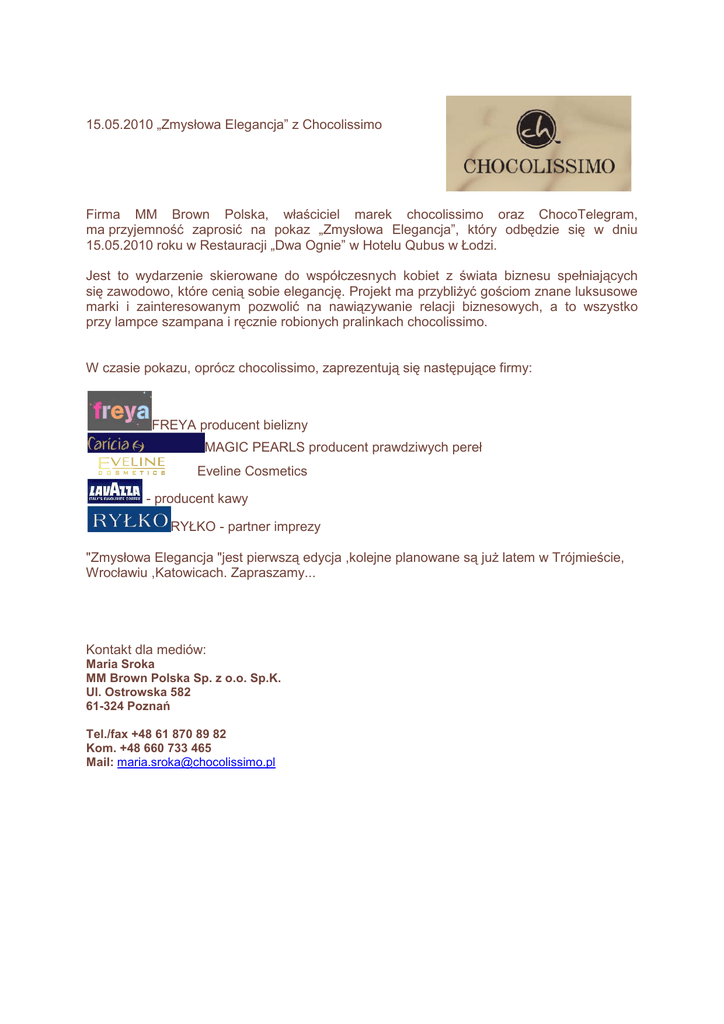 15.05.2010 „Zmysłowa Elegancja” z Chocolissimo Firma MM Brown Polska, właściciel marek chocolissimo oraz ChocoTelegram, ma przyjemność zaprosić na pokaz „Zmysłowa Elegancja”, który odbędzie się w dniu 15.05.2010 roku w Restauracji „Dwa Ognie” w Hotelu Qubus w Łodzi. Jest to wydarzenie skierowane do współczesnych kobiet z świata biznesu spełniających się zawodowo, które cenią sobie elegancję. Projekt ma przybliŜyć gościom znane luksusowe marki i zainteresowanym pozwolić na nawiązywanie relacji biznesowych, a to wszystko przy lampce szampana i ręcznie robionych pralinkach chocolissimo. W czasie pokazu, oprócz chocolissimo, zaprezentują się następujące firmy: FREYA producent bielizny MAGIC PEARLS producent prawdziwych pereł Eveline Cosmetics - producent kawy RYŁKO - partner imprezy "Zmysłowa Elegancja "jest pierwszą edycja ,kolejne planowane są juŜ latem w Trójmieście, Wrocławiu ,Katowicach. Zapraszamy... Kontakt dla mediów: Maria Sroka MM Brown Polska Sp. z o.o. Sp.K. Ul. Ostrowska 582 61-324 Poznań Tel./fax +48 61 870 89 82 Kom. +48 660 733 465 Mail: [email protected]