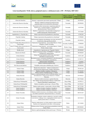 Lista beneficjentów NGR, którzy podpisali umowy o dofinansowanie z SW - PO Ryby 2007-2013 Wartość dofinansowania wg podpisanej umowy Lp. Beneficjent Tytuł operacji Miejsce realizacji operacji (gmina) 1 Aftarczuk Stanisław Remont i wyposażenie (powstanie) agroturystyki "Olimp". Człopa 199 999,99 2 Aninowska-Żurawicz Karolina "Remont i adaptacja istniejącego pomieszczenia gospodarczego na cele turystyczno-rekreacyjne" Trzcianka 200 000,00 3 Aninowska-Żurawicz Karolina Poszerzenie oferty turystycznej o organizację spływów kajakowych i wynajem kajaków w gospodarstwie agroturystycznym "Żurawiczówka" Trzcianka 49 879,80 4 Aninowska-Żurawicz Karolina Budowa i wyposażenie wiaty biesiadno-noclegowej w osadzie turystycznej "Żurawiczówka" Trzcianka 99 720,00 5 Aquabiofarm A. Chęciński Sp. j. Zakup wyposażenia dla gospodarstwa rybackiego. Trzcianka 43 062,86 6 Chęciński Andrzej "Zakup wyposażenia dla gospodarstwa rybackiego" Trzcianka 22 980,00 7 Chęciński Andrzej Dostosowanie budynku mieszkalnego oraz jego otoczenia do świadczenia usług agroturystycznych. Trzcianka 449 680,20 8 Astra TV Studio Maria Wojciechowicz Litowczenko Nadnotecka Grupa Rybacka - przewodnik filmowy. Gmina Szydłowo, Gmina Trzcianka. Trzcianka, Szydłowo 50 000,00 9 Astra TV Studio Maria Wojciechowicz Litowczenko Nadnotecka Grupa Rybacka - przewodnik filmowy. Gmina Wieleń. Gmina Człopa. Wieleń, Człopa 50 000,00 10 Bródka Jacek Gospodarstwo Agroturystyczne "Zagroda Ułańska". Człopa 300 000,00 11 Burakowski Marek Trzcianka 300 000,00 12 Cebula Zdzisław Szydłowo 46 611,60 13 Cebula Zdzisław Restrukturyzacja i reorientacja działalności rybackiej poprzez rozbudowę infrastruktury gospodarstwa. Szydłowo 112 067,35 14 15 Cebula Zdzisław Cebula Zdzisław Zakup kosiarki samojezdnej. Budowa budynku gospodarczego Szydłowo Szydłowo 8 164,87 10 927,77 16 Der-Staszewska Barbara Kompleks rekreacyjno-rehabilitacyjny Tarnowo. Szydłowo 300 000,00 17 Gmina Człopa Bezpiecznie nad jezioro – budowa ścieżek pieszo – rowerowych do miejscowości Trzebin i Dzwonowo. Człopa 795 051,64 18 19 Gmina Człopa Gmina Człopa Człopa Człopa 117 181,87 154 000,00 20 Gmina Drawsko Drawsko 210 444,22 21 Gmina Drawsko Budowa ścieżki rowerowej w gminie Drawsko. Drawsko 933 724,68 22 Gmina Krzyż Wielkopolski Sieć szlaków turystycznych przy Drawie i wokół jezior Puszczy Drawskiej w gminie Krzyż Krzyż Wlkp. 144 985,12 23 Gmina Krzyż Wielkopolski Budowa kompleksu sportowego w Krzyżu Wlkp. Krzyż Wlkp. 610 502,45 24 Gmina Krzyż Wielkopolski Budowa parku sportu i wypoczynku w Krzyżu Wlkp. Krzyż Wlkp. 207 275,88 25 26 Gmina Szydłowo Gmina Szydłowo Budowa świetlicy wiejskiej w Szydłowie Budowa świetlicy wiejskiej w Tarnowie. Szydłowo Szydłowo 960 000,00 176 772,00 27 Gmina Trzcianka Budowa ścieżki rowerowej z oświetleniem, budowa slipów oraz budowa pomostów nad jeziorem Sarcz w Trzciance. Trzcianka 868 833,69 28 Gmina Trzcianka Przebudowa budynku centrum wędkarstwa, turystyki wodnej i ratownictwa wodnego wraz z zagospodarowaniem terenu w rejonie jeziora Sarcz w Trzciance. Trzcianka 248 348,18 29 Gmina Wałcz Poprawa atrakcyjności wsi Golce poprzez remont świetlicy wiejskiej oraz zagospodarowanie placu rekreacyjnego. Wałcz 183 180,00 30 Gmina Wałcz Ochrona jeziora Chwiram zagrożonego gospodarką ściekową Gminy Wałcz. Wałcz 1 000 000,00 31 Gmina Wieleń Budowa ogólnodostępnego boiska sportowego w Wieleniu. Wieleń 1 159 530,63 Budowa restauracji rybnej „TAWERNA” z zapleczem noclegowym i rekreacyjnym. Zakup roboczego pojazdu użytkowego, przyczepy i zbiorników do przewozu ryb. Budowa świetlicy wiejskiej w Drzonowie. Budowa boiska wielofunkcyjnego w Człopie. Budowa ogólnodostępnego boiska wielofunkcyjnego wraz z odwodnieniem w miejscowości Pęckowo w Gminie Drawsko. 32 Gospodarstwo Rybackie Tarnowo Eugeniusz Bogdan Restrukturyzacja formalna i technologiczna Gospodarstwa Rybackiego Tarnowo - Eugeniusz Bogdan. Szydłowo 450 000,00 33 Gospodarstwo Rybackie Tarnowo Eugeniusz Bogdan Reorientacja i dywersyfikacja działalności rybackiej poprzez budowę i wyposażenie budynku wielofunkcyjnego służącego prowadzonej działalności wraz z wyposażeniem i zagospodarowaniem terenu. Szydłowo 450 000,00 34 In Plus Krzysztof Bogdanowicz Obszar NGR 40 120,00 35 In Plus Krzysztof Bogdanowicz Obszar NGR 44 625,00 36 IPM Sp. z o.o. Sp. komandytowa Krzyż Wlkp. 390 000,00 37 38 Jarski Andrzej Liszkiewicz Halina Wirtualne wycieczki po obszarze NGR - promocja atrakcyjności turystycznej obszaru Z GPS przez obszar NGR – promocja szlaków turystycznych obszaru "Ryba, woda i przygoda" - reorientacja działalności w Pestkownicy na turystykę w oparciu o lokalne atrakcje wodne i leśne. Amury u Andrzeja. Rybacki kalendarz NGR. Człopa Obszar NGR 223 764,00 48 190,75 39 Mariusz Berent - PHU "Mario" Rozbudowa Agroturystyki "Kozia Baba" w Tarnowie. Szydłowo 300 000,00 40 Miejsko - Gminny Ośrodek Kultury w Wieleniu Regionalne rozmaitOŚCI - Piknik Rybny w Wieleniu skuteczną metodą promocji obszaru należącego do NGR Wieleń 40 469,37 41 Miejsko - Gminny Ośrodek Kultury w Wieleniu Regionalne rozmaitOŚCI - Piknik Rybny w Wieleniu sprawdzoną metodą promocji obszaru należącego do NGR. Wieleń 49 994,72 42 Miejsko - Gminny Ośrodek Kultury w Wieleniu "Regionalne rozmaitOŚCI" - Piknik Rybny w Wieleniu sprawdzoną metodą promocji obszaru należącego do Nadnoteckiej Grupy Rybackiej. Wieleń 49 999,22 43 Moździerska Janina Budowa domku letniskowego oraz małej infrastruktury turystycznej w szczególności miejsc wypoczynkowych i biwakowych we wsi Tarnowo gm. Szydłowo. Szydłowo 87 282,91 44 Nowak Danuta Baza turystyczna RANCZO Wałcz 200 000,00 45 Nowak Danuta Doposażenie i przystosowanie bazy turystycznej "RANCZO". Wałcz 105 000,00 46 Nowak Krzysztof Budowa i urządzenie bazy turystycznej "APEX" w Nałęczu. Człopa 300 000,00 47 ON PZW w Pile Krzyż Wlkp. 33 263,44 48 ON PZW w Pile Krzy