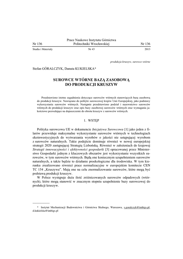 Nr 136 Studia i Materiały Prace Naukowe Instytutu Górnictwa Politechniki Wrocławskiej Nr 43 Nr 136 2013 produkcja kruszyw, surowce wtórne Stefan GÓRALCZYK, Danuta KUKIELSKA* SUROWCE WTÓRNE BAZĄ ZASOBOWĄ DO PRODUKCJI KRUSZYW Przedstawiono istotne zagadnienia dotyczące surowców wtórnych stanowiących bazę zasobową do produkcji kruszyw. Nawiązano do polityki surowcowej krajów Unii Europejskiej, jako podstawy wykorzystania surowców wtórnych. Następnie przedstawiono podział i nazewnictwo surowców wtórnych do produkcji kruszyw oraz opis bazy zasobowej surowców wtórnych oraz wymagania jakościowe pozwalające na dopuszczenie do obrotu kruszyw z surowców wtórnych. 1. WSTĘP Polityka surowcowa UE w dokumencie Inicjatywa Surowcowa [1] jako jeden z filarów przewiduje maksymalne wykorzystanie surowców wtórnych w technologiach ekoinwestycyjnych do wytwarzania wyrobów o jakości nie ustępującej wyrobom z surowców naturalnych. Takie podejście dominuje również w nowej europejskiej strategii 2020 zastępującej Strategię Lizbońską. Również w założeniach do krajowej Strategii innowacyjności i efektywności gospodarki [3] opracowanej przez Ministerstwo Gospodarki jednym z kluczowych obszarów jest wykorzystanie wszystkich surowców, w tym surowców wtórnych. Będą one koniecznym uzupełnieniem surowców naturalnych, a także będzie to działanie proekologiczne dla środowiska. W tym kierunku zrealizowano również prace normalizacyjne w europejskim komitecie CEN TC 154 „Kruszywa”. Mają one na celu znormalizowanie surowców, które mogą być podstawą produkcji kruszyw. W Polsce występuje duża ilość zróżnicowanych surowców odpadowych (wtórnych), które mogą stanowić w znacznym stopniu uzupełnienie bazy surowcowej do produkcji kruszyw. __________ * Instytut Mechanizacji Budownictwa i Górnictwa Skalnego, Warszawa, [email protected], [email protected] 50 2. PODZIAŁ I NAZEWNICTWO KRUSZYW Pakiet norm, które dotyczą kruszyw, obok wymagań dla kruszyw przeznaczonych do określonego zastosowania podaje także podział kruszyw. Przewidywane rodzaje kruszyw wymienione są w normach [6–12]. Definiują one kruszywo jako materiał ziarnisty stosowany w budownictwie. Wyróżnia się trzy podstawowe rodzaje kruszywa: naturalne, sztuczne, z recyklingu. W latach 2010–2011 Komitet CEN TC 154 w powyższych nazwach, w ramach realizowanej ich nowelizacji, wprowadził uściślony podział kruszyw. Wprowadził również normatywny załącznik A, który zawiera wszystkie surowce oraz źródła ich pochodzenia, które mogą być bazą do produkcji kruszyw (tab. 2). Poszczególne rodzaje kruszyw zdefiniowano następująco: Kruszywa naturalne to kruszywa pochodzenia mineralnego, które poza obróbką mechaniczną nie zostały poddane żadnej innej obróbce. Kruszywa sztuczne to kruszywa pochodzenia mineralnego, uzyskane w wyniku procesu przemysłowego obejmującego termiczną lub inną modyfikację. Kruszywa z recyklingu to takie kruszywa, które powstały w wyniku przeróbki nieorganicznego materiału zastosowanego poprzednio w budownictwie. Ze względu na rodzaj i pochodzenie surowca do produkcji kruszyw zaproponowano podział kruszyw (tab. 1). Tabela 1 Podział kruszyw Surowce Pierwotne kruszywa naturalne rodzaje surowców do produkcji kruszyw wg tabeli 3 Wtórne kruszywa sztuczne kruszywa z recyklingu rodzaje surowców wg tabeli 2 rodzaje surowców wg tabeli 2 3. SUROWCE WTÓRNE DO PRODUKCJI KRUSZYWA Zaproponowany powyżej podział kruszyw budzi jednak pewne zastrzeżenia. Zgodnie z definicją kruszyw sztucznych obejmują one grupę kruszyw wyprodukowanych z surowców pochodzenia mineralnego (np. gliny, iły, łupki itp.), które poddane zostały w procesach przemysłowych obróbce cieplnej lub innej modyfikacji. Produkowana jest również (nie tylko w Polsce) duża grupa kruszyw z surowców odpadowych, które oprócz uszlachetniania (kruszenie i klasyfikacja sitowa) nie podlegają żadnej innej modyfikacji. Czy zatem kruszywa otrzymywane z przeróbki mechanicznej żużli (pomiedziowych, stalowniczych, wielkopiecowych) należy zaliczyć do grupy kruszyw sztucznych? 51 Normy dotyczące kruszyw, pomimo że ustalały wymagania dla tej grupy kruszyw, nie precyzowały tego. Stąd w Komitecie Technicznym CEN/TC 154 podjęte zostały prace, aby tę nieścisłość w podziale kruszyw usunąć. W latach 2010–2011 dokonano przeglądu norm PN-EN wymienionych w rozdziale 2, wprowadzając załącznik A Źródła surowców, wg norm dotyczących kruszyw, wymienionych w rozdz. 2. Powyższe ustalenia poprzedzone były uregulowaniami w następujących dokumentach: Dokument Komisji Europejskiej End of Waste – Aggregates Case Study z 5 marca 2007 r. [13] proponował zamiast nazwy „kruszywa sztuczne” przyjąć nazwę kruszywa wtórne (secondary aggregates) dla kruszyw z surowców wtórnych (produktów) wyprodukowanych w procesach przemysłowych. Zgodny z tą propozycją był dokument CEN/TC154/TG10/N736 Materiały wtórne. Kruszywa sztuczne. Raport końcowy dla kruszyw ze złóż wtórnych [14]. W dokumencie tym zaproponowano nową klasyfikację kruszyw sztucznych, produkowanych z różnych rodzajów surowców wtórnych, którą przedstawiono w tabelach 1 i 2. Podział ten w niezmiennej formie znajduje się również w normach dotyczących kruszyw w załączniku A. Z podanej klasyfikacji wynika, że kruszywa sztuczne mogą być produkowane z wtórnych surowców odpadowych powstających w energetyce (popioły, żużle), hutnictwie żelaza i metali kolorowych, ciepłownictwie, przemyśle ceramicznym, górnictwie. Określenie HZ (historia zastosowania) obejmuje informacje dotyczące znajomości pochodzenia surowca do produkcji kruszywa. W przypadku kruszyw z recyklingu zawiera one dane dotyczące rodzaju obiektu, z którego surowiec pochodzi, jego wieku itp. Tabela 2 Kategorie i status surowców do produkcji kruszyw wg norm PN-EN dotyczących kruszyw (rozdz. 2) Wymagania wg d
