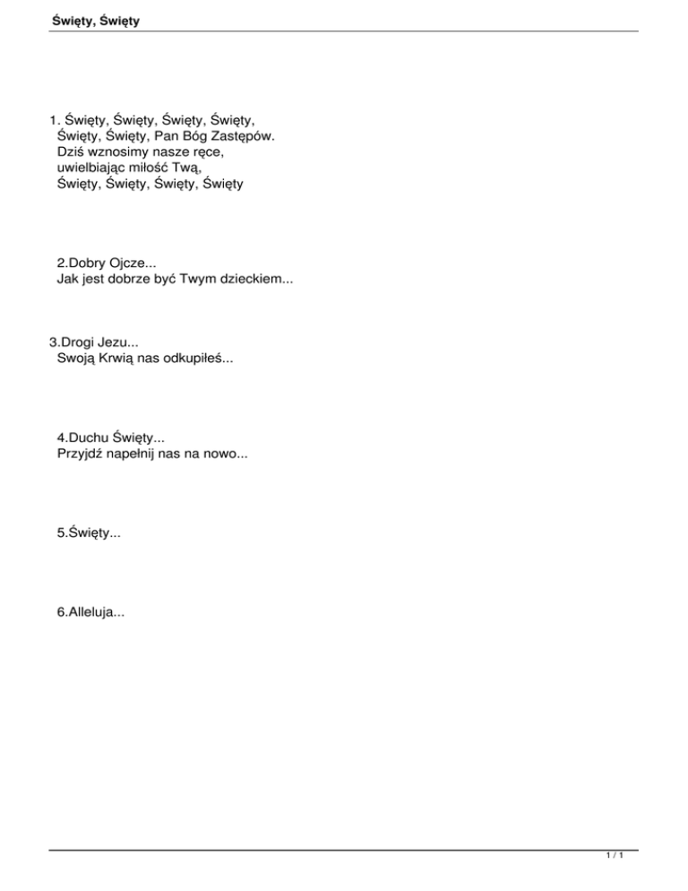 Święty, Święty 1. Święty, Święty, Święty, Święty, Święty, Święty, Pan Bóg Zastępów. Dziś wznosimy nasze ręce, uwielbiając miłość Twą, Święty, Święty, Święty, Święty 2.Dobry Ojcze... Jak jest dobrze być Twym dzieckiem... 3.Drogi Jezu... Swoją Krwią nas odkupiłeś... 4.Duchu Święty... Przyjdź napełnij nas na nowo... 5.Święty... 6.Alleluja... 1/1