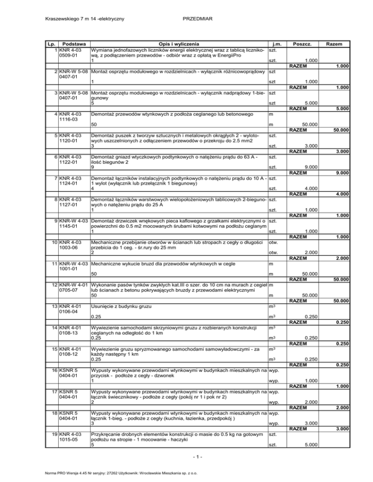 Kraszewskiego 7 m 14 -elektryczny Lp. Podstawa 1 KNR 4-03 0509-01 PRZEDMIAR Opis i wyliczenia j.m. Wymiana jednofazowych liczników energii elektrycznej wraz z tablicą liczniko- szt. wą, z podłączeniem przewodów - odbiór wraz z opłatą w EnergiiPro 1 szt. 2 KNR-W 5-08 Montaż osprzętu modułowego w rozdzielnicach - wyłącznik różnicowoprądowy szt 0407-01 1 szt 3 KNR-W 5-08 Montaż osprzętu modułowego w rozdzielnicach - wyłącznik nadprądowy 1-bie- szt 0407-01 gunowy 5 szt 4 KNR 4-03 1116-03 5 KNR 4-03 1120-01 6 KNR 4-03 1122-01 7 KNR 4-03 1124-01 8 KNR 4-03 1127-01 Demontaż przewodów wtynkowych z podłoża ceglanego lub betonowego m 50 m Demontaż puszek z tworzyw sztucznych i metalowych okrągłych 2 - wylotowych uszczelnionych z odłączeniem przewodów o przekroju do 2.5 mm2 3 szt. Demontaż gniazd wtyczkowych podtynkowych o natężeniu prądu do 63 A ilość biegunów 2 9 szt. szt. szt. Demontaż łączników instalacyjnych podtynkowych o natężeniu prądu do 10 A - szt. 1 wylot (wyłącznik lub przełącznik 1 biegunowy) 4 szt. Demontaż łączników warstwowych wielopołożeniowych tablicowych 2-bieguno- szt. wych o natężeniu prądu do 25 A 1 szt. 9 KNR-W 4-03 Demontaż drzwiczek wnękowych pieca kaflowego z grzałkami elektrycznymi o szt. 1145-01 powierzchni do 0.5 m2 mocowanych śrubami kotwowymi na podłożu ceglanym 1 szt. 10 KNR 4-03 1003-06 Mechaniczne przebijanie otworów w ścianach lub stropach z cegły o długości przebicia do 1 ceg. - śr.rury do 25 mm 2 11 KNR-W 4-03 Mechaniczne wykucie bruzd dla przewodów wtynkowych w cegle 1001-01 50 14 KNR 4-01 0108-13 15 KNR 4-01 0108-12 16 KSNR 5 0404-01 17 KSNR 5 0404-01 18 KSNR 5 0404-01 19 KNR 4-03 1015-05 otw. m m3 0.25 m3 Wywiezienie samochodami skrzyniowymi gruzu z rozbieranych konstrukcji ceglanych na odległość do 1 km 0.25 m3 Wywiezienie gruzu spryzmowanego samochodami samowyładowczymi - za każdy następny 1 km 0.25 m3 m3 m3 Wypusty wykonywane przewodami wtynkowymi w budynkach mieszkalnych na wyp. przycisk - podłoże z cegły - dzwonek 1 wyp. Wypusty wykonywane przewodami wtynkowymi w budynkach mieszkalnych na wyp. łącznik świecznikowy - podłoże z cegły (pokój nr 1 i pok nr 2) 2 wyp. Wypusty wykonywane przewodami wtynkowymi w budynkach mieszkalnych na wyp. łącznik 1-bieg. - podłoże z cegły (kuchnia, łazienka, przedpokój ) 3 wyp. -1- Norma PRO Wersja 4.45 Nr seryjny: 27262 Użytkownik: Wrocławskie Mieszkania sp. z o.o. 1.000 RAZEM 1.000 1.000 RAZEM 1.000 5.000 RAZEM 5.000 50.000 RAZEM 50.000 3.000 RAZEM 3.000 9.000 RAZEM 9.000 4.000 RAZEM 4.000 1.000 RAZEM 1.000 1.000 RAZEM 1.000 2.000 RAZEM 2.000 50.000 RAZEM 50.000 50.000 RAZEM 50.000 0.250 RAZEM 0.250 0.250 RAZEM 0.250 0.250 RAZEM 0.250 1.000 RAZEM 1.000 2.000 RAZEM 2.000 3.000 RAZEM 3.000 m Usunięcie z budynku gruzu Przykręcanie drobnych elementów konstrukcji o masie do 0.5 kg na gotowym podłożu na stropie - 1 mocowanie - haczyki 5 Razem otw. 12 KNR-W 4-01 Wykonanie pasów tynków zwykłych kat.III o szer. do 10 cm na murach z cegieł m 0705-07 lub ścianach z betonu pokrywających bruzdy z przewodami elektrycznymi 50 m 13 KNR 4-01 0106-04 Poszcz. szt. szt. 5.000 Kraszewskiego 7 m 14 -elektryczny Lp. Podstawa 20 KSNR 5 0404-03 21 KSNR 5 0404-03 PRZEDMIAR Opis i wyliczenia j.m. Wypusty wykonywane przewodami wtynkowymi w budynkach mieszkalnych na wyp. gniazda wtykowe 10A i 10A/Z podłoże z cegły ( pokoje ) 7 wyp. Wypusty wykonywane przewodami wtynkowymi w budynkach mieszkalnych na wyp. gniazdo wtykowe 10A i 10A/Zpodłoże z cegły (kuchnia) 2 wyp. 22 KNR-W 4-02 Dostawa i montaż bojlera elektrycznego BIAWAR 50L/ 230V (łazienka) 0150-03 ANALOGIA 1 szt. 23 KNR-W 4-02 Dostawa i montaż drabinki grzewczej 300W/230V (łazienka) 0150-03 ANALOGIA 1 szt. 24 KNR-W 4-02 Dostawa i montaż pieca akumulacyjnego DIMPLEX WMX 706 (230V, 850W) 0150-03 (kuchnia) ANALOGIA 1 szt. 25 KSNR 5 0404-03 szt. szt. szt. Wypusty wykonywane przewodami wtynkowymi w budynkach mieszkalnych na wyp. gniazdo wtykowe 10A i 10A/Zpodłoże z cegły (łazienka - bojler, drabinka grzejna) 2 wyp. 26 KNR-W 5-08 Sprawdzenie samoczynnego wyłączenia zasilania - próby działania wyłącznika pomiar 0902-05 różnicowoprądowego - pierwszy 1 pomiar 27 KNR 4-03 1202-01 Sprawdzenie i pomiar kompletnego 1-fazowego obwodu elektrycznego niskie- pomiar go napięcia . 5 pomiar . Poszcz. RAZEM 7.000 RAZEM 7.000 2.000 RAZEM 2.000 1.000 RAZEM 1.000 1.000 RAZEM 1.000 1.000 RAZEM 1.000 2.000 RAZEM 2.000 1.000 RAZEM 1.000 5.000 RAZEM 28 KNR 4-03 1205-05 Pierwszy pomiar skutecznosci zerowania pomiar . pomiar . 1 Następny pomiar skuteczności zerowania pomiar . pomiar . 17 Norma PRO Wersja 4.45 Nr seryjny: 27262 Użytkownik: Wrocławskie Mieszkania sp. z o.o. 1.000 17.000 RAZEM -2- 5.000 1.000 RAZEM 29 KNR 4-03 1205-06 Razem 5.000 17.000