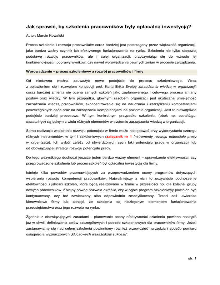Jak sprawić, by szkolenia pracowników były opłacalną inwestycją? Autor: Marcin Kowalski Proces szkolenia i rozwoju pracowników coraz bardziej jest postrzegany przez większość organizacji, jako bardzo ważny czynnik ich efektywnego funkcjonowania na rynku. Szkolenia nie tylko stanowią podstawę rozwoju pracowników, ale i całej organizacji, przyczyniając się do wzrostu jej konkurencyjności, poprawy wyników, czy nawet wprowadzania pewnych zmian w procesie zarządzania. Wprowadzenie – proces szkoleniowy a rozwój pracowników i firmy Od niedawna można zauważyć nowe podejście do procesu szkoleniowego. Wraz z pojawieniem się i rozwojem koncepcji prof. Karla Erika Sveiby zarządzania wiedzą w organizacji, coraz bardziej zmienia się ocena samych szkoleń jako zaplanowanego i celowego procesu zmiany postaw oraz wiedzy. W tym przypadku, głównym zasobem organizacji jest skuteczna umiejętność zarządzania wiedzą pracowników, skoncentrowanie się na nauczaniu i zarządzaniu kompetencjami poszczególnych osób oraz na zarządzaniu kompetencjami na poziomie organizacji. Jest to niewątpliwie podejście bardziej procesowe. W tym konkretnym przypadku szkolenia, (obok np. coachingu, mentoringu) są jednym z wielu różnych elementów w systemie zarządzania wiedzą w organizacji. Sama realizacja wspierania rozwoju potencjału w firmie może następować przy wykorzystaniu szeregu różnych instrumentów, w tym i szkoleniowych (załącznik nr 1 Instrumenty rozwoju potencjału pracy w organizacji). Ich wybór zależy od stwierdzonych cech luki potencjału pracy w organizacji lub od obowiązującej strategii rozwoju potencjału pracy. Do tego wszystkiego dochodzi jeszcze jeden bardzo ważny element – sprawdzenie efektywności, czy przeprowadzone szkolenie lub proces szkoleń był opłacalną inwestycją dla firmy. Istnieje kilka powodów przemawiających za przeprowadzeniem oceny programów dotyczących wspierania rozwoju kompetencji pracowników. Najważniejszy z nich to oczywiście podnoszenie efektywności i jakości szkoleń, które będą realizowane w firmie w przyszłości np. dla kolejnej grupy nowych pracowników. Kolejny powód pozwala określić, czy w ogóle program szkoleniowy powinien być kontynuowany, czy też zawieszony albo odpowiednio zmodyfikowany. Trzeci zaś utwierdza kierownictwo firmy lub zarząd, że szkolenia są niezbędnym elementem funkcjonowania przedsiębiorstwa oraz jego rozwoju na rynku. Zgodnie z obowiązującymi zasadami - planowanie oceny efektywności szkolenia powinno nastąpić już w chwili definiowania celów szczegółowych i potrzeb szkoleniowych dla pracowników firmy. Jeżeli zastanawiamy się nad celem szkolenia powinniśmy również przewidzieć narzędzia i sposób pomiaru osiągnięcia wyznaczonych „kluczowych wskaźników sukcesu”. str. 1 Dlaczego w ogóle warto oceniać efektywność szkoleń? Peter Bramley wyróżnia cztery główne cele oceny: uzyskanie informacji zwrotnej, kontrola, badania oraz 3 ingerencja w procesy szkoleniowe . Dzięki informacji zwrotnej możemy czuwać nad jakością danego szkolenia oraz przebiegiem prowadzonych zajęć. Dla uczestników jest ona uzupełnieniem procesu uczenia się. Dla trenerów zaś wskazówką efektywności stosowanych metod oraz dowodem osiągania określonych celów szkolenia. Stanowi ona także pomoc w dopracowywaniu programów bieżących i lepszym planowaniu kolejnych szkoleń pracowniczych. Informacja zwrotna ma największe znaczenie dla sposobu prowadzenia pierwszych dwóch lub trzech zajęć danego typu. Kontrola natomiast pomaga stwierdzić, czy organizowane szkolenia pracowników są w ogóle przydatne i jakie są ich rzeczywiste koszty. W niektórych organizacjach ocena taka jest dokonywana systematycznie tylko po to, by monitorować wszystkie podejmowane działania szkoleniowe. Ocena efektywności szkoleń pracowników jest także procesem badawczym pozwalającym wzbogacić wiedzę merytoryczną na temat ogólnych zasad i stosowanych praktyk prowadzenia szkoleń pracowniczych. Pozwala poznać sposoby przyswajania informacji oraz czynniki ułatwiające zastosowanie zdobytej wiedzy i umiejętności w pracy. Ponadto badania umożliwiają doskonalenie technik wykorzystywanych do oceny szkoleń mających na celu udzielanie informacji zwrotnej, kontrolę i ingerencję w procesy szkoleniowe. Ocena prawie zawsze wpływa na to, jak postrzegane jest dane szkolenie. Uświadamia trenerom, uczestnikom szkolenia i menadżerom, że ponoszą oni wspólną odpowiedzialność za wyniki kształcenia. Proces oceny jest źródłem ważnych informacji dla osób czy podmiotów finansujących szkolenie oraz dla innych grup interesów. O wartości dokonanej oceny decyduje przede wszystkim jej przydatność w podejmowaniu określonych działań interwencyjnych. Model Kirkpatricka a ocena efektywności szkoleń pracowników Jedną z najbardziej znanych metod oceny efektywności szkoleń i sprawdzenia opłacalności tej inwestycji, jest model wypracowany przez Donalda Kirkpatricka. Autor zaproponował w 1959 r. czteropoziomowy pomiar efektów szkoleń, który jest powszechnie wykorzystywany do dnia dzisiejszego przez trenerów biznesu i firmy szkoleniowe oraz pracowników działów personalnych (HR). Cztery poziomy tego modelu prezentują się następująco: • pierwszy poziom to poziom reakcji (Reaction, Response) - subiektywna ocena szkolenia przez uczestnika, ocena satysfakcji z udziału w zajęciach; główne techniki pomiaru to kwestionariusze ankiet oraz wywiady (sondaż diagnostyczny); str. 2 • drugi poziom to poziom nauki (Learning) - ocena szkolenia za pomocą testów (wstępnych i końcowych), jak również poprzez obserwacje - np. prezentacji realizowanego zadania czy też treningu końcowego; możliwą techniką pomiaru może być również wzajemne ocenianie się przez uczestników kursu; • trzeci poziom to poziom zachowań (Behaviour, Performance) - analiza zmiany zachow
