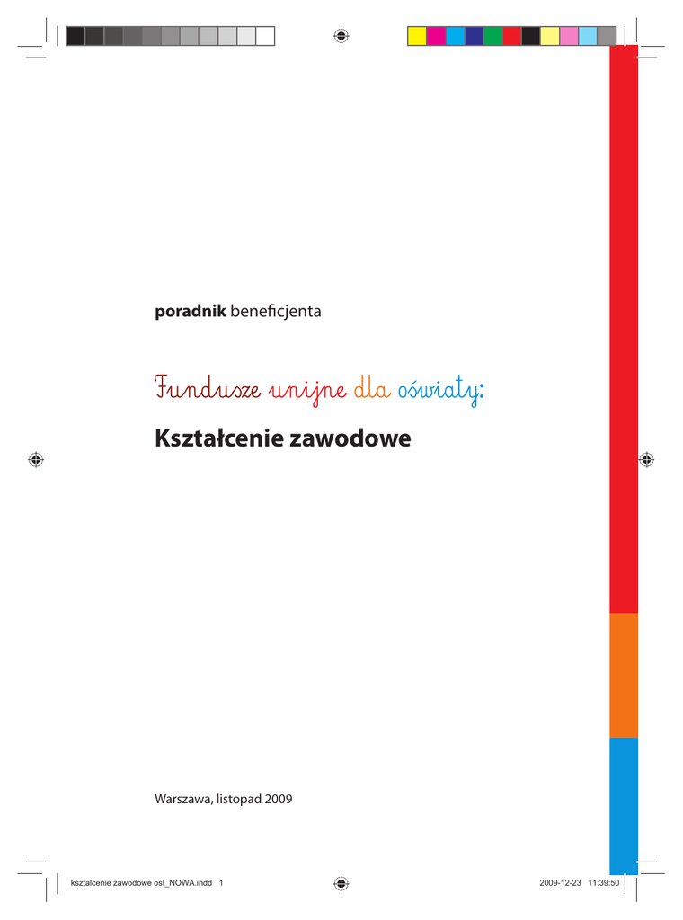 poradnik beneficjenta Fundusze unijne dla oświaty: Kształcenie zawodowe Warszawa, listopad 2009 ksztalcenie zawodowe ost_NOWA.indd 1 2009-12-23 11:39:50 S Wydawca: Ministerstwo Rozwoju Regionalnego ul. Wspólna 2/4, 00-926 Warszawa www.mrr.gov.pl www.funduszeeuropejskie.gov.pl ISBN: 978-83-7610-155-2 Autor: Piotr Stronkowski Współpraca: Adriana Niedoszewska Elżbieta Pilch Irena Wolińska Redakcja merytoryczna: Ministerstwo Edukacji Narodowej Departament Funduszy Strukturalnych al. J. Ch. Szucha 25, 00-918 Warszawa tel. +48 22 34 74 881, fax +48 22 34 74 883 [email protected] www.efs.men.gov.pl ksztalcenie zawodowe ost_NOWA.indd 2 2009-12-23 11:39:50 Spis treści 1 Wstęp strona 5 Sytuacja w obszarze kształcenia zawodowego – najważniejsze wyzwania strona 6 Możliwości rozwiązywania problemów poprzez realizację projektów strona 13 Projekty jako sposób rozwiązywania problemów strona 32 Specyficzne wymagania i możliwości związane z poszczególnymi źródłami finansowania strona 41 6 Ciekawe praktyki strona 53 7 Przydatne adresy strona 58 2 3 4 5 ksztalcenie zawodowe ost_NOWA.indd 3 2009-12-23 11:39:50 1 N śc ży w Po po pr zo ni N w sp pr kt ed zy le w zz ni Pr do za Zb pr za W Za el pe no ksztalcenie zawodowe ost_NOWA.indd 4 2009-12-23 11:39:51 Fundusze unijne dla oświaty – kształcenie zawodowe 1. Wstęp Niniejszy poradnik ma na celu przedstawienie podstawowych informacji o możliwościach finansowania przedsięwzięć dotyczących kształcenia zawodowego młodzieży. Skierowany jest do wszystkich osób pracujących w sektorze kształcenia zawodowego i poszukujących możliwości sfinansowania swoich pomysłów. Ponieważ poradnik adresowany jest do osób, które zajmują się lub chcą się zająć pozyskiwaniem funduszy na oświatę, zaproponowano układ odpowiadający logice pracy nad projektem – niezależnie od obszaru, w ramach którego może zostać realizowany. Poradnik prowadzi Czytelnika przez wszystkie etapy procesu przygotowania projektu. Na początku zamieszczono podstawowe informacje o kształceniu zawodowym, wskazując najważniejsze problemy i wyzwania, a tym samym pokazując, w jaki sposób można podejść do określenia problemu, którego rozwiązaniu będzie służył projekt. Następnie omówione zostały cele poszczególnych programów, w ramach których przewidziano wspieranie kształcenia zawodowego lub szerzej – systemu edukacji. Jeżeli program obejmuje nasz problem, wówczas możemy starać się o pozyskanie środków na konkretny projekt. Jak się do tego zabrać wyjaśniamy w kolejnym rozdziale, w którym omówione zostały zasady przygotowania projektu ze wskazaniem najważniejszych, kluczowych elementów. Zwrócenie uwagi na każde z zagadnień poruszanych w tym rozdziale zdecydowanie zwiększa szanse powodzenia naszego przedsięwzięcia. Przygotowując projekt, należy zwrócić baczną uwagę na szczegółowe wymagania dotyczące realizacji projektu w ramach każdego z programów, a w szczególności: zasady składania wniosków, rozliczania wydatków, finansowania projektów itd. Zbagatelizowanie tych zagadnień może utrudnić lub wręcz uniemożliwić realizację projektu. Najważniejsze wymagania w ramach poszczególnych programów zostały zawarte w rozdziale czwartym. W ostatniej części poradnika zaprezentowano przykłady realizowanych projektów. Zakładamy, że przyjęta formuła poradnika/przewodnika najlepiej zobrazuje główne elementy procesu przygotowywania i wdrażania projektów, łatwo ją również uzupełnić, odwołując się do dokumentów, w których poszczególne zagadnienia opisano w sposób szczegółowy. Fundusze unijne dla oświaty – kształcenie zawodowe ksztalcenie zawodowe ost_NOWA.indd 5 5 2009-12-23 11:39:51 Fundusze unijne dla oświaty – kształcenie zawodowe D –2 ty ja 2. Sytuacja w obszarze kształcenia zawodowego – najważniejsze wyzwania System kształcenia zawodowego zyskuje coraz większą rangę w dyskusji o sposobach zwiększania konkurencyjności zarówno polskiej, jak i europejskiej gospodarki. W wielu dokumentach podkreśla się, że konkurencyjna pozycja całej Unii Europejskiej powinna być budowana w oparciu o wysokiej jakości kapitał ludzki. Aby to osiągnąć, konieczne jest intensywne inwestowanie w kompetencje pracowników, szczególnie ich kompetencje zawodowe. Cechą charakterystyczną kształcenia zawodowego jest możliwość uzyskania dyplomu potwierdzającego kwalifikacje zawodowe po zdaniu egzaminu zawodowego. Nauczanie odbywa się zgodnie z podstawą programową, określającą profile kształcenia ogólnozawodowego lub kształcenia w zawodzie, w której określone są cele kształcenia oraz standardy wymagań, będące podstawą egzaminów. W Polsce istnieją następujące typy szkół zawodowych: • dwuletnie i trzyletnie zasadnicze szkoły zawodowe, • trzyletnie licea profilowane kształcące w profilach kształcenia ogólnozawodowego, • czteroletnie technika, • trzyletnie technika uzupełniające dla absolwentów zasadniczych szkół zawodowych, • szkoły policealne o okresie nauczania nie dłuższym niż 2,5 roku. Źr O ce du PL Sz ny na st tw da w G ty do w W dz Ponadto działają Centra Kształcenia Praktycznego, w których realizowana jest praktyczna nauka zawodu. W systemie kształcenia zawodowego wyodrębnić można również szkoły dla dorosłych, charakteryzujące się odrębną organizacją kształcenia, do których przyjmowane są osoby w wieku co najmniej 18 lat. Jednak w tym poradniku koncentrujemy się na szkołach dla młodzieży. Kwestie kształcenia ustawicznego, w tym również kształcenia zawodowego dorosłych zostały omówione szeroko w poradniku pt. Kształcenie ustawiczne. Rozwój nowoczesnego, dopasowanego do potrzeb rynku pracy, kształcenia zawodowego w Polsce stanowi duże wyzwanie. Jest to obszar od wielu lat zaniedbany, niedoinwestowany, a jakość usług edukacyjnych jest często zbyt niska, natomiast oczekiwania dotyc