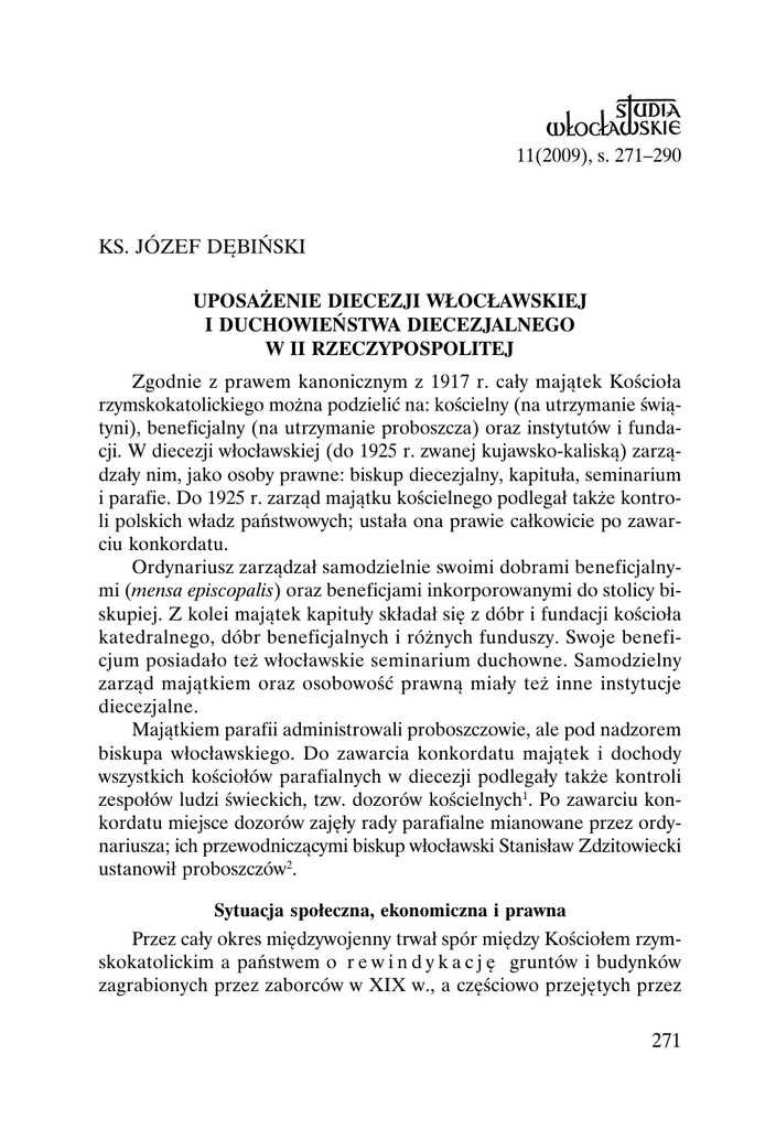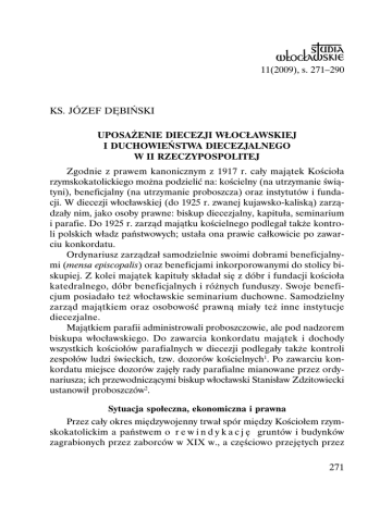 11(2009), s. 271–290 KS. JÓZEF DĘBIŃSKI UPOSAŻENIE DIECEZJI WŁOCŁAWSKIEJ I DUCHOWIEŃSTWA DIECEZJALNEGO W II RZECZYPOSPOLITEJ Zgodnie z prawem kanonicznym z 1917 r. cały majątek Kościoła rzymskokatolickiego można podzielić na: kościelny (na utrzymanie świątyni), beneficjalny (na utrzymanie proboszcza) oraz instytutów i fundacji. W diecezji włocławskiej (do 1925 r. zwanej kujawsko-kaliską) zarządzały nim, jako osoby prawne: biskup diecezjalny, kapituła, seminarium i parafie. Do 1925 r. zarząd majątku kościelnego podlegał także kontroli polskich władz państwowych; ustała ona prawie całkowicie po zawarciu konkordatu. Ordynariusz zarządzał samodzielnie swoimi dobrami beneficjalnymi (mensa episcopalis) oraz beneficjami inkorporowanymi do stolicy biskupiej. Z kolei majątek kapituły składał się z dóbr i fundacji kościoła katedralnego, dóbr beneficjalnych i różnych funduszy. Swoje beneficjum posiadało też włocławskie seminarium duchowne. Samodzielny zarząd majątkiem oraz osobowość prawną miały też inne instytucje diecezjalne. Majątkiem parafii administrowali proboszczowie, ale pod nadzorem biskupa włocławskiego. Do zawarcia konkordatu majątek i dochody wszystkich kościołów parafialnych w diecezji podlegały także kontroli zespołów ludzi świeckich, tzw. dozorów kościelnych1. Po zawarciu konkordatu miejsce dozorów zajęły rady parafialne mianowane przez ordynariusza; ich przewodniczącymi biskup włocławski Stanisław Zdzitowiecki ustanowił proboszczów2. Sytuacja społeczna, ekonomiczna i prawna Przez cały okres międzywojenny trwał spór między Kościołem rzymskokatolickim a państwem o r e w i n d y k a c j ę gruntów i budynków zagrabionych przez zaborców w XIX w., a częściowo przejętych przez 271 skarb państwa polskiego3. Księża dziekani w 1919 r. zostali zobowiązani przez biskupa włocławskiego S. Zdzitowieckiego do zebrania danych o budynkach i gmachach kościelnych zajmowanych przez władze rządowe. Natomiast szczegółowego wykazu gmachów poduchownych mieli dokonać do końca czerwca 1925 r.; mieli też obowiązek przesłania do kurii diecezjalnej wykazu nieruchomości pozostających w posiadaniu parafii4. Problemem dużej wagi stał się też p o d z i a ł w i e l k i e j w ł a s n o ś c i r o l n e j. W sprawie metod podziału ziemi wysuwano różne propozycje; obok nielicznych żądań reformy rolnej bez wykupu, wskazywano drogę wywłaszczenia, a najczęściej mówiono o parcelacji za odszkodowaniem. Duchowieństwo diecezji włocławskiej gotowe było na ustępstwa w sprawie oddania ziemi na potrzeby ludności bezrolnej5. Narastanie fali rewolucyjnej tuż po odzyskaniu niepodległości spowodowało, iż sejm 10 VII 1919 r. podjął uchwałę „O zasadach reformy rolnej”, która 15 VII 1920 r. została uchwalona w formie ustawy „O wykonaniu reformy rolnej”. Miała to być parcelacja oparta na wywłaszczeniu wielkich majątków, których właściciele mieli otrzymać odszkodowanie w wysokości połowy wartości przejmowanych majątków. Ustawa zastrzegała jednak, że majątki poduchowne nie ulegną parcelacji aż do zawarcia konkordatu ze Stolicą Apostolską6. Na mocy uchwały sejmowej przy parcelacji majątków miały być przydzielone dla proboszczów i służby kościelnej działy ziemi. Ponieważ władze państwowe natychmiast poczyniły pewne postanowienia odnośnie do parcelacji gruntów, ordynariusz włocławski w każdym dekanacie powołał specjalne komisje, których celem było czuwanie, aby przy parcelacji majątków nie zapomniano o przydziale ziemi dla proboszczów i służby kościelnej7. Stolica Apostolska zgodziła się, aby rząd polski przejął na własność tzw. dobra „martwej” ręki na cele reformy rolnej w myśl ustawy z 15 VII 1920 r., a przy parcelacji uwzględnił tworzenie gospodarstw dla proboszczów, organistów i służby kościelnej8. Ministerstwo Rolnictwa i Dóbr Państwowych już 1 X 1919 r. poinformowało bp. S. Zdzitowieckiego o rozporządzeniu wydanym Zarządom Okręgowym Dóbr Państwowych, które miało na względzie zabezpieczenie gruntów dla parafii9. Ministerstwo to w piśmie z 16 VIII 1921 r. skierowanym do bp. S. Zdzitowieckiego potwierdziło zarezerwowanie przy parcelacji majątków państwowych pewnej ilości gruntów na tworzenie gospodarstw od 8 do 10 ha dla proboszczów oraz parcel dla organistów i służby kościelnej10. 272 Sytuację prawną Kościoła rzymskokatolickiego w zakresie reformy rolnej regulował zawarty 10 II 1925 r. konkordat, w którym – zgodnie z art. 24, p. 5 – Stolica Apostolska i Episkopat Polski godziły się na parcelację pewnej części dóbr kościelnych, aby polepszyć gospodarcze i społeczne położenie ludności rolniczej i aby utrwalić pokój chrześcijański w kraju11. Państwo mogło wykupić od beneficjentów ziemię rolną, pozostawiając biskupom, kapitułom i seminariom diecezjalnym po 180 ha, a probostwom i zwykłym beneficjom po 15–30 ha12. Urzędy ziemskie, w przypadku parcelacji dóbr pokościelnych, miały przyznawać proboszczom, kapitułom i seminariom ośrodki rolne odpowiedniej wielkości. Jedynie zakony nie miały otrzymać żadnego nadania z tytułu parcelacji gruntów pokościelnych. Według takiego stanu rzeczy duchowieństwo diecezjalne miało dysponować majątkiem 160 tys. ha ziemi, a zakony zatrzymałyby dotychczasowy stan posiadania, tj. 60 tys. ha13. W tym czasie uposażenie duchowieństwa i utrzymanie wielu instytucji kościelnych spoczywało w głównej mierze na wiernych. Dlatego uważano za konieczne zmianę dotychczasowego systemu, tym bardziej, że źródłem między innymi dochodu na początku lat dwudziestych XX w. była pensja rządowa, która wynosiła 648 mk dla proboszcza i 325 mk dla wikariusza rocznie oraz ziemia parafialna 3,24 ha, a faktycznie 2 ha14. W grudniu 1924 r., po reformie walutowej, pensja rządowa dla proboszcza w diecezji włocławskiej wynos