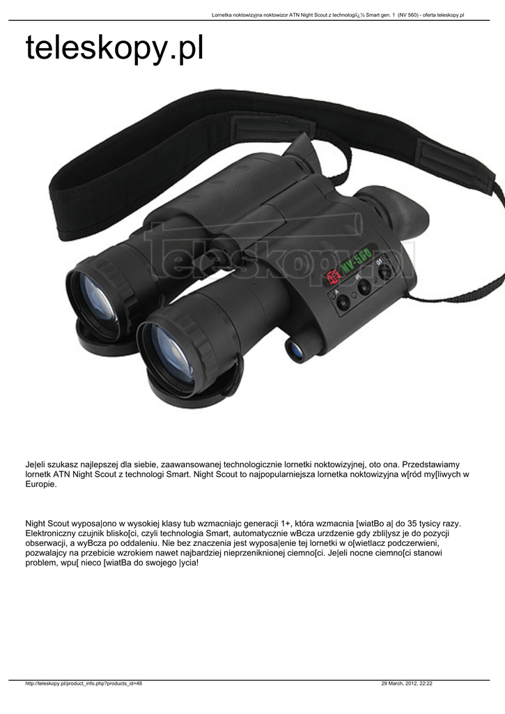 Lornetka noktowizyjna noktowizor ATN Night Scout z technologi� Smart gen. 1 (NV 560) - oferta teleskopy.pl teleskopy.pl Je|eli szukasz najlepszej dla siebie, zaawansowanej technologicznie lornetki noktowizyjnej, oto ona. Przedstawiamy lornetk ATN Night Scout z technologi Smart. Night Scout to najpopularniejsza lornetka noktowizyjna w[ród my[liwych w Europie. Night Scout wyposa|ono w wysokiej klasy tub wzmacniajc generacji 1+, która wzmacnia [wiatBo a| do 35 tysicy razy. Elektroniczny czujnik blisko[ci, czyli technologia Smart, automatycznie wBcza urzdzenie gdy zbli|ysz je do pozycji obserwacji, a wyBcza po oddaleniu. Nie bez znaczenia jest wyposa|enie tej lornetki w o[wietlacz podczerwieni, pozwalajcy na przebicie wzrokiem nawet najbardziej nieprzeniknionej ciemno[ci. Je|eli nocne ciemno[ci stanowi problem, wpu[ nieco [wiatBa do swojego |ycia! http://teleskopy.pl/product_info.php?products_id=48 29 March, 2012, 22:22 Lornetka noktowizyjna noktowizor ATN Night Scout z technologi� Smart gen. 1 (NV 560) - oferta teleskopy.pl Zastosowania le[nictwo my[listwo |eglarstwo przyroda wdkarstwo http://teleskopy.pl/product_info.php?products_id=48 29 March, 2012, 22:22 Lornetka noktowizyjna noktowizor ATN Night Scout z technologi� Smart gen. 1 (NV 560) - oferta teleskopy.pl Parametry techniczne • Generacja: 1+ • Iluminator IR: wbudowany • Technologia 'Smart': tak • Mikroprocesor: Philips • Powikszenie: 5x • Rozdzielczo[: 40 linii/mm • Zasig detekcji: 250m • Zasig rozpoznania: 175m • Pole widzenia: 20 stopni • Ogniskowa obiektywu: F = 90mm • ZwiatBosiBa: F/1,2 • Zakres regulacji ostro[ci (Dioptrie): +/-5 http://teleskopy.pl/product_info.php?products_id=48 29 March, 2012, 22:22 Lornetka noktowizyjna noktowizor ATN Night Scout z technologi� Smart gen. 1 (NV 560) - oferta teleskopy.pl • Zakres ostro[ci: od 7m do nieskoDczono[ci • Zasilanie: dwie 3V baterie litowe • Zakres temperatur: od -40 do +40°C • Czas pracy bez wymiany zródBa zasilania: 10 - 20 godzin • Wymiary: 225mm x 150mm x 60mm • Waga: 1,5kg Gwarancja 2 lata gwarancji Polecane akcesoria • o¶wietlacz d³ugozasiêgowy IR-450 B1 (KLIKNIJ ABY ZOBACZYÆ) Dodatkowe zdjêcia produktu i akcesoriów http://teleskopy.pl/product_info.php?products_id=48 29 March, 2012, 22:22 Lornetka noktowizyjna noktowizor ATN Night Scout z technologi� Smart gen. 1 (NV 560) - oferta teleskopy.pl (noktowizor z za³o¿onym opcjonalnym d³ugozasiêgowym o¶wietlaczem IR) (noktowizor z za³o¿onym opcjonalnym d³ugozasiêgowym o¶wietlaczem IR) (noktowizor z za³o¿onym opcjonalnym d³ugozasiêgowym o¶wietlaczem IR) >> CZÊSTO ZADAWANE PYTANIA << Pytanie: Czym siê ró¿ni± noktowizory generacji 1 i 2? Chcê kupiæ noktowizor, ale chcia³bym dowiedzieæ wiêcej o technologii noktowizyjnej. Odpowied¼: Podstawowe informacje mo¿na znale¼æ w opracowaniu JAK DZIA£A NOKTOWIZOR (kliknij aby przeczytaæ) Pytanie: Jaka to bateria CR123? Czy istniej± "akumulatorki" tego typu? http://teleskopy.pl/product_info.php?products_id=48 29 March, 2012, 22:22 Lornetka noktowizyjna noktowizor ATN Night Scout z technologi� Smart gen. 1 (NV 560) - oferta teleskopy.pl Odpowied¼: Baterie CR123 to 3-woltowe baterie litowe, czêsto u¿ywane w aparatach fotograficznych, dalmierzach, celownikach, latarkach taktycznych. Ogniwa litowe maj± du¿± pojemno¶æ, s± odporne na temperatury od -55 do +70 st. C, i maj± bardzo d³ugi - bo a¿ 15 letni okres przydatno¶ci do u¿ytku (w temperaturze pokojowej). Tak, na rynku s± dostêpne akumulatory (symbol RCR-123, wymagaj± dedykowanej ³adowarki). http://teleskopy.pl/product_info.php?products_id=48 29 March, 2012, 22:22