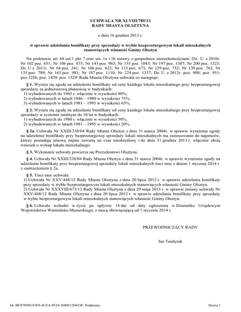 UCHWAŁA NR XLVIII/785/13 RADY MIASTA OLSZTYNA z dnia 16 grudnia 2013 r. w sprawie udzielania bonifikaty przy sprzedaży w trybie bezprzetargowym lokali mieszkalnych stanowiących własność Gminy Olsztyn Na podstawie art. 68 ust.1 pkt 7 oraz ust. 1a i 1b ustawy o gospodarce nieruchomościami /Dz. U. z 2010r. Nr 102 poz. 651; Nr 106 poz. 675; Nr 143 poz. 963; Nr 155 poz. 1043; Nr 197 poz. 1307; Nr 200 poz. 1323; Dz. U z 2011r. Nr 64 poz. 341; Nr 106 poz. 622; Nr 115 poz. 673; Nr 129 poz. 732; Nr 130 poz. 762; Nr 135 poz. 789; Nr 163 poz. 981; Nr 187 poz. 1110; Nr 224 poz. 1337; Dz. U. z 2012r. poz. 908; poz. 951; poz.1256; poz. 1429; poz. 1529/ Rada Miasta Olsztyna uchwala co następuje: § 1. Wyraża się zgodę na udzielenie bonifikaty od ceny każdego lokalu mieszkalnego przy bezprzetargowej sprzedaży za jednorazową płatnością w budynkach: 1) wybudowanych do 1945 r. włącznie w wysokości 80%, 2) wybudowanych w latach 1946 – 1980 w wysokości 75%, 3) wybudowanych w latach 1981 – 1995 w wysokości 65%, § 2. Wyraża się zgodę na udzielenie bonifikaty od ceny każdego lokalu mieszkalnego przy bezprzetargowej sprzedaży w systemie ratalnym do 10 lat w budynkach: 1) wybudowanych do 1980 r. włącznie w wysokości 50%, 2) wybudowanych w latach 1981 – 1995 w wysokości 20%. § 2a. Uchwała Nr XXIII/338/04 Rady Miasta Olsztyn z dnia 31 marca 2004r. w sprawie wyrażenia zgody na udzielenie bonifikaty przy bezprzetargowej sprzedaży lokali mieszkalnych ma zastosowanie do najemców, którzy posiadają umowę najmu zawartą na czas nieokreślony i do dnia 31 grudnia 2013 r. włącznie złożą wniosek o wykup lokalu mieszkalnego. § 3. Wykonanie uchwały powierza się Prezydentowi Olsztyna. § 4. Uchwała Nr XXIII/338/04 Rady Miasta Olsztyn z dnia 31 marca 2004r. w sprawie wyrażenia zgody na udzielenie bonifikaty przy bezprzetargowej sprzedaży lokali mieszkalnych traci moc z dniem 1 stycznia 2014 r. z zastrzeżeniem § 2a. § 5. Traci moc uchwała: 1) Uchwała Nr XXV/448/12 Rady Miasta Olsztyna z dnia 20 lipca 2012 r. w sprawie udzielania bonifikaty przy sprzedaży w trybie bezprzetargowym lokali mieszkalnych stanowiących własność Gminy Olsztyn. 2) Uchwała Nr XXXVIII/673/13 Rady Miasta Olsztyna z dnia 29 maja 2013 r. w sprawie zmiany uchwały Nr XXV/448/12 Rady Miasta Olsztyna z dnia 20 lipca 2012 r. w sprawie udzielania bonifikaty przy sprzedaży w trybie bezprzetargowym lokali mieszkalnych stanowiących własność Gminy Olsztyn. § 6. Uchwała wchodzi w życie po upływie 14 dni od daty ogłoszenia w Dzienniku Urzędowym Województwa Warmińsko-Mazurskiego, z mocą obowiązującą od 1 stycznia 2014 r. PRZEWODNICZĄCY RADY Jan Tandyrak Id: 4B7F969D-F5F8-4CEA-9F24-3680615D623F. Podpisany Strona 1