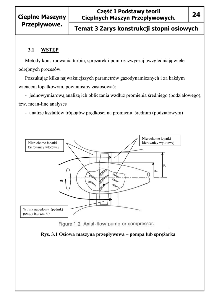 Cieplne Maszyny Przepływowe. 3.1 Część I Podstawy teorii Cieplnych Maszyn Przepływowych. 24 Temat 3 Zarys konstrukcji stopni osiowych WSTĘP Metody konstruowania turbin, sprężarek i pomp zazwyczaj uwzględniają wiele odrębnych procesów. Poszukując kilka najważniejszych parametrów gazodynamicznych i za każdym wieńcem łopatkowym, powinniśmy zastosować: - jednowymiarową analizę ich obliczania wzdłuż promienia średniego (podziałowego), tzw. mean-line analyses - analizę kształtów trójkątów prędkości na promieniu średnim (podziałowym) Nieruchome łopatki kierownicy wylotowej Nieruchome łopatki kierownicy wlotowej Rz Rw ω Wirnik napędowy (pędnik) pompy (sprężarki). Rys. 3.1 Osiowa maszyna przepływowa – pompa lub sprężarka Cieplne Maszyny Przepływowe. Część I Podstawy teorii Cieplnych Maszyn Przepływowych. 25 Temat 3 Zarys konstrukcji stopni osiowych Element łopatki Powierzchnia obrotowa Rys. 3.2 Wycinek palisady pierścieniowej i obrotowa płaszczyzna Obudowa Linia prądu Rys. 3.3. Przekrój merydionalny przez wirnik maszyny. Piasta Cieplne Maszyny Przepływowe. Część I Podstawy teorii Cieplnych Maszyn Przepływowych. 26 Temat 3 Zarys konstrukcji stopni osiowych Rys. 3.4. Obraz przepływu trójwymiarowego przez wieniec wirnikowy turbiny Cieplne Maszyny Przepływowe. Część I Podstawy teorii Cieplnych Maszyn Przepływowych. 27 Temat 3 Zarys konstrukcji stopni osiowych Rys. 3.5 Obraz przepływu trójwymiarowego przez wieniec wirnikowy sprężarki osiowej Blade Wakes – Ślad łopatkowy Hub Corner Vortex - Wir narożny przy piaście End Wall Boumdary Layer- Warstwa przyścienna na ściance ograniczającej Secondary Flow – przepływ wtórny Tip Clerance Flow – Przepływ nadłopatkowy przez szczelinę Tip Corner Vortex - Wir narożny przy obudowie Blade Surface Boundary Layer - Warstwa przyścienna na pow. łopatki Shock Surface – Powierzchnia uderzeniowa Flow- Przepływ Unsteady Uniform Velocity – Nieustalona prędkość jednorodna (stała) Rotation – Ruch obrotowy Cieplne Maszyny Przepływowe. 3.1.1. Część I Podstawy teorii Cieplnych Maszyn Przepływowych. 28 Temat 3 Zarys konstrukcji stopni osiowych Maszyna wielostopniowa Dlaczego w maszynie wielostopniowej obserwuje się tendencje do zachowania: - stałego promienia - stałej prędkości średniej wirowania łopatki u - podobieństwo geometrycznego łopatek wirnika - podobieństwo geometryczne łopatek stojana - zmiennego pole przekroju osiowego (zmienna wysokość łopatki przy przepływie przez maszynę. Praca wykonana przez jednostkę masy płynu (∆ho) i naprężenia w wirniku zależą głównie od; kwadratu obwodowej prędkości łopatki u, przy czym wysoka prędkości łopatki jest: pożądana lecz ograniczona powstającymi wówczas dużymi naprężeniami w łopatce. Z potrzeby redukcji poziomu strat i kosztów projektowania wynika także aby wszystkie stopnie spełniały następujące warunki: - zachowywały podobieństwo trójkątów prędkości - miały zmienną wysokość łopatek ze zmianą gęstości czynnika. Rys. 3.6. Wielostopniowa sprężarka osiowa Cieplne Maszyny Przepływowe. Część I Podstawy teorii Cieplnych Maszyn Przepływowych. Temat 3 Zarys konstrukcji stopni osiowych REGULOWANE ŁOPATKI KIEROWNICZE Rys. 3.7. Wielostopniowa sprężarka osiowa ze zmiennymi kształtami kanałów stojana - regulowanymi łopatkami kierowniczymi. 3.2 3.2.1 29 Konstrukcja stopnia Identyczność (powtarzalność) stopni. W stopniach powtarzalnych trójkąty prędkości dla każdego stopnia są takie same. Przeprowadzając analizę dla turbiny mamy: c m = const. α0 =α2 Cieplne Maszyny Przepływowe. Część I Podstawy teorii Cieplnych Maszyn Przepływowych. Temat 3 Zarys konstrukcji stopni osiowych c0 = c 2 Teraz c1u = cm ctgα1 i c2u = cm ctgα 2 Równanie pracy obwodowej EULERA ma postać: Dla stopnia turbinowego: lu = u∆cu = u (cu1 − cu 2 ) = ucm (ctgα1 − ctgα 2 ) Dla stopnia sprężarkowego: lu = u∆cu = u (cu 2 − cu1 ) = ucm (ctgα 2 − ctgα1 ) Współczynnik spadku (wzrostu ) entalpii (obciążenia wieńca) jest ψ= = Gdzie: 30 ∆is lu 2lu 2∆cu = = = = u2 u2 u2 u 2 2 2cm (1 tgα 2 − 1 tgα1 ) = 2ϕ (ctgα1 − ctgα 2 ) u ϕ cm ϕ= u jest współczynnikiem przepływu. Cieplne Maszyny Przepływowe. Część I Podstawy teorii Cieplnych Maszyn Przepływowych. Temat 3 Zarys konstrukcji stopni osiowych KIEROWNICA u c1 a c1a w1 u WIRNIK w2 c2 u Rys. 3.8 Profile łopatek i trójkąty prędkości dla stopnia turbinowego Reakcję (współczynnik reakcji, reakcyjność) wyznaczamy ze wzoru: R= 31 ∆is , wirnik ∆is , stopien =1− ∆is , stator ∆is , stopien Zmiana entalpii całkowitej w stojanie (kierownicy) ∆h = h1 − h2 = 0 gdzie 1 2 h=i+ c 2 Cieplne Maszyny Przepływowe. Część I Podstawy teorii Cieplnych Maszyn Przepływowych. Temat 3 Zarys konstrukcji stopni osiowych stąd 1 2 1 2 i1 + c1 = i2 + c2 2 2 więc 1 ∆hstojan = ∆ i + c 2 = 0 2 dlatego też ( ) ( ) 1 1 1 ∆i = ∆ c 2 = ∆ cm2 + cu2 = ∆ cu2 2 2 2 z czego wynika, że ∆hstojan = ( 1 2 cm ctg 2α 2 − ctg 2α1 2 ) Ale wiemy, że: 1 ∆ c 2 =0 2 stopnia zatem ; ∆hstopnia 32 1 1 u2 = ⋅ ψ = ∆ h + c 2 = ∆i stopnia 2 2 2 stopnia Równanie określające reakcyjność będzie zatem miało postać: ( 1 2 cm ctg 2α 2 − ctg 2α1 R =1− 2 u2 ψ 2 ) Cieplne Maszyny Przepływowe. Część I Podstawy teorii Cieplnych Maszyn Przepływowych. 33 Temat 3 Zarys konstrukcji stopni osiowych ϕ 2 (ctg 2α 2 − ctg 2α1 ) R = 1− ψ Eliminując z równania na reakcyjność tangens kąta α2 otrzymamy: ψ = 4 (1 − R − ϕctgα1 ) Powyższe równanie: - obowiązuje zarówno dla sprężarek jak i dla turbin, - ma bardzo duże znaczenie. Wynika z niego: - duża reakcyjność, która implikuje niską wartość wskaźnik spadku (wzrostu) entalpii (obciążenia) - przyrost wartości współczynnika przepływu reakcji i kąta α1, powoduje zmniejszenie współczynnika spadku (wzrostu) ent
