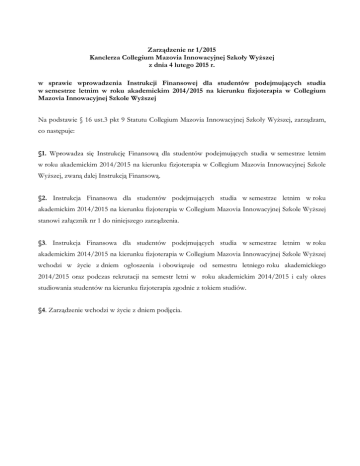 Zarządzenie nr 1/2015 Kanclerza Collegium Mazovia Innowacyjnej Szkoły Wyższej z dnia 4 lutego 2015 r. w sprawie wprowadzenia Instrukcji Finansowej dla studentów podejmujących studia w semestrze letnim w roku akademickim 2014/2015 na kierunku fizjoterapia w Collegium Mazovia Innowacyjnej Szkole Wyższej Na podstawie § 16 ust.3 pkt 9 Statutu Collegium Mazovia Innowacyjnej Szkoły Wyższej, zarządzam, co następuje: §1. Wprowadza się Instrukcję Finansową dla studentów podejmujących studia w semestrze letnim w roku akademickim 2014/2015 na kierunku fizjoterapia w Collegium Mazovia Innowacyjnej Szkole Wyższej, zwaną dalej Instrukcją Finansową. §2. Instrukcja Finansowa dla studentów podejmujących studia w semestrze letnim w roku akademickim 2014/2015 na kierunku fizjoterapia w Collegium Mazovia Innowacyjnej Szkole Wyższej stanowi załącznik nr 1 do niniejszego zarządzenia. §3. Instrukcja Finansowa dla studentów podejmujących studia w semestrze letnim w roku akademickim 2014/2015 na kierunku fizjoterapia w Collegium Mazovia Innowacyjnej Szkole Wyższej wchodzi w życie z dniem ogłoszenia i obowiązuje od semestru letniego roku akademickiego 2014/2015 oraz podczas rekrutacji na semestr letni w roku akademickim 2014/2015 i cały okres studiowania studentów na kierunku fizjoterapia zgodnie z tokiem studiów. §4. Zarządzenie wchodzi w życie z dniem podjęcia. Załącznik nr 1 do Zarządzenia nr 1/2015 Kanclerza Collegium Mazovia Innowacyjnej Szkoły Wyższej z dnia 4 lutego 2015 r. Instrukcja Finansowa dla studentów podejmujących studia w semestrze letnim w roku akademickim 2014/2015 na kierunku fizjoterapia w Collegium Mazovia Innowacyjnej Szkole Wyższej 1. 2. 3. 4. 5. 1. 2. 3. 4. Rozdział I – Postanowienia ogólne §1 Instrukcja finansowa dla studentów Collegium Mazovia Innowacyjnej Szkoły Wyższej określa odpłatności za studia i inne opłaty związane z tokiem studiów oraz zasady ich wnoszenia. Instrukcja finansowa dotyczy studentów podejmujących studia w semestrze letnim w roku akademickim 2014/2015 na kierunku fizjoterapia w Collegium Mazovia Innowacyjnej Szkole Wyższej Studenci, którzy kontynuują studia po urlopie dziekańskim, wznawiają studia lub przenoszą się z innej uczelni, wnoszą czesne zgodnie z Instrukcją finansową obowiązującą dany tok studiów do którego dołączają. Instrukcja nie dotyczy studentów, którzy podejmują studia współfinansowane ze środków Unii Europejskiej. W dalszej części Instrukcja finansowa zwana jest – Instrukcją, a Collegium Mazovia Innowacyjna Szkoła Wyższa – Uczelnią. §2 Studia w Collegium Mazovia Innowacyjnej Szkole Wyższej są studiami odpłatnymi. Wysokość odpłatności za studia, określona w niniejszej Instrukcji, może być zmieniana w drodze aneksu do umowy o studia. Opłata za studia zwana dalej czesnym, wnoszona jest z góry za każdy semestr studiów. Na opłaty związane z tokiem studiów składają się opłaty określone w rozdziale V niniejszej instrukcji. Rozdział II – Zasady wnoszenia opłat 1. 2. 3. 4. 5. 6. §3 Wszystkie opłaty związane z tokiem studiów powinny być wnoszone przez studentów przelewem bankowym bądź przekazem pocztowym na konto bankowe Uczelni. Każdy student Uczelni otrzymuje indywidualne, przyporządkowane studentowi subkonto bankowe. Student jest zobowiązany do dokonywania wszelkich opłat wynikających z toku studiów wyłącznie na swoje indywidualne subkonto bankowe. W wyjątkowych przypadkach student może wpłacać drobne kwoty do kasy Uczelni, po uzyskaniu akceptacji kasjerki na przyjęcie wpłaty. Na blankiecie polecenia przelewu bądź przekazu należy czytelnie wpisać: imię i nazwisko wpłacającego, tytuł wpłaty oraz numer albumu. Uczelnia nie ponosi odpowiedzialności za błędne księgowanie wpłat opisanych nieczytelnie i bez podanego numeru albumu. Wpłaty studenta są księgowane zgodnie z podanym tytułem wpłaty. Wpłaty bez podania tytułu księgowane są na poczet czesnego. Instrukcja Finansowa dla studentów podejmujących studia w semestrze letnim w roku akademickim 2014/2015 na kierunku fizjoterapia w Collegium Mazovia Innowacyjnej Szkole Wyższej 1 7. W przypadku, gdy student ma zaległości finansowe wobec Uczelni, w pierwszej kolejności pokryte zostaną odsetki ustawowe naliczone z powodu nieterminowych wpłat, w drugiej zaległe należności a w trzeciej tytuł wpłaty. §4 Opłaty powinny być wnoszone w wysokościach i w terminach zgodnych z niniejszą Instrukcją. Za dzień dokonania wpłaty uznaje się dzień wpływu środków na konto bankowe Uczelni lub do kasy Uczelni. Jeżeli termin przypada na dzień ustawowo wolny od pracy, obowiązek zapłaty przesuwa się na dzień następny. Opłaty wynikające z decyzji Dziekana lub Rektora powinny być wnoszone w terminie do 14 dni od daty tej decyzji. Studenci ostatniego semestru dokonują wpłaty należności, o których mowa w § 4 ust. 1 i 3, nie później niż do dnia obrony. 1. 2. 3. 4. §5 W przypadku powstania znaczących zaległości finansowych studenta wobec Uczelni, Kanclerz wzywa studenta do ich uregulowania, powiadamiając studenta listem o wysokości zobowiązań i wyznaczając 14-dniowy termin ostateczny. §6 Skreślenie studenta z listy studentów nie zwalnia go z obowiązku rozliczenia się z zaległości finansowych wobec Uczelni. Rozdział III – Czesne §7 Podstawową formą płatności za studia jest opłata czesnego za semestr. Opłaty semestralne za studia powinny być wniesione do 15 września za semestr zimowy i do 15 lutego za semestr letni. Student może skorzystać z dodatkowego sposobu wpłacania czesnego w pięciu ratach w każdym semestrze, płaconych co miesiąc począwszy od 15 września do 15 stycznia w semestrze zimowym i od 15 lutego do 15 czerwca w semestrze letnim. Student może zwrócić się z wnioskiem o bezpośrednie przeksięgowanie stypendium na poczet jego czesnego, nie zwalnia go jednak to z obowiązku terminoweg