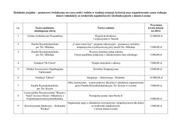 Działania socjalno – pomocowe świadczone na rzecz osób i rodzin w trudnej sytuacji życiowej oraz organizowanie czasu wolnego dzieci i młodzieży ze środowisk najuboższych i dysfunkcyjnych z miasta Leszna Przyznana kwota dotacji na 2011r. Lp. Nazwa podmiotu składającego ofertę Nazwa zadania 1 Caritas Archidiecezji Poznańskiej Wyjazd do Krakowa i wypoczynek w Tatrach 2 Parafia Rzymskokatolicka pw. Św. Mikołaja „Z nami warto być”- program rekreacyjno – poznawczy świetlicy terapeutyczno-wychowawczej przy parafii Św. Mikołaja 5 000,00 zł Parafia Rzymskokatolicka pw. Św. Mikołaja Wszyscy jesteśmy jedną rodziną Festyn parafialny połączony z zakończeniem roku szkolnego 4 000,00 zł 4 Fundacja ''Dr Clown'' Terapia śmiechem i zabawą 5 000,00 zł 5 Polskie Towarzystwo Zapobiegania Narkomanii Świetlica Terapeutyczna 8 000,00 zł 6 Fundacja ''Odzew'' Integracja – Aktywizacja - Działanie 14 000,00 zł 7 Parafia Rzymskokatolicka pw. Św. Krzyża Obóz turystyczno – wypoczynkowy dla dzieci i młodzieży organizowany przez Parafię Rzymskokatolicką pw. Św. Krzyża w Lesznie 5 000,00 zł 3 8 9 Leszczyńskie Stowarzyszenie ''Razem z Nami'' na rzecz Dzieci i Młodzieży z Niepełnosprawnością Intelektualną 12 600,00 zł Poznajemy postać Jana Pawła II Organizacja zajęć o charakterze rozwojowym i terapeutycznym dla dzieci Stowarzyszenie Społeczno – Kulturalne ze środowisk najuboższych ''Krokus'' z terenu miasta Leszna 8 000,00 zł 3 000,00 zł 10 Parafialny Oddział Akcji Katolickiej przy parafii św. Jana Chrzciciela Parafiada 3 000,00 zł 11 Stowarzyszenie ''Echo'' Razem łatwiej 5 000,00 zł 12 Pływanie korekcyjno kompensacyjne i wspomagania rozwoju fizycznego, Leszczyńskie Stowarzyszenie ''Dzieciom psychicznego i społecznego dzieci i młodzieży programu ''Już pływam'' Niepełnosprawnym'' 2 100,00 zł 13 Leszczyńskie Stowarzyszenie ''Dzieciom Niepełnosprawnym'' Konkurs plastyczny ''Moje miejsce na ziemi'' 700,00 zł 14 Leszczyńskie Stowarzyszenie ''Dzieciom Niepełnosprawnym'' Warsztaty muzyczne dla dzieci i młodzieży 1 000,00 zł 15 Leszczyńskie Stowarzyszenie ''Dzieciom Niepełnosprawnym'' Integracyjny turniej kręglarski z okazji Dnia Dziecka p.h. „Podaruj Dziecku Uśmiech” 1 000,00 zł 16 Leszczyńskie Stowarzyszenie ''Dzieciom Niepełnosprawnym'' II Międzynarodowy Spływ Kajakowy „Krainą kwitnącej konwalii” 2 000,00 zł