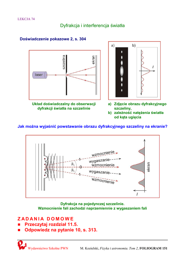 LEKCJA 74 Dyfrakcja i interferencja światła Doświadczenie pokazowe 2, s. 304 Układ doświadczalny do obserwacji dyfrakcji światła na szczelinie a) Zdjęcie obrazu dyfrakcyjnego szczeliny, b) zaleŜność natęŜenia światła od kąta ugięcia Jak moŜna wyjaśnić powstawanie obrazu dyfrakcyjnego szczeliny na ekranie? Dyfrakcja na pojedynczej szczelinie. Wzmocnienie fali zachodzi naprzemiennie z wygaszaniem fali ZADANIA DOMOWE Przeczytaj rozdział 11.5. Odpowiedz na pytanie 10, s. 313. Wydawnictwo Szkolne PWN M. Kozielski, Fizyka i astronomia. Tom 2, FOLIOGRAM 151