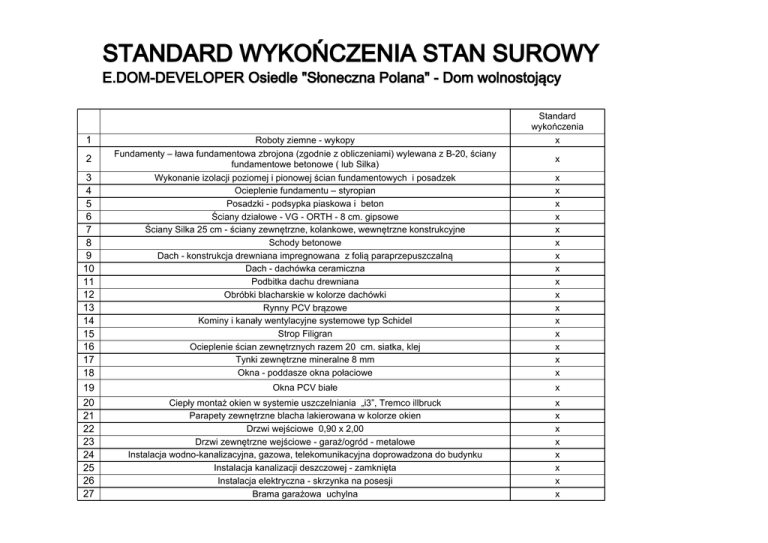 STANDARD WYKOŃCZENIA STAN SUROWY E.DOM-DEVELOPER Osiedle "Słoneczna Polana" - Dom wolnostojący 1 2 3 4 5 6 7 8 9 10 11 12 13 14 15 16 17 18 19 20 21 22 23 24 25 26 27 Roboty ziemne - wykopy Fundamenty – ława fundamentowa zbrojona (zgodnie z obliczeniami) wylewana z B-20, ściany fundamentowe betonowe ( lub Silka) Wykonanie izolacji poziomej i pionowej ścian fundamentowych i posadzek Ocieplenie fundamentu – styropian Posadzki - podsypka piaskowa i beton Ściany działowe - VG - ORTH - 8 cm. gipsowe Ściany Silka 25 cm - ściany zewnętrzne, kolankowe, wewnętrzne konstrukcyjne Schody betonowe Dach - konstrukcja drewniana impregnowana z folią paraprzepuszczalną Dach - dachówka ceramiczna Podbitka dachu drewniana Obróbki blacharskie w kolorze dachówki Rynny PCV brązowe Kominy i kanały wentylacyjne systemowe typ Schidel Strop Filigran Ocieplenie ścian zewnętrznych razem 20 cm. siatka, klej Tynki zewnętrzne mineralne 8 mm Okna - poddasze okna połaciowe Standard wykończenia x x x x x x x x x x x x x x x x x x Okna PCV białe x Ciepły montaż okien w systemie uszczelniania „i3”, Tremco illbruck Parapety zewnętrzne blacha lakierowana w kolorze okien Drzwi wejściowe 0,90 x 2,00 Drzwi zewnętrzne wejściowe - garaż/ogród - metalowe Instalacja wodno-kanalizacyjna, gazowa, telekomunikacyjna doprowadzona do budynku Instalacja kanalizacji deszczowej - zamknięta Instalacja elektryczna - skrzynka na posesji Brama garażowa uchylna x x x x x x x x