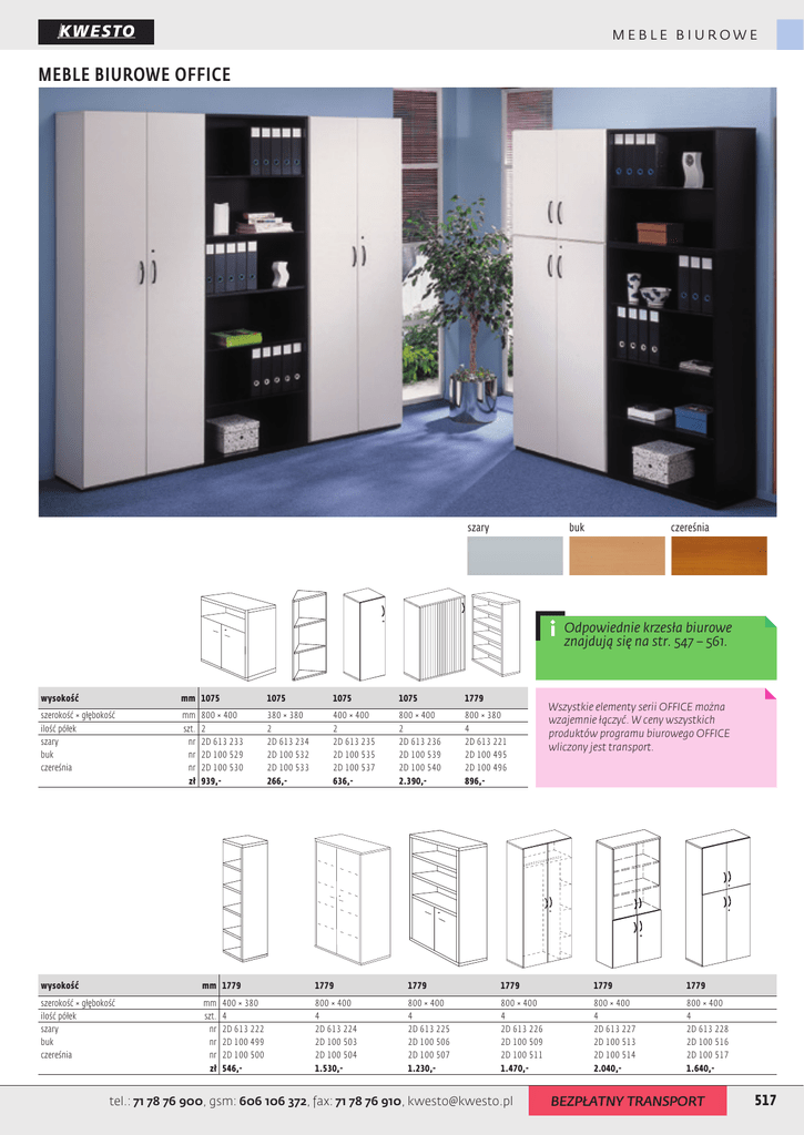 MEBLE BIUROWE MEBLE BIUROWE OFFICE szary buk czereśnia Odpowiednie krzesła biurowe znajdują się na str. 547 – 561. wysokość mm 1075 1075 1075 1075 1779 szerokość × głębokość ilość półek szary buk czereśnia mm szt. nr nr nr zł 380 × 380 2 2D 613 234 2D 100 532 2D 100 533 266,- 400 × 400 2 2D 613 235 2D 100 535 2D 100 537 636,- 800 × 400 2 2D 613 236 2D 100 539 2D 100 540 2.390,- 800 × 380 4 2D 613 221 2D 100 495 2D 100 496 896,- 800 × 400 2 2D 613 233 2D 100 529 2D 100 530 939,- Wszystkie elementy serii OFFICE można wzajemnie łączyć. W ceny wszystkich produktów programu biurowego OFFICE wliczony jest transport. wysokość mm 1779 1779 1779 1779 1779 1779 szerokość × głębokość ilość półek szary buk czereśnia mm szt. nr nr nr zł 800 × 400 4 2D 613 224 2D 100 503 2D 100 504 1.530,- 800 × 400 4 2D 613 225 2D 100 506 2D 100 507 1.230,- 800 × 400 4 2D 613 226 2D 100 509 2D 100 511 1.470,- 800 × 400 4 2D 613 227 2D 100 513 2D 100 514 2.040,- 800 × 400 4 2D 613 228 2D 100 516 2D 100 517 1.640,- 400 × 380 4 2D 613 222 2D 100 499 2D 100 500 546,- tel.: 71 78 76 900, gsm: 606 106 372, fax: 71 78 76 910, [email protected] BEZPŁATNY TRANSPORT 517
