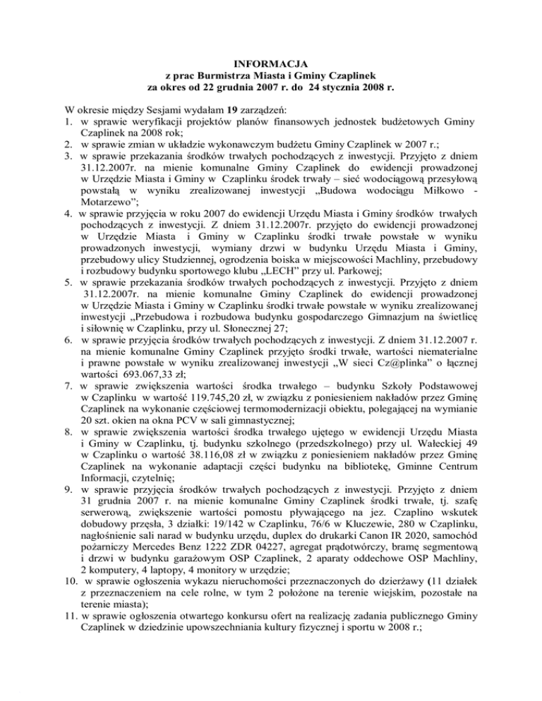 INFORMACJA z prac Burmistrza Miasta i Gminy Czaplinek za okres od 22 grudnia 2007 r. do 24 stycznia 2008 r. W okresie między Sesjami wydałam 19 zarządzeń: 1. w sprawie weryfikacji projektów planów finansowych jednostek budżetowych Gminy Czaplinek na 2008 rok; 2. w sprawie zmian w układzie wykonawczym budżetu Gminy Czaplinek w 2007 r.; 3. w sprawie przekazania środków trwałych pochodzących z inwestycji. Przyjęto z dniem 31.12.2007r. na mienie komunalne Gminy Czaplinek do ewidencji prowadzonej w Urzędzie Miasta i Gminy w Czaplinku środek trwały – sieć wodociągową przesyłową powstałą w wyniku zrealizowanej inwestycji „Budowa wodociągu Miłkowo Motarzewo”; 4. w sprawie przyjęcia w roku 2007 do ewidencji Urzędu Miasta i Gminy środków trwałych pochodzących z inwestycji. Z dniem 31.12.2007r. przyjęto do ewidencji prowadzonej w Urzędzie Miasta i Gminy w Czaplinku środki trwałe powstałe w wyniku prowadzonych inwestycji, wymiany drzwi w budynku Urzędu Miasta i Gminy, przebudowy ulicy Studziennej, ogrodzenia boiska w miejscowości Machliny, przebudowy i rozbudowy budynku sportowego klubu „LECH” przy ul. Parkowej; 5. w sprawie przekazania środków trwałych pochodzących z inwestycji. Przyjęto z dniem 31.12.2007r. na mienie komunalne Gminy Czaplinek do ewidencji prowadzonej w Urzędzie Miasta i Gminy w Czaplinku środki trwałe powstałe w wyniku zrealizowanej inwestycji „Przebudowa i rozbudowa budynku gospodarczego Gimnazjum na świetlicę i siłownię w Czaplinku, przy ul. Słonecznej 27; 6. w sprawie przyjęcia środków trwałych pochodzących z inwestycji. Z dniem 31.12.2007 r. na mienie komunalne Gminy Czaplinek przyjęto środki trwałe, wartości niematerialne i prawne powstałe w wyniku zrealizowanej inwestycji „W sieci Cz@plinka” o łącznej wartości 693.067,33 zł; 7. w sprawie zwiększenia wartości środka trwałego – budynku Szkoły Podstawowej w Czaplinku w wartość 119.745,20 zł, w związku z poniesieniem nakładów przez Gminę Czaplinek na wykonanie częściowej termomodernizacji obiektu, polegającej na wymianie 20 szt. okien na okna PCV w sali gimnastycznej; 8. w sprawie zwiększenia wartości środka trwałego ujętego w ewidencji Urzędu Miasta i Gminy w Czaplinku, tj. budynku szkolnego (przedszkolnego) przy ul. Wałeckiej 49 w Czaplinku o wartość 38.116,08 zł w związku z poniesieniem nakładów przez Gminę Czaplinek na wykonanie adaptacji części budynku na bibliotekę, Gminne Centrum Informacji, czytelnię; 9. w sprawie przyjęcia środków trwałych pochodzących z inwestycji. Przyjęto z dniem 31 grudnia 2007 r. na mienie komunalne Gminy Czaplinek środki trwałe, tj. szafę serwerową, zwiększenie wartości pomostu pływającego na jez. Czaplino wskutek dobudowy przęsła, 3 działki: 19/142 w Czaplinku, 76/6 w Kluczewie, 280 w Czaplinku, nagłośnienie sali narad w budynku urzędu, duplex do drukarki Canon IR 2020, samochód pożarniczy Mercedes Benz 1222 ZDR 04227, agregat prądotwórczy, bramę segmentową i drzwi w budynku garażowym OSP Czaplinek, 2 aparaty oddechowe OSP Machliny, 2 komputery, 4 laptopy, 4 monitory w urzędzie; 10. w sprawie ogłoszenia wykazu nieruchomości przeznaczonych do dzierżawy (11 działek z przeznaczeniem na cele rolne, w tym 2 położone na terenie wiejskim, pozostałe na terenie miasta); 11. w sprawie ogłoszenia otwartego konkursu ofert na realizację zadania publicznego Gminy Czaplinek w dziedzinie upowszechniania kultury fizycznej i sportu w 2008 r.; 12. w sprawie realizacji zadań publicznych z zakresu zadań własnych Gminy Czaplinek realizowanych w 2008 r. przez organizacje pozarządowe prowadzące działalność pożytku publicznego oraz ogłoszenia konkursów ofert na realizacje tych zadań; 13. w sprawie ustalenia układu wykonawczego budżetu na 2008 rok; 14. w sprawie ogłoszenia wykazu nieruchomości przeznaczonych do sprzedaży (2 lokale mieszkalne, w tym 1 położony na terenie wiejskim, 1 w Czaplinku); 15. w sprawie powołania komisji przetargowej do przeprowadzenia ustnego przetargu na dzierżawę nieruchomości stanowiącej własność Gminy Czaplinek; 16.w sprawie ogłoszenia naboru na wolne stanowisko Młodszego referenta ds. organizacyjnokadrowych; 17. w sprawie ogłoszenia naboru na wolne stanowisko Młodszego referenta ds. wymiaru podatków lokalnych; 18. w sprawie utworzenia rachunku dochodów własnych, którego źródłem przychodów są wpływy pochodzące z darowizny przekazanej Urzędowi Miasta i Gminy w Czaplinku (przez sponsora) oraz ustalenia planu finansowego środków zgromadzonych na tym rachunku; 19. w sprawie przekazywania w roku 2008 rat dotacji dla zakładów budżetowych, instytucji kultury i środków finansowych dla jednostek budżetowych. W okresie od 22 grudnia 2007 r. do 24 stycznia 2008 r. zrealizowane zostały następujące działania: W zakresie inwestycji: Budowa sieci wodno-kanalizacyjnej ze Starego Drawska do Drahimka i na trasie Czaplinek – Łąka. Została wykonana sieć główna wod.-kan. w m. Drahimek. Trwa wykonanie przyłączy wod.kan. do budynków. Wykonawca dokonał wytyczenia trasy sieci na drugim zadaniu na odcinku Czaplinek – Łąka i planuje rozpocząć to zadanie od lutego br. Budowa przyłącza wodociągowego do nieruchomości w Żerdnie. W dniu 18.01.2008r. dokonano zgłoszenia wykonania robót w Starostwie Powiatowym w Drawsku Pom. Prace planowane są do wykonania w terminie od 01.04.2008r. Obecnie przygotowywana jest dokumentacja przetargowa w celu wyboru wykonawcy robót. Budowa dróg na Osiedlu Wiejska. Zinwentaryzowano temat budowy dróg z podziałem na etapy. Uzgodniono z projektantem zakres rzeczowy praz związanych z aktualizacją kosztorysów inwestorskich, przedmiarów robót oraz specyfikacji technicznej odbioru i wykonania robót drogowych. Dokumenty te zostaną przygotowane do 11.02.2008r., po czym wdrożona zostanie procedura przetargowa związana z wyłonieniem wykonawcy określonego etapu 