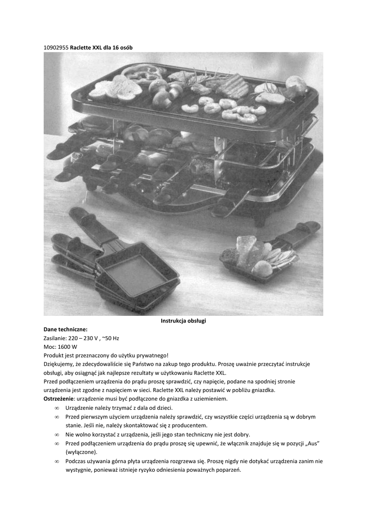 10902955 Raclette XXL dla 16 osób Instrukcja obsługi Dane