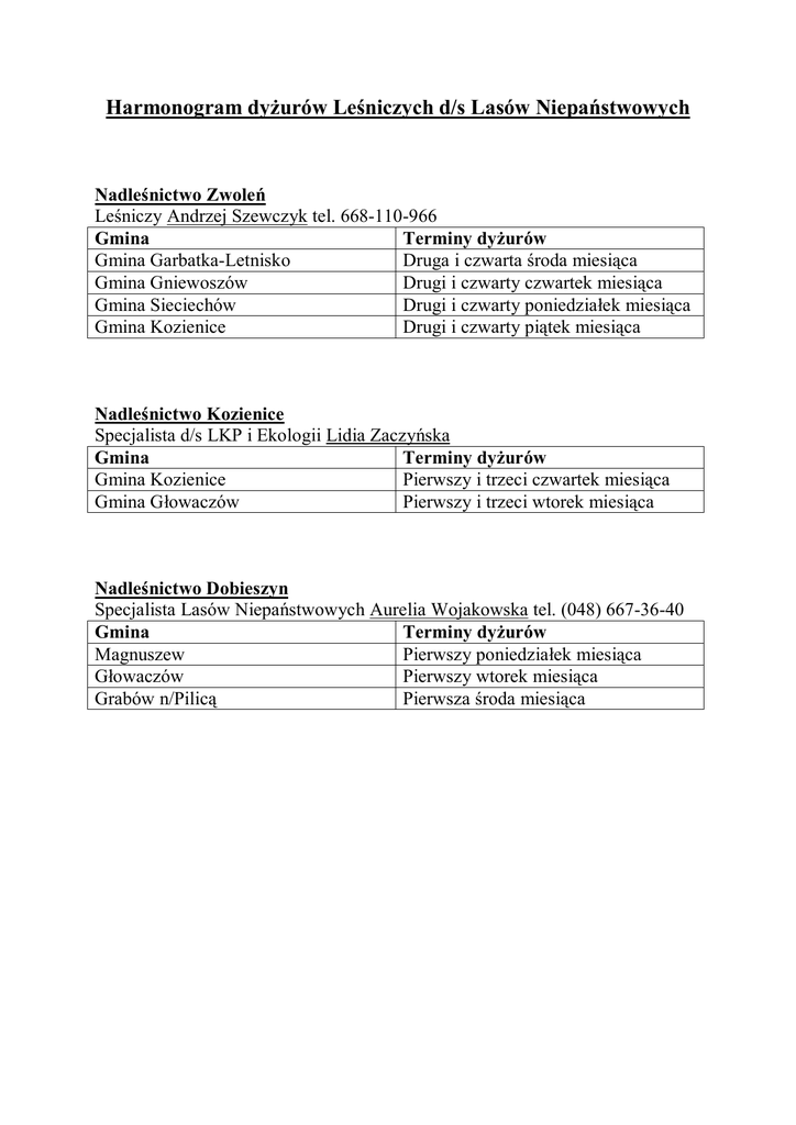 Harmonogram dyżurów Leśniczych d/s Lasów Niepaństwowych Nadleśnictwo Zwoleń Leśniczy Andrzej Szewczyk tel. 668-110-966 Gmina Terminy dyżurów Gmina Garbatka-Letnisko Druga i czwarta środa miesiąca Gmina Gniewoszów Drugi i czwarty czwartek miesiąca Gmina Sieciechów Drugi i czwarty poniedziałek miesiąca Gmina Kozienice Drugi i czwarty piątek miesiąca Nadleśnictwo Kozienice Specjalista d/s LKP i Ekologii Lidia Zaczyńska Gmina Terminy dyżurów Gmina Kozienice Pierwszy i trzeci czwartek miesiąca Gmina Głowaczów Pierwszy i trzeci wtorek miesiąca Nadleśnictwo Dobieszyn Specjalista Lasów Niepaństwowych Aurelia Wojakowska tel. (048) 667-36-40 Gmina Terminy dyżurów Magnuszew Pierwszy poniedziałek miesiąca Głowaczów Pierwszy wtorek miesiąca Grabów n/Pilicą Pierwsza środa miesiąca