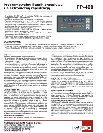 Programowalny licznik przep³ywu z elektroniczn¹ rejestracj¹ FP-400 2 wejœcia 0/4-20 mA, 2 wejœcia PULS do pod³¹czenia przep³ywomierzy i przetworników · Mo¿liwoœæ wyœwietlania do 4 kana³ów pomiarowych · Funkcje obliczeniowe (+, -, *, /, _), œledzenie wartoœci min-max, mo¿liwoœæ wprowadzenia indywidualnej charakterystyki czujnika lub przep³ywomierza, pomiar z dwoma prze³¹czanymi automatycznie przep³ywomierzami · Wyœwietlacze: LED i alfanumeryczny LCD · Funkcje alarmowo steruj¹ce (4 wyjœcia przekaŸnikowe), opcjonalnie wyjœcie analogowe 4-20mA · Port komunikacyjny RS-485, protokó³ Modbus RTU, oprogramowanie do wizualizacji · Rejestracja wyników na kartach pamiêci, mo¿liwoœæ bramkowania oraz wyzwalania rejestracji z wejœcia dwustanowego · ZASTOSOWANIE • Pomiary przep³ywów oraz innych wielkoœci jak temperatura, wilgotnoœæ, ciœnienie z rejestracj¹ wyników • Praca w rozproszonych systemach pomiarowych z lokalnym wskazaniem wyników pomiarów • Przemys³ spo¿ywczy, hutniczy, szklarski, nadzór hal magazynowych, ci¹gów produkcyjnych WEJŒCIA Przyrz¹d ma 4 niezale¿ne wejœcia pomiarowe: · 2 wejœcia typu 0/4-20mA do pod³¹czenia przep³ywomierzy oraz czujników w standardzie pêtli pr¹dowej z mo¿liwoœci¹ zasilania z przyrz¹du, · 2 wejœcia typu PULS wejœcia impulsowe do pod³¹czenia przep³ywomierzy oraz czujników z wyjœciem impulsowym o zakresie 0,001 Hz do 10 kHz (pomiaru czêstotliwoœci lub zliczania impulsów), mog¹ pracowaæ równie¿ jako wejœcia dwustanowe do sterowania prac¹ rejestracji wyników lub bramkowania wartoœci mierzonej. Zakresy pracy wejœæ s¹ programowalne w szerokim zakresie, umo¿liwiaj¹ cyfrowe filtrowanie stanów nieustalonych oraz fluktuacji sygna³ów. Mo¿na równie¿ mierzon¹ wartoœæ przemna¿aæ przez sta³e zale¿ne od stanów wejœcia PULS (np.. zmiana kierunku przep³ywu -1 / +1, przeskalowanie x1 / x100, itp.). Ka¿de z wejœæ mo¿e pracowaæ z charakterystyk¹ liniow¹, pierwiastkow¹ lub U¿ytkownika. Charakterystyka U¿ytkownika umo¿liwia wprowadzenie do 100 punktów opisuj¹cych dowolny kszta³t charakterystyki przep³ywomierza lub innego czujnika nieliniowego. LICZNIKI (SUMATORY) Ka¿dej z wejœæ pomiarowych mo¿e byæ skonfigurowane do pomiaru przep³ywu. U¿ytkownik ma do dyspozycji po dwa liczniki: L1 do pomiaru przep³ywu bez mo¿liwoœci zerowania oraz L2, który mo¿e byæ zerowany przez u¿ytkownika z przycisku na p³ycie czo³owej lub mo¿e pracowaæ w trybie automatycznego zerowania co godzinê, dobê lub co miesi¹c. W urz¹dzeniu dostêpne s¹ równie¿ liczniki czasu T1 (czasu ca³kowitego pracy) oraz T2 dla ka¿dego kana³u zliczaj¹ce czas pracy liczników kasowalnych L2. Niezale¿nie od rejestracji na karcie pamiêci MMC/SD liczniki mog¹ byæ zapisywane do bufora nieulotnej pamiêci przyrz¹du. Zapis mo¿e odbywaæ siê co godzinê, dobê lub raz w miesi¹cu z mo¿liwoœci¹ zdefiniowania dnia i godziny zapisu. Bufor umo¿liwia zapamiêtanie ostatnich 35 stanów liczników. Stany te dostêpne s¹ dla u¿ytkownika na wyœwietlaczu przyrz¹du. WYŒWIETLANIE WYNIKÓW Na p³ycie czo³owej przyrz¹du znajduje siê cyfrowy wyœwietlacz METRONIC SYSTEMS Andrzej Kurdziel tel/fax (12)632 32 82, 632 89 06 [email protected] www.metronicsystems.com.pl www.metronic.com.pl LED oraz wyœwietlacz alfanumeryczny LCD. Na wyœwietlaczu LED wyœwietlany jest numer kana³u oraz wynik bie¿¹cy pomiar, na wyœwietlaczu LCD wyœwietlane s¹ stany liczników (w przypadku pomiaru przep³ywów) oraz informacji dodatkowych jak wartoœæ minimalna i maksymalna mierzonej wielkoœci, opis tekstowy, linijka analogowa (bargraf), wartoœci progów alarmowych. Na wyœwietlaczu LCD wyœwietlane s¹ równie¿ komunikaty oraz funkcje zwi¹zane z rejestracj¹ wyników. Na p³ycie czo³owej znajduj¹ siê dwie dwukolorowe diody LED sygnalizuj¹ce o statusie rejestracji (MMC/SD) oraz informuj¹ce o stanach przekroczeñ i awarii (ALARM). U¿ytkownik mo¿e skonfigurowaæ do 4 ró¿nych kana³ów pomiarowych, ka¿dy z nich mo¿e wyœwietlaæ wartoœæ mierzon¹ lub wynik obliczeñ (np. sumê dwóch przep³ywów). UK£AD ALARMOWO - STERUJ¥CY Uk³ad umo¿liwia swobodne programowanie w ka¿dym z kana³ów do 2 poziomów granicznych AL1 i AL2, których przekroczenie powoduje zg³oszenie alarmu lub zmianê stanu przekaŸnika steruj¹cego. Przyrz¹d ma 4 pó³przewodnikowe przekaŸniki wyjœciowe, które mog¹ byæ swobodnie przypisane do progów alarmowych. KOMUNIKACJA SZEREGOWA W wyposa¿eniu standardowym jest w port komunikacyjny RS485, umo¿liwiaj¹cy programowanie miernika z komputera oraz odczyt mierzonych wyników. Transmisja jest zgodna ze standardem Modbus RTU, zapewniaj¹c wspó³pracê z innymi uniwersalnymi systemami sterowania i wizualizacji. REJESTRACJA WYNIKÓW POMIARÓW Przyrz¹d rejestruje wyniki pomiarów na wyjmowanych kartach pamiêci MMC/SD. Dane zapisywane s¹ w trybie do zape³nienia pamiêci lub w trybie ci¹g³ym z nadpisywaniem najstarszych wyników. Prêdkoœæ zapisu danych jest ustawiana przez u¿ytkownika: co 1 s do 1 h. Na karcie pamiêci znajduj¹ siê dwa pliki z rejestrowanymi danymi: z wynikami bie¿¹cymi oraz ze stanami liczników (co 10 min). Odczyt wyników archiwalnych odbywa siê w komputerze, po przeniesieniu danych za pomoc¹ karty.