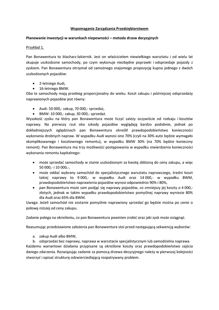 Wspomaganie Zarządzania Przedsiębiorstwem Planowanie inwestycji w warunkach niepewności – metoda drzew decyzyjnych Przykład 1. Pan Bonawentura to blacharz-lakiernik. Jest on właścicielem niewielkiego warsztatu i od wielu lat skupuje uszkodzone samochody, po czym wykonuje niezbędne poprawki i odsprzedaje pojazdy z zyskiem. Pan Bonawentura otrzymał od zamożnego znajomego propozycję kupna jednego z dwóch uszkodzonych pojazdów: 2-letniego Audi, 16-letniego BMW. Oba te samochody mają przebieg proporcjonalny do wieku. Koszt zakupu i późniejszej odsprzedaży naprawionych pojazdów jest równy: Audi: 50 000,- zakup, 70 000,- sprzedaż, BMW: 10 000,- zakup, 30 000,- sprzedaż. Wysokość zysku na który pan Bonawentura może liczyć zależy oczywiście od rodzaju i kosztów naprawy. Na pierwszy rzut oka szkody pojazdów wyglądają bardzo podobnie, jednak po dokładniejszych oględzinach pan Bonawentura określił prawdopodobieństwo konieczności wykonania drobnych napraw. W wypadku Audi wynosi ono 70% (czyli na 30% auto będzie wymagało skomplikowanego i kosztownego remontu), w wypadku BMW 30% (na 70% będzie konieczny remont). Pan Bonawentura ma trzy możliwości postępowania w wypadku stwierdzenia konieczności wykonania remontu kapitalnego: może sprzedać samochody w stanie uszkodzonym za kwotę zbliżoną do ceny zakupu, a więc 50 000,- i 10 000,-, może oddać wybrany samochód do specjalistycznego warsztatu naprawczego, średni koszt takiej naprawy to 9 000,- w wypadku Audi oraz 14 000,- w wypadku BWM, prawdopodobieństwo naprawienia pojazdów wynosi odpowiednio 90% i 80%, pan Bonawentura może sam podjąć się naprawy pojazdów, co zmniejszy jej koszty o 4 000,złotych, jednak w takim wypadku prawdopodobieństwo pomyślnej naprawy wyniesie 80% dla Audi oraz 65% dla BWM. Uwaga: Jeżeli samochód nie zostanie pomyślnie naprawiony sprzedać go będzie można po cenie o połowę niższej od ceny zakupu. Zadanie polega na określeniu, co pan Bonawentura powinien zrobić oraz jaki zysk może osiągnąć. Reasumując przedstawione założenia pan Bonawentura stoi przed następującą sekwencją wyborów: a. zakup Audi albo BMW, b. odsprzedaż bez naprawy, naprawa w warsztacie specjalistycznym lub samodzielna naprawa. Każdemu wariantowi działania przypisane są określone koszty oraz prawdopodobieństwo zajścia danego zdarzenia. Rozwiązując zadanie za pomocą drzewa decyzyjnego należy w pierwszej kolejności stworzyć i opisać strukturę odzwierciedlającą rozpatrywany problem. Zadanie 1. Problem AGENCJA „BLASK" Opracowując hasło reklamowe dla swojego Klienta, agencja naruszyła prawa autorskie fundacji „Krezus", która wcześniej zarejestrowała bardzo podobny slogan. Po uświadomieniu sobie tego faktu, staje zatem przed wyborem: przyznać się, czy też się nie przyznawać. Ponieważ tego typu wykroczenia ulegają przedawnieniu dopiero po 25 latach, prawdopodobieństwo, że nikt niczego nie „zauważy” i agencja nie poniesie konsekwencji wynosi 0,05. W przypadku przyznania się można oczekiwać dwóch możliwości: poszkodowana fundacja „Krezus" wyrazi zgodę na negocjacje (z prawdopodobieństwem 0,7) albo wytoczy proces agencji „Blask". Jeśli dojdzie do negocjacji, agencja „Blask" ma dwie możliwości działania: zaproponowanie fundacji rekompensaty finansowej w wysokości 700 j.p. (umownych jednostek pieniężnych) lub rzeczowych świadczeń (własnych usług) na rzecz fundacji „Krezus", których koszt dla agencji wynosi 500 j.p. Prawdopodobieństwo zadowolenia się rekompensatą finansową przez fundację „Krezus" wynosi 0,8, a prawdopodobieństwo zaakceptowania świadczeń rzeczowych — 0,5. Kodeks stanowi jednoznacznie, że jeżeli fundacja „Krezus” wniesie sprawę do sądu i wygra proces, to agencja „Blask" poniesie koszt w wysokości 1000 j.p. Jeżeli agencja „Blask" wygra proces, to nie poniesie żadnych kosztów, poza kosztami obsługi prawnej. Agencja „Blask", zatrudnia młodego prawnika — mecenasa Mariana Papugę, którego wynagrodzenie za doradztwo i reprezentowanie agencji w toku procesu wyniesie 20 j.p. Prawdopodobieństwo wygrania procesu, gdy on będzie bronił interesów agencji, wynosi 0,05. Agencja „Blask", może też skorzystać z usług znanej firmy prawniczej „Bracia Pewni", która za taką usługę pobierze 150 j.p., ale dzięki kwalifikacjom zatrudnionych tam adwokatów prawdopodobieństwo wygrania procesu będzie większe i wyniesie 0,25. Problem firmy sprowadza się do pytania, co zrobić, aby koszt błędu był jak najmniejszy i ile on wtedy wyniesie.