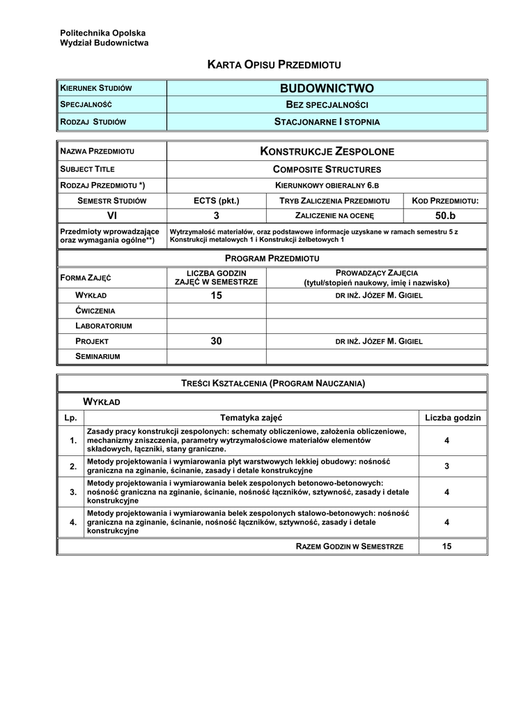 Politechnika Opolska Wydział Budownictwa KARTA OPISU PRZEDMIOTU BUDOWNICTWO KIERUNEK STUDIÓW BEZ SPECJALNOŚCI SPECJALNOŚĆ STACJONARNE I STOPNIA RODZAJ STUDIÓW KONSTRUKCJE ZESPOLONE NAZWA PRZEDMIOTU SUBJECT TITLE COMPOSITE STRUCTURES RODZAJ PRZEDMIOTU *) KIERUNKOWY OBIERALNY 6.B SEMESTR STUDIÓW ECTS (pkt.) TRYB ZALICZENIA PRZEDMIOTU KOD PRZEDMIOTU: VI 3 ZALICZENIE NA OCENĘ 50.b Przedmioty wprowadzające oraz wymagania ogólne**) Wytrzymałość materiałów, oraz podstawowe informacje uzyskane w ramach semestru 5 z Konstrukcji metalowych 1 i Konstrukcji żelbetowych 1 PROGRAM PRZEDMIOTU FORMA ZAJĘĆ WYKŁAD LICZBA GODZIN ZAJĘĆ W SEMESTRZE PROWADZĄCY ZAJĘCIA (tytuł/stopień naukowy, imię i nazwisko) 15 DR INŻ. JÓZEF M. GIGIEL 30 DR INŻ. JÓZEF M. GIGIEL ĆWICZENIA LABORATORIUM PROJEKT SEMINARIUM TREŚCI KSZTAŁCENIA (PROGRAM NAUCZANIA) WYKŁAD Lp. Tematyka zajęć Liczba godzin 1. Zasady pracy konstrukcji zespolonych: schematy obliczeniowe, założenia obliczeniowe, mechanizmy zniszczenia, parametry wytrzymałościowe materiałów elementów składowych, łączniki, stany graniczne. 4 2. Metody projektowania i wymiarowania płyt warstwowych lekkiej obudowy: nośność graniczna na zginanie, ścinanie, zasady i detale konstrukcyjne 3 3. Metody projektowania i wymiarowania belek zespolonych betonowo-betonowych: nośność graniczna na zginanie, ścinanie, nośność łączników, sztywność, zasady i detale konstrukcyjne 4 4. Metody projektowania i wymiarowania belek zespolonych stalowo-betonowych: nośność graniczna na zginanie, ścinanie, nośność łączników, sztywność, zasady i detale konstrukcyjne 4 RAZEM GODZIN W SEMESTRZE 15 ĆWICZENIA PROJEKTOWE Tematyka zajęć Lp. Liczba godzin Wydanie zadania: projekt konstrukcji wielokondygnacyjnego budynku. Omówienie 1. zakresu ćwiczenia projektowego i warunków zaliczenia. 2 2. Wydzielenie z tkanki budynku układu konstrukcyjnego. 2 Zestawienie obciążeń na zadane elementy nośne: stropodachu, stropów i/lub ścian 3. zewnętrznych. Określenie kombinacji miarodajnych obciążeń. Obliczenia statyczne. 4. Obliczenia SGN i SGU dla wybranego zespolonego elementu nośnego. 4 22 RAZEM GODZIN W SEMESTRZE 30 ZAŁOŻENIA I CELE PRZEDMIOTU: Zaznajomienie studenta z istotą współpracy elementów zespolonych. Poznanie i opanowanie podstawowych zasad współpracy betonu i stali w konstrukcjach zespolonych oraz pracy belek, płyt i słupów zespolonych oraz podstawowymi metodami projektowania elementów zespolonych betonowo-betonowych i betonowo-stalowych. Umiejętność wymiarowania i projektowania belek, płyt i słupów. Zrozumienie zasad pracy budynków wykonanych w konstrukcji zespolonej oraz sposobów kształtowania i wykonawstwa. METODY DYDAKTYCZNE: Wykłady - prezentacje multimedialne. Projekt - – rozwiązywanie przykładów na tablicy, konsultowanie postępów studenta w realizowaniu indywidualnego projektu. FORMA I WARUNKI ZALICZENIA PRZEDMIOTU: Wykład – ocena na podstawie pisemnego kolokwium. Ćwiczenia projektowe – ocena ze sprawdzianu i ćwiczenia projektowego. LITERATURA PODSTAWOWA: [1] [2] [3] [4] [5] Kubik J.: Mechanika konstrukcji warstwowych. Wydawnictwo TiT, Opole 1993. Kucharczuk W., Labocha S.: Konstrukcje zespolone stalowo-betonowe budynków. Arkady, Warszawa 2008. Łubiński M., Filipowicz A., Żółtowski W.: Konstrukcje metalowe cz. I i II, Arkady, Warszawa 2000. Żółtowski W.: Konstrukcje zespolone stal-tworzywo sztuczne, Politechnika Warszawska, Prace naukowe., z. 75. Warszawa 1982. Normy przedmiotowe: PN-EN-1990, PN-EN-1991, PN-EN-1996. LITERATURA UZUPEŁNIAJĄCA: [1] [2] [3] Referaty zawarte w materiałach konferencji „Konstrukcje zespolone” tom VIII, Zielona Góra c 2008, Johnson R.P.: Composite Structures of Steel and Concrete: Beams, Slabs, Columns, and Frames for Buildings, 3rd Edition, Wiley-Blackwell, 2004. Markiewicz M.: Vademecum projektanta. Projektowanie budynków halowych. ARCHI-PLUS, Kraków 2004. *) niewłaściwe przekreślić – zgodnie z arkuszem planu studiów, **) podać wybrane nazwy przedmiotów stanowiących wprowadzenie/uzupełnienie do przedmiotu opisywanego, oraz zakres wiadomości/umiejętności/kompetencji jakie powinien posiadać student przed rozpoczęciem nauki tego przedmiotu; ............................................................................. ................................................. (Kierownik jednostki organizacyjnej/bezpośredni przełożony: pieczęć/podpis) (Dziekan Wydziału …………………: pieczęć/podpis