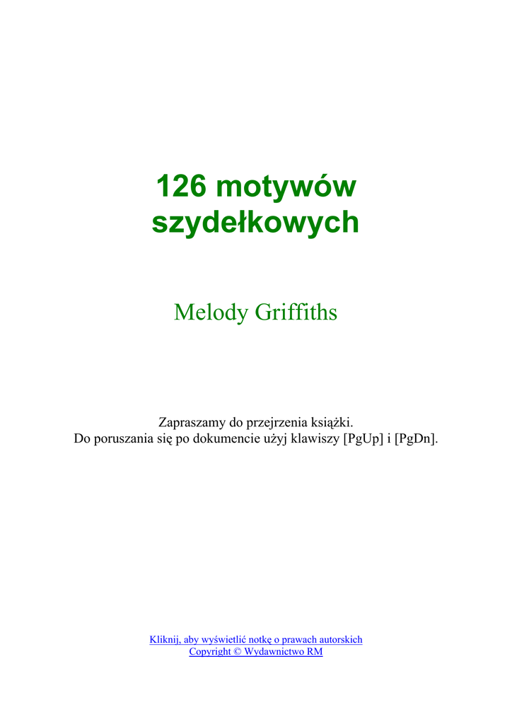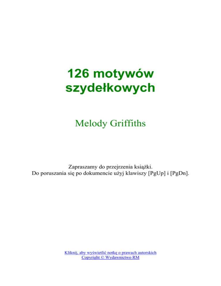 126 motywów szydełkowych Melody Griffiths Zapraszamy do przejrzenia książki. Do poruszania się po dokumencie użyj klawiszy [PgUp] i [PgDn]. Kliknij, aby wyświetlić notkę o prawach autorskich Copyright © Wydawnictwo RM 126 motywów szydełkowych (Melody Griffiths) 126 motywów szyde³kowych Melody Griffiths T³umaczenie: Agnieszka Chodkowska-Gyurics © Wydawnictwo RM, Warszawa 2009 Wydawnictwo RM, 03-808 Warszawa, ul. Miñska 25 [email protected] www.rm.com.pl First published in 2007 under the title 201 CROCHET MOTIFS, BLOCKS PROJECTS AND IDEAS by CICO Books Ltd., an imprint of Ryland, Peters & Small, 20-21 Jockey's Fields, London WC1R 4BW Text © Melody Griffiths 2007 Design and photography © CICO Books 2007 All rights reserved ¯adna czêœæ tej pracy nie mo¿e byæ powielana i rozpowszechniana, w jakiejkolwiek formie i w jakikolwiek sposób (elektroniczny, mechaniczny) w³¹cznie z fotokopiowaniem, nagrywaniem na taœmy lub przy u¿yciu innych systemów, bez pisemnej zgody wydawcy. Wszystkie nazwy handlowe i towarów wystêpuj¹ce w niniejszej publikacji s¹ znakami towarowymi zastrze¿onymi lub nazwami zastrze¿onymi odpowiednich firm odnoœnych w³aœcicieli. Wydawnictwo RM do³o¿y³o wszelkich starañ, aby zapewniæ najwy¿sz¹ jakoœæ tej ksi¹¿ce, jednak¿e nikomu nie udziela ¿adnej rêkojmi ani gwarancji. Wydawnictwo RM nie jest w ¿adnym przypadku odpowiedzialne za jak¹kolwiek szkodê bêd¹c¹ nastêpstwem korzystania z informacji zawartych w niniejszej publikacji, nawet jeœli Wydawnictwo RM zosta³o zawiadomione o mo¿liwoœci wyst¹pienia szkód. ISBN 978-83-7243-689-4 Redaktor prowadz¹cy: Longina Rutkowska Redakcja: Joanna Cierkoñska Korekta: Ewa Ró¿ycka Opracowanie graficzne ok³adki wg orygina³u: Studio GRAW Redaktor techniczny: Beata Donner-Soska Sk³ad: Marcin Fabijañski Druk i oprawa: Oficyna Wydawnicza READ ME – Drukarnia w £odzi, Olechowska 83, (42) 649-33-91, [email protected], http://druk.readme.pl Wydanie I Warszawa 2009 Spis treœci Spis treœci 2 Wstêp 4 MOTYWY 5 Kwiaty 5 Drobne kwiatki 5 Fio³ek 5 Irlandzka ró¿a 6 Wiktoriañski aster 7 S³oneczko 8 Prymulki 8 Kwadrat z niezapominajek 9 Babciny kwadrat z kwiatkiem 10 Kwiat z listkami w szeœciok¹cie 10 ¯onkil 11 Jaskier 11 Narcyz 12 Ma³y kwiatek 12 Stokrotka 13 Mak 13 S³oneczny kwiat 14 S³onecznik w kwadracie 15 Lodowy kwiat 16 Dwunastok¹tny kwiatek z ³añcuszka 17 Wypuk³a rozetka 17 Kwiat w oœmiok¹cie 18 Clematis 18 Kwiatek w ramce 19 Dalia 20 Bratek 20 Lilia wodna 21 Siatkowy kwiatek 22 A¿ury 23 10 9 8 7 6 5 4 3 2 1 Kliknij tutaj, aby kupić tę książkę Kwiatek na siatce 23 P³atek œniegu 23 Du¿y szeœciok¹tny kwiatek 24 Kwadratowa ró¿a wiatrów 25 Medalion z konturem kwiatu 26 Szeœciok¹tny wiatraczek 27 Oœmiok¹t z pikotkami 27 Medalion ze stokrotk¹ 28 Kwadrat z kwiatkiem z oczek ³añcuszka 28 Kwadrat z siatki 29 Ko³o w kwadracie 30 Kwadrat z motywem ananasa 30 Ma³a, okr¹g³a muszelka 32 Szeœciok¹tna rozeta 32 Oœmiok¹t z koniczyn¹ 33 Okr¹g³y kwiatek 34 Kwadratowa siatka z pikotkami 34 Medalion z wiatraczkiem 35 Pajêczyna 36 Siatka w ramce z wachlarzyków 36 Oœmiok¹t z ostro³ukami 37 Kwiatowy medalion w ramce z wachlarzyków 38 Prosty a¿urowy kwadrat 39 Kwadrat z koniczynami 40 Kszta³ty 41 £atwy motyw perski 41 Cztery pióra 42 Wachlarz 42 Serce ze spiralami 43 Dwukolorowa spirala 44 Trójkolorowa spirala 44 Czterokolorowa spirala 45 Liœæ dêbu 45 Serce z pó³s³upków 46 Gwiazda 46 Motyw perski 47 Wiatrak 48 Przeplatanka z czterech kó³ w kwadracie 49 Spiralna muszla 49 Trójlistna koniczynka 50 D³ugi, szeœciok¹tny motyw dywanowy 50 Wêze³ celtycki 51 Wzór perski z pra¿on¹ kukurydz¹ 52 Liœæ ostrokrzewu 53 Wyplatany kwadrat 53 Ko³o z oœmiu pierœcieni 54 Romb 54 Obrazki 55 Motyl 55 Koszyk z kwiatami 56 Drzewo w zimie 57 Owca 58 Tygrys 58 Winogrona 59 Drezdeñski talerz 60 Lew 61 Fale 62 Prosiaczek 62 Krowa 63 Wschodz¹ce s³oñce 64 Kot syjamski 64 Muszla 65 Z³ota rybka 66 Jab³onka 67 Gwiazda z tureckiego dywanu 68 Biedronka na liœciu 69 Torebka 70 ¯aglówka 70 Terier 71 Kokarda 72 Choinka 73 Kurczaczek 73 Motywy geometryczne 74 Kwadrat w stokrotki 74 Szeœciok¹t ze s³upków 75 www.robotki.pl Dwukolorowy kwadrat 75 Kwadrat z pra¿on¹ kukurydz¹ 76 Romb z pra¿on¹ kukurydz¹ 77 Kwadrat z dziewiêciu ³atek 77 £atwy, okr¹g³y medalion 78 Kwadrat 79 Pawie oczko 79 Siatkowy oœmiok¹t 80 Kwadrat ze s³upków 80 Kwadrat z pêczkami wypuk³ymi 81 Trójk¹t babuni 82 Owal 82 Zakrêcony szeœciok¹t 83 Kolorowe naro¿niki 84 Szeœciok¹t retro 84 Kwadrat z sercem 85 Wiktoriañski kwadrat 86 Wschód s³oñca i cieñ 87 Szeœciok¹t z przesuniêtym œrodkiem 88 Kwadrat rustykalny 88 Kwadrat z pêczkami wypuk³ymi podwójnych s³upków 89 Kwadrat z pó³s³upków 90 Trójk¹t z pó³s³upków 90 Wyplatany kwadrat 91 Piêciok¹t z pó³s³upków z narzutem 91 TECHNIKI 92 Metody pracy 92 Sploty 94 D³u¿sze sploty 95 £añcuszek na odwrócenie rzêdu 95 Odmiany splotów 96 Grupowanie splotów 96 Podziêkowania autorki Przede wszystkim pragnê podziêkowaæ Cindy Richards za to, ¿e dostrzeg³a potencja³ kryj¹cy siê w szyde³kowych motywach, zaproponowa³a mi napisanie ksi¹¿ki, wierzy³a, ¿e poda³am temu zadaniu i pozwoli³a mi na ogromn¹ twórcz¹ swobodê. Specjalne podziêkowania nale¿¹ siê Liz Dean za spokój, po³¹czenie wszystkiego w spójn¹ ca³oœæ i za s³owa pe³ne magii; Peterowi Jorgensenowi za pomoc i Sally Powell, nie tylko za to, ¿e jest wspania³ym redaktorem artystycznym, ale i za to, jak cudownie umie radziæ sobie z przestrzeni¹. Ogromne podziêkowania pragnê przekazaæ wszystkim osobom pracuj¹cym nad t¹ ksi¹¿k¹, w tym Geoffowi Dannowi za zdjêcia, Anthonemu Duke’owi za schematy, Ianowi Midsonowi za opracowanie graficzne i Kate Haxell za redakcjê, wsparcie oraz kontrolowanie liczby motywów i projektów! ¯adne s³owa nie wyra¿¹ mojej wdziêcznoœci dla Sue Horan, nie tylko za jej cie